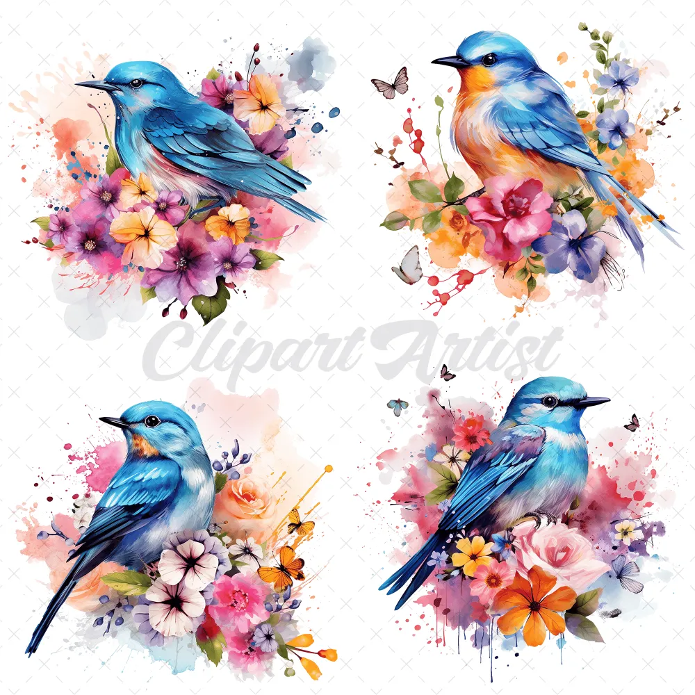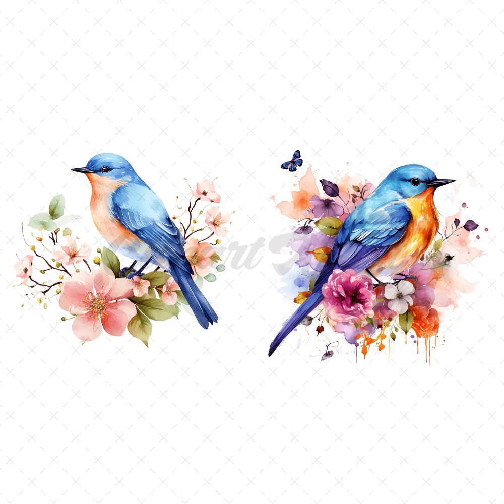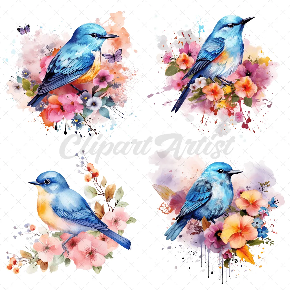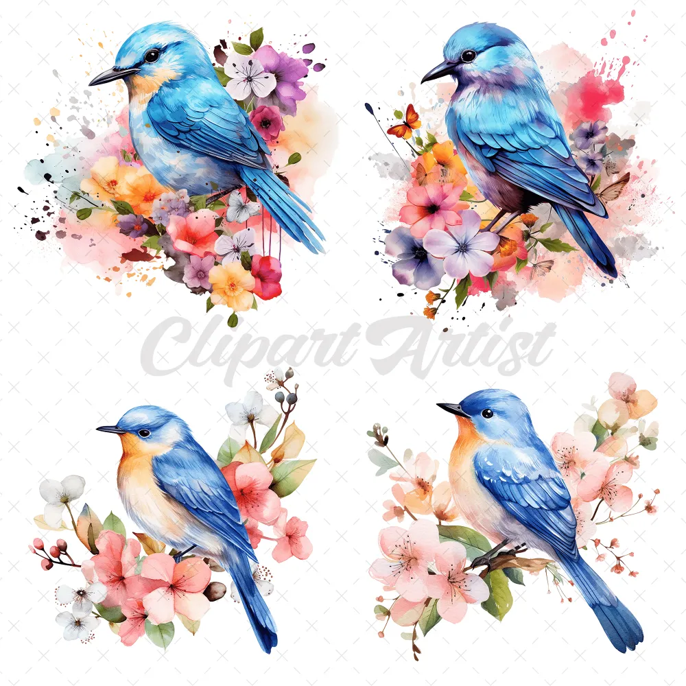18 High-Quality Floral Birds Clipart – Floral blue birds digital watercolor JPG instant download for commercial use – digital download