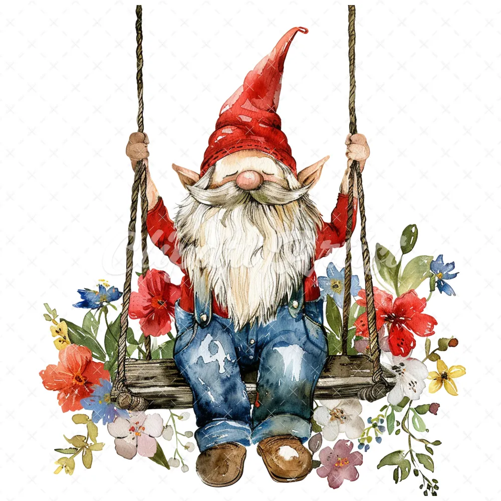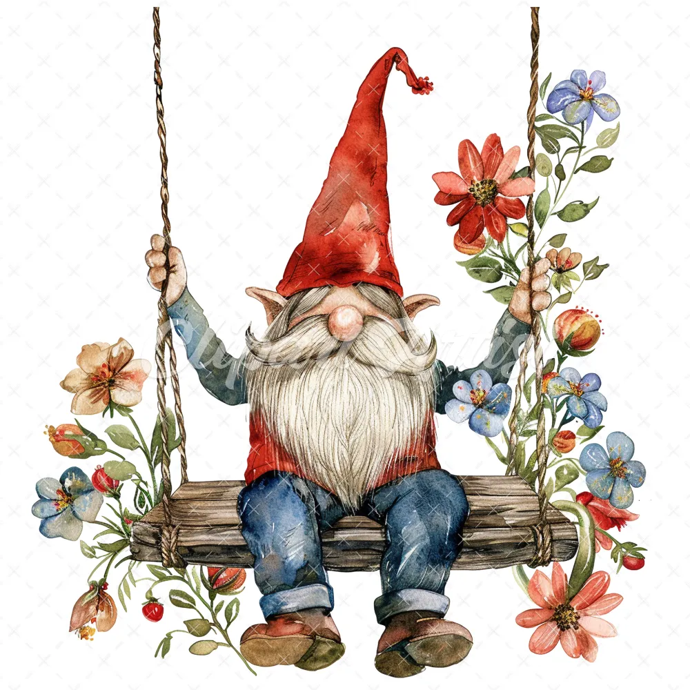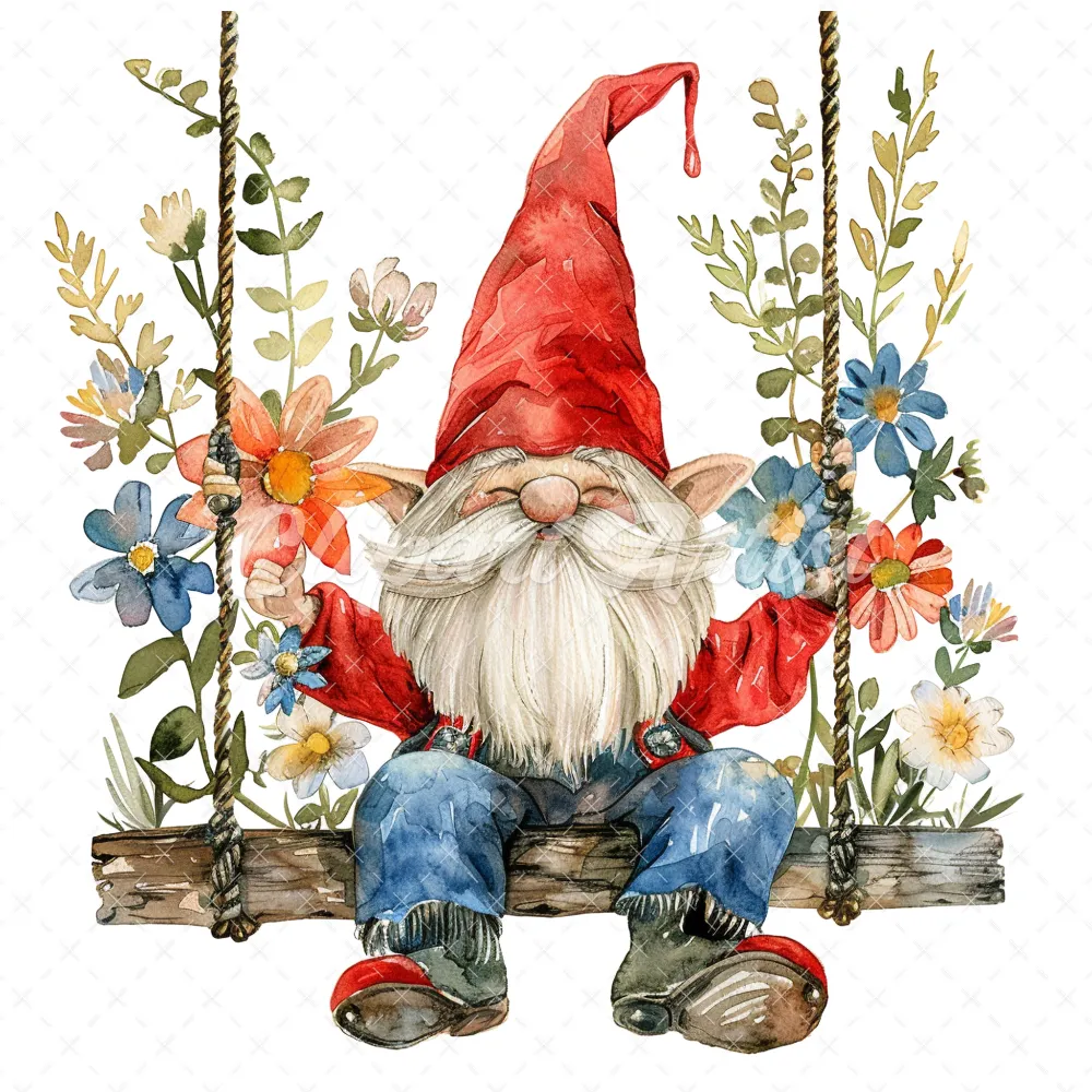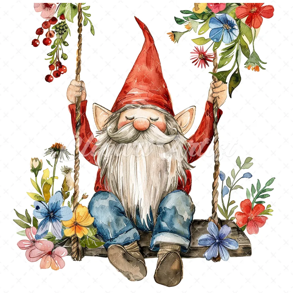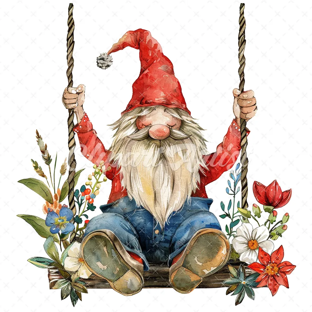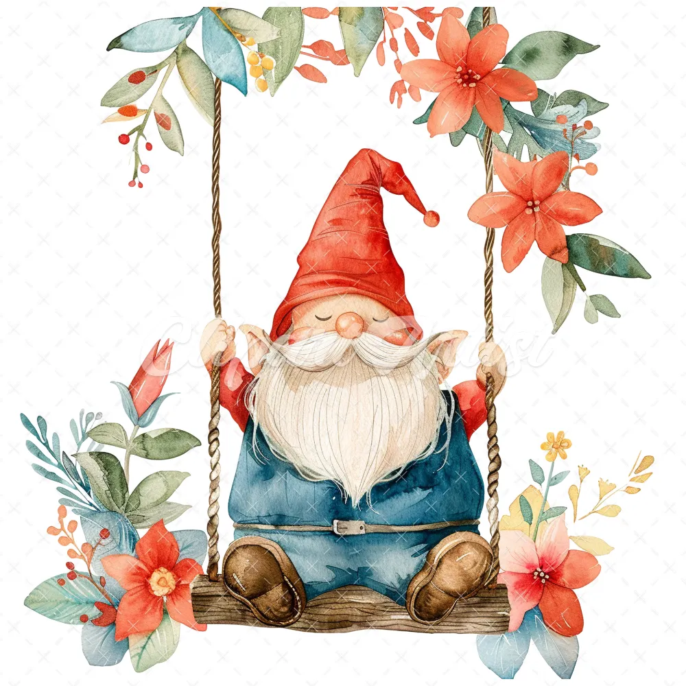 18 High-Quality Gnome on Swing Clipart – Gnome on swing wreath digital watercolor JPG instant download for commercial use – Digital download