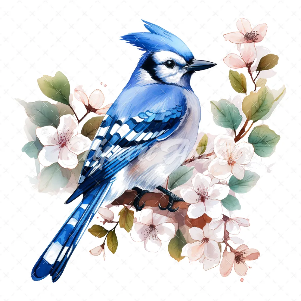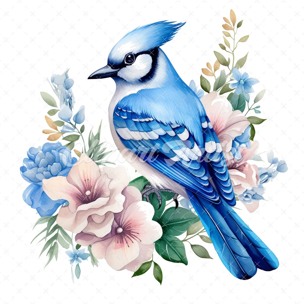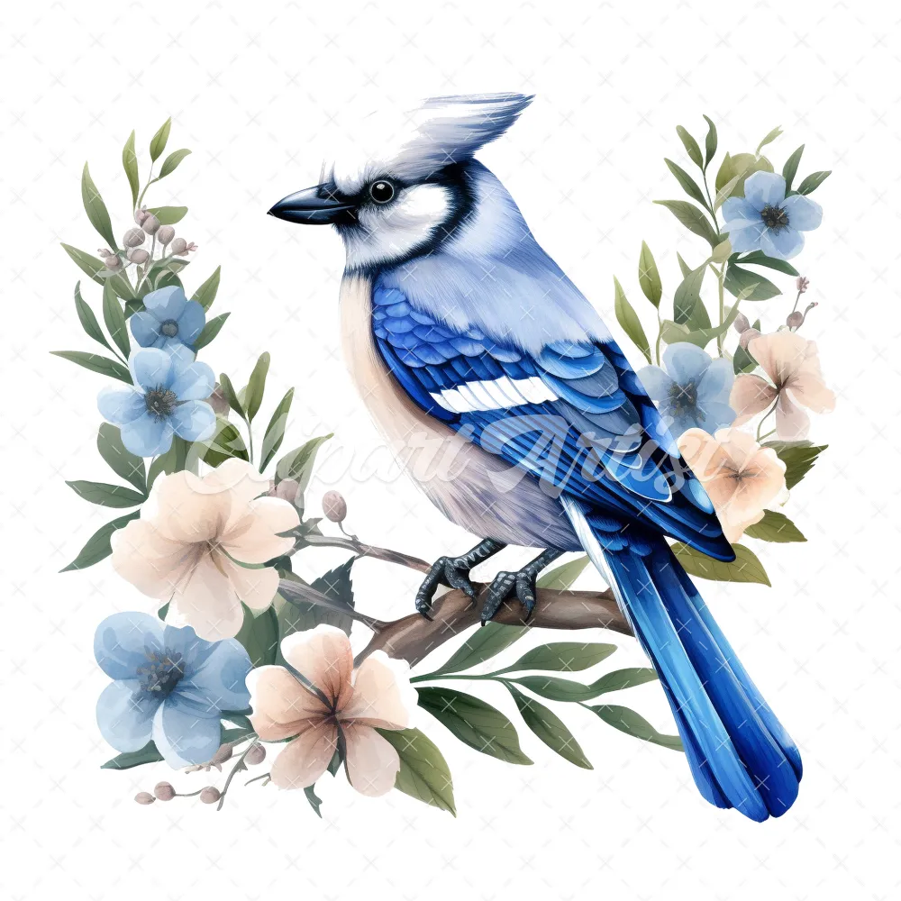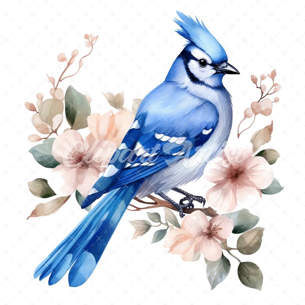 19 High-Quality Floral Blue Jay Clipart – Floral blue jay digital watercolor JPG instant download for commercial use – Digital download