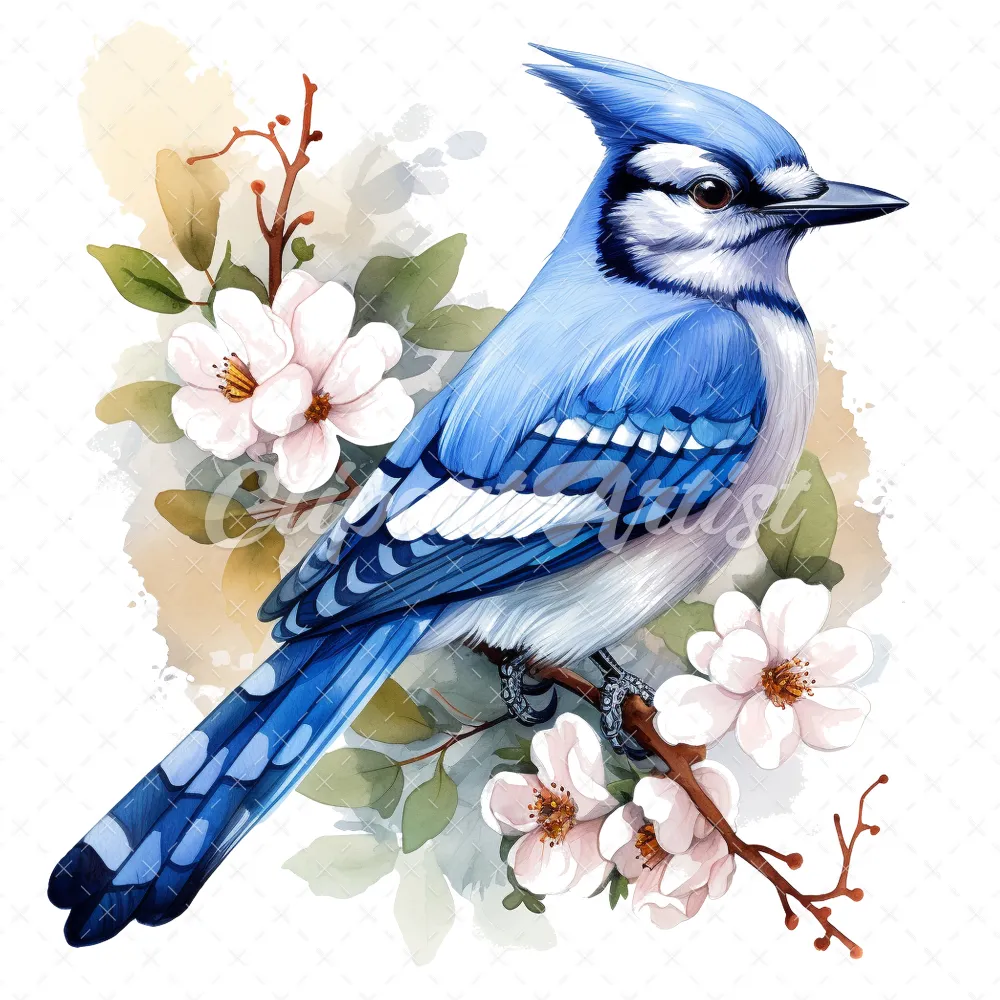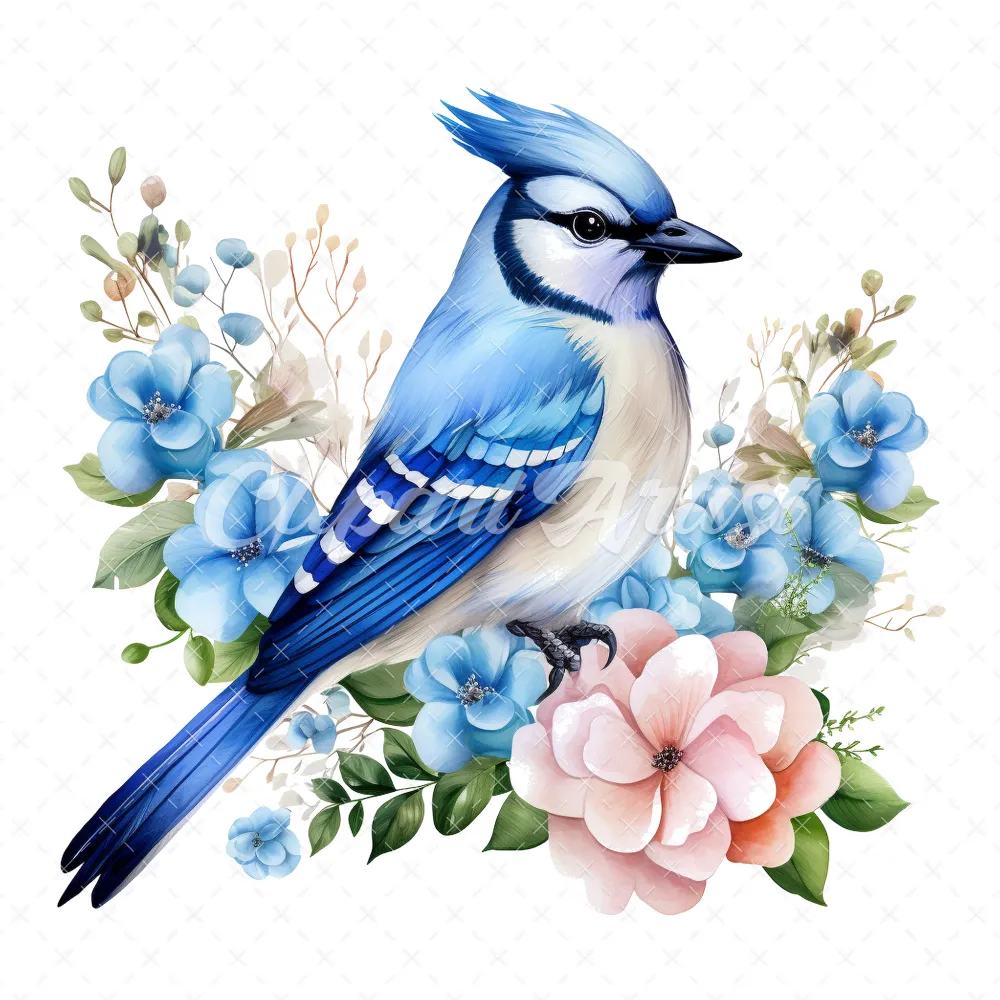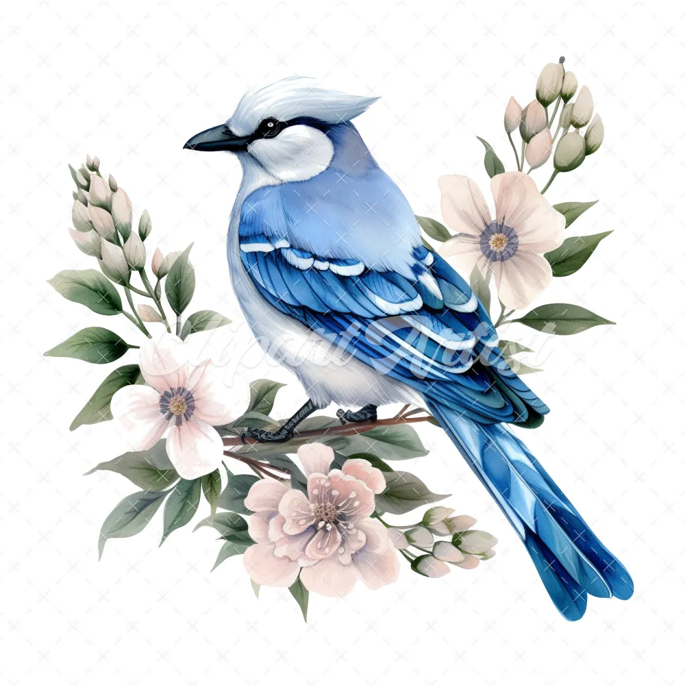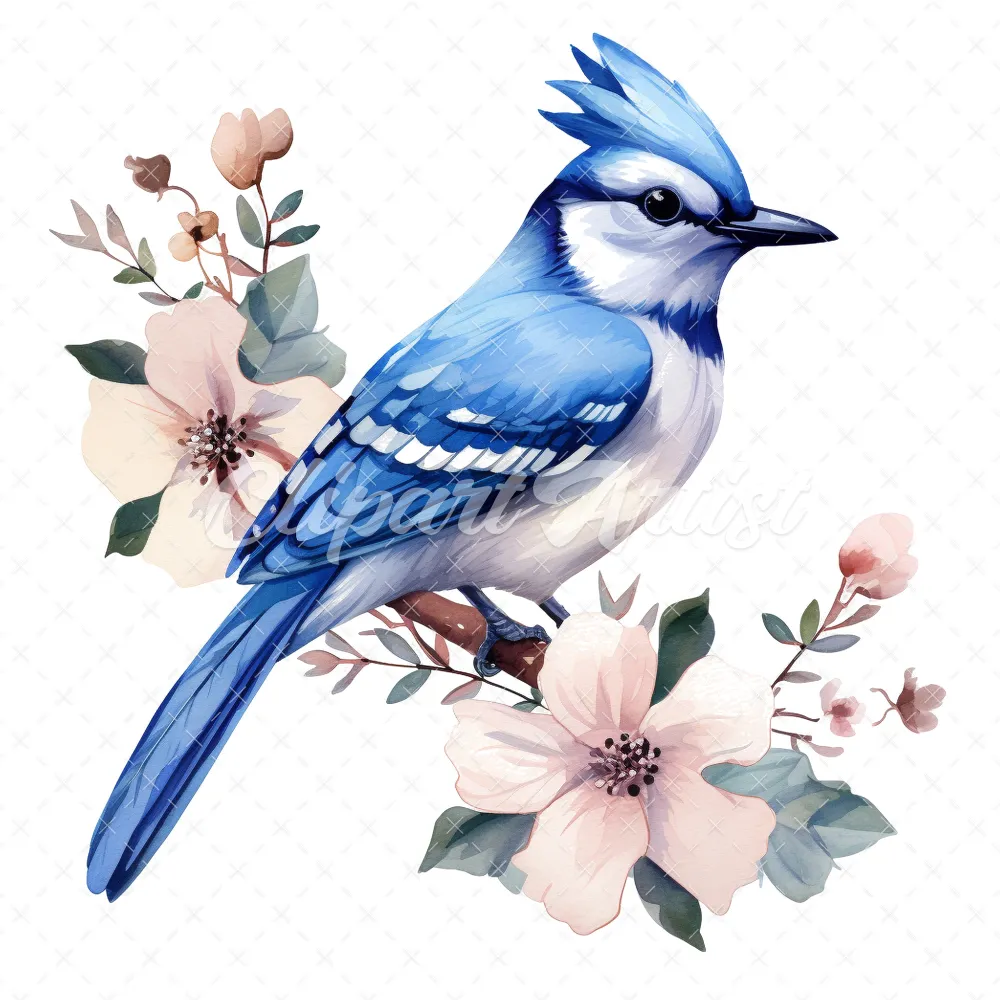 19 High-Quality Floral Blue Jay Clipart – Floral blue jay digital watercolor JPG instant download for commercial use – Digital download
