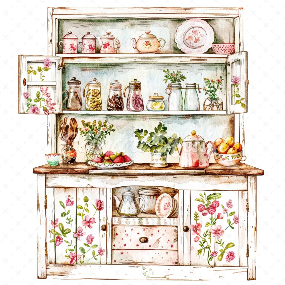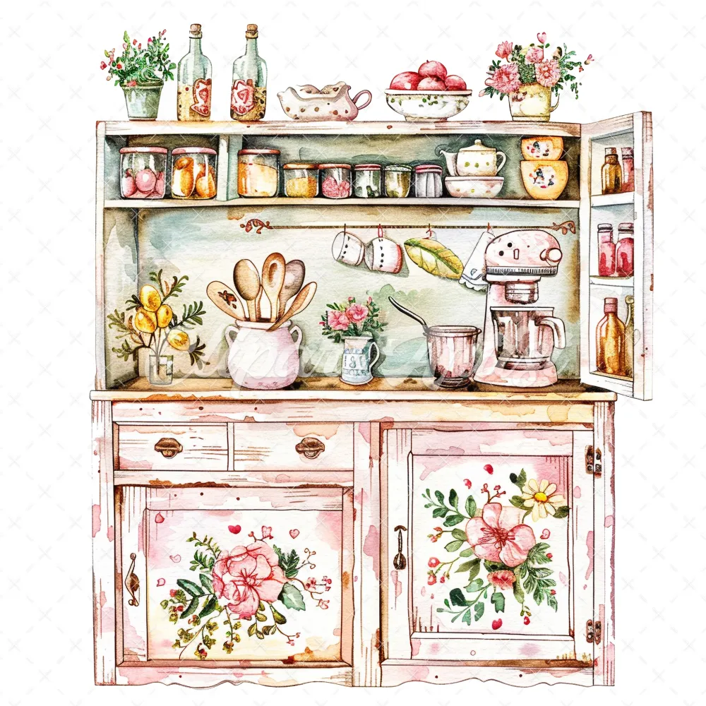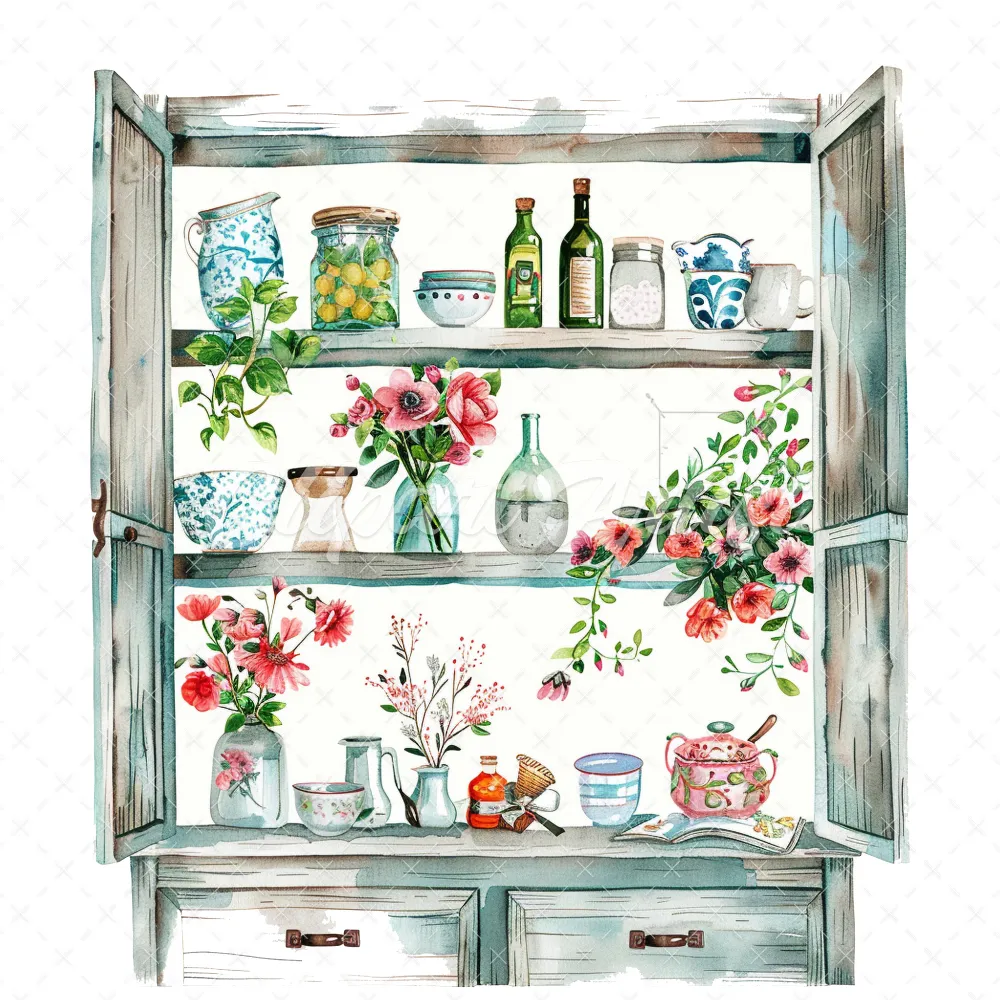 19 High-Quality Floral Kitchen Cupboard Clipart – Kitchen digital watercolor JPG instant download for commercial use – Digital download