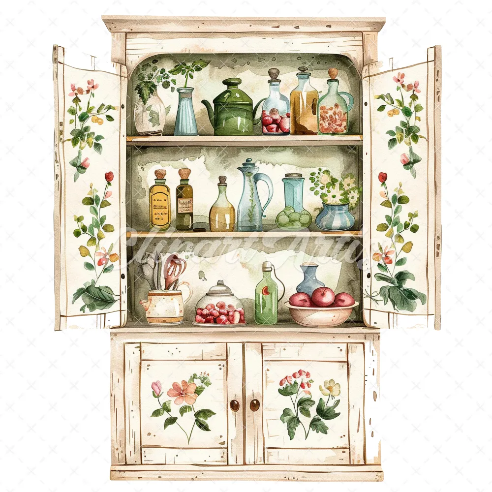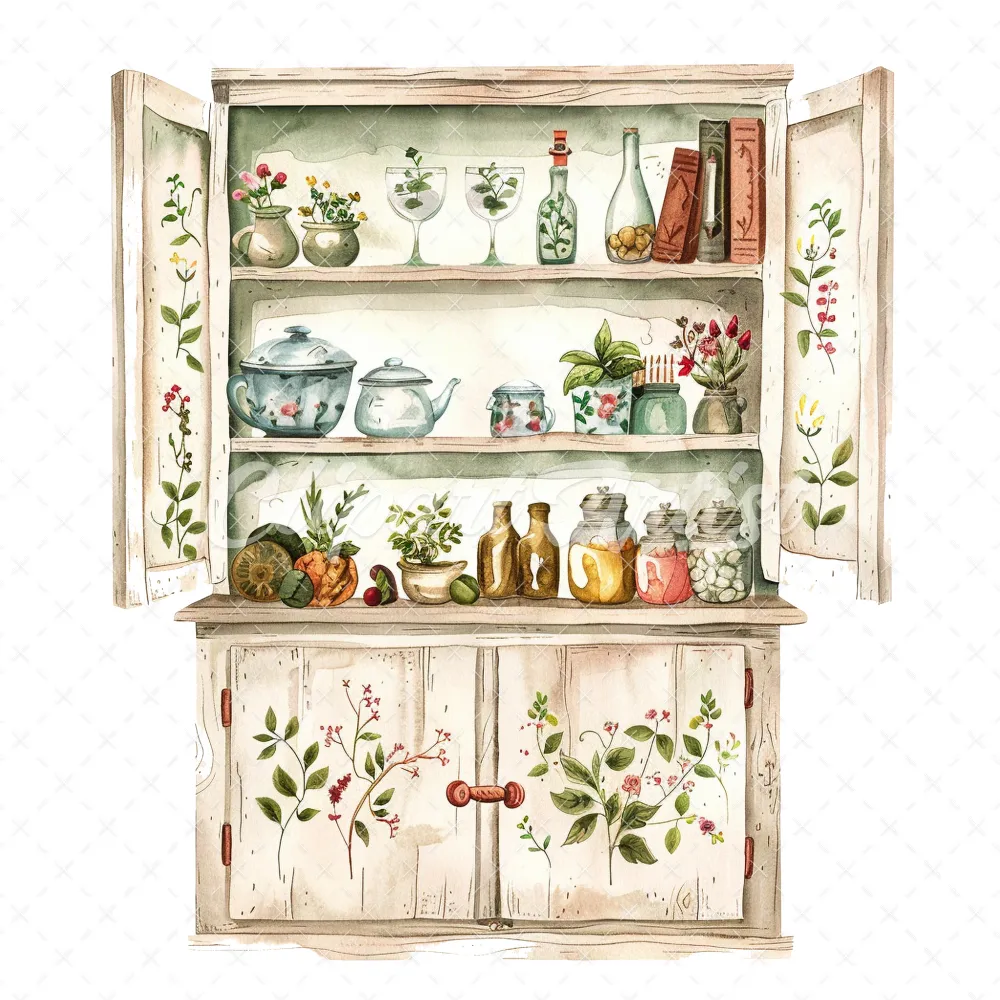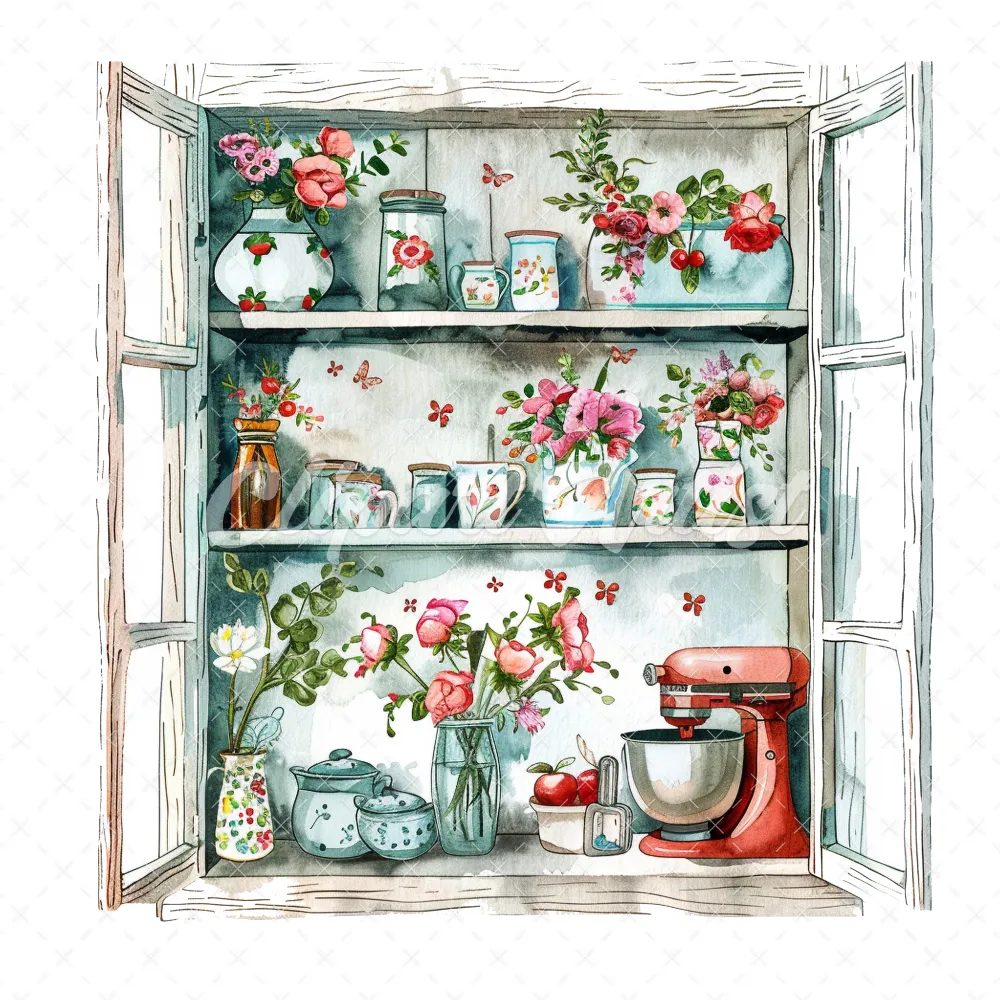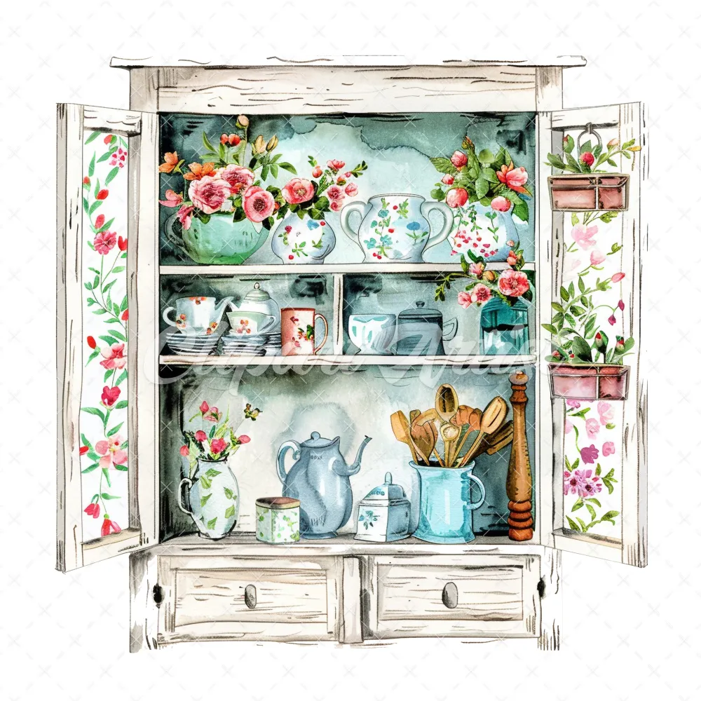 19 High-Quality Floral Kitchen Cupboard Clipart – Kitchen digital watercolor JPG instant download for commercial use – Digital download