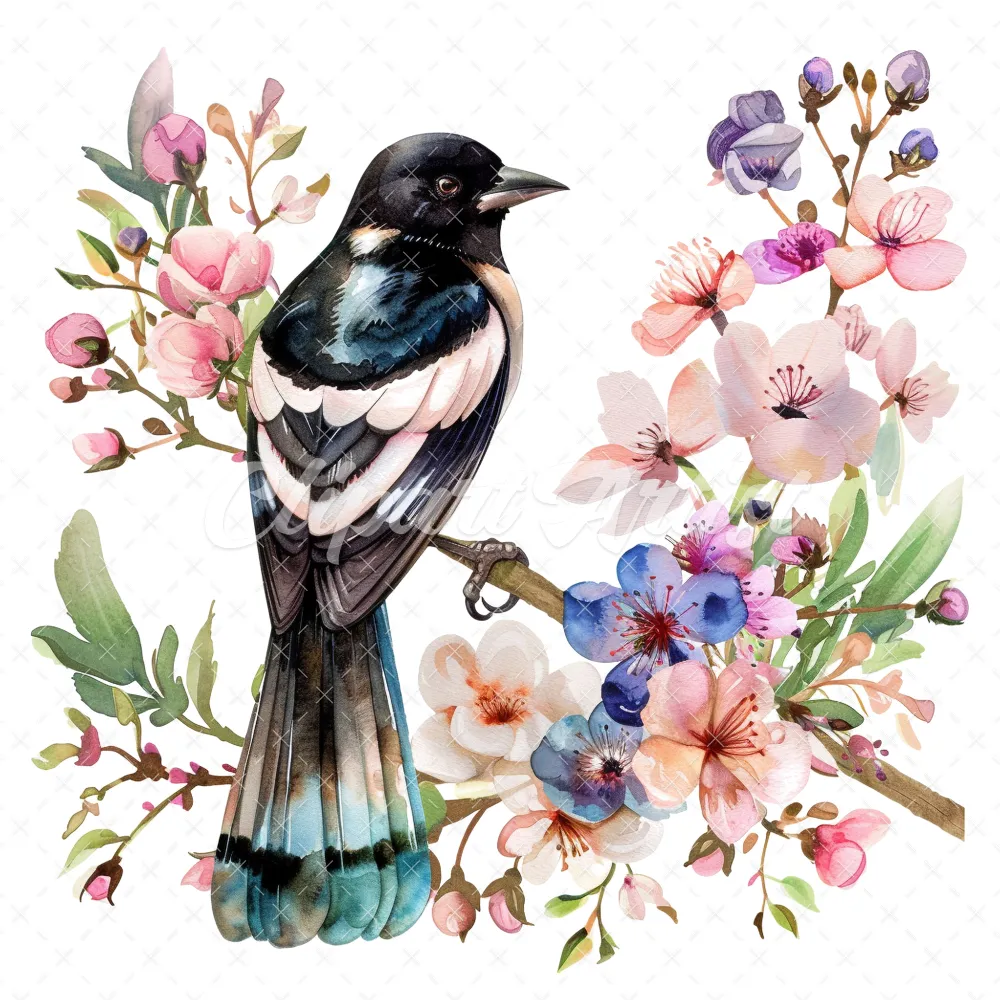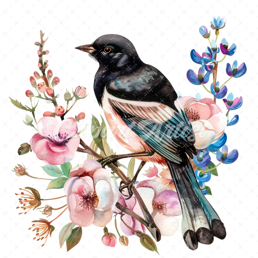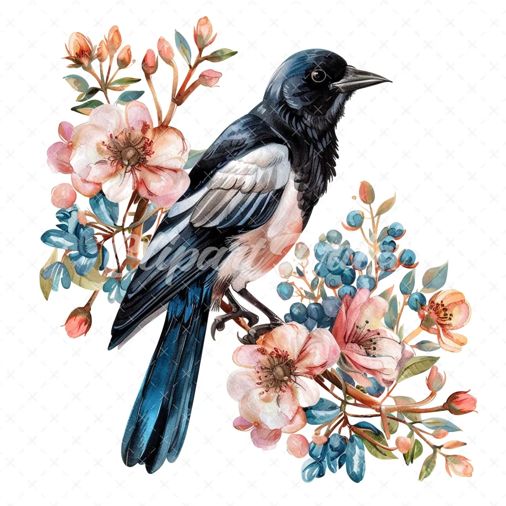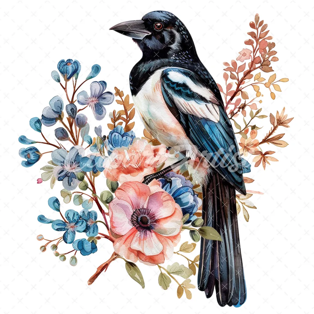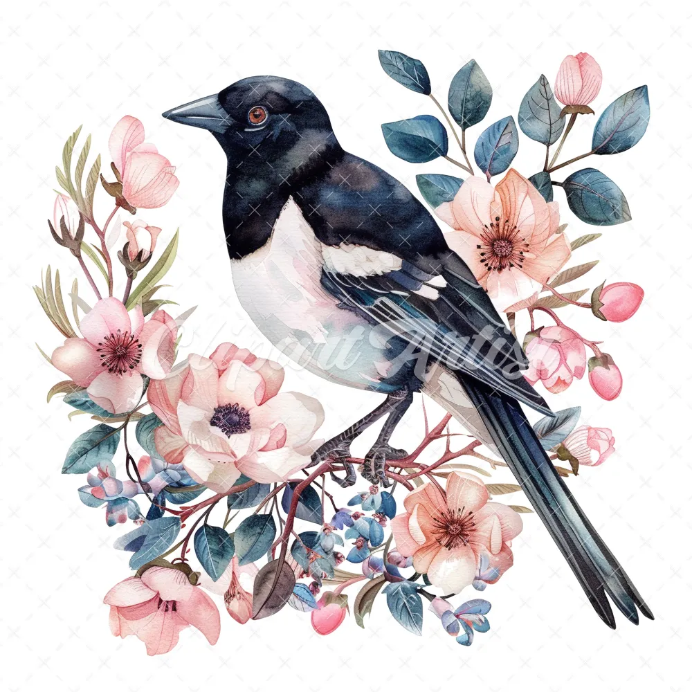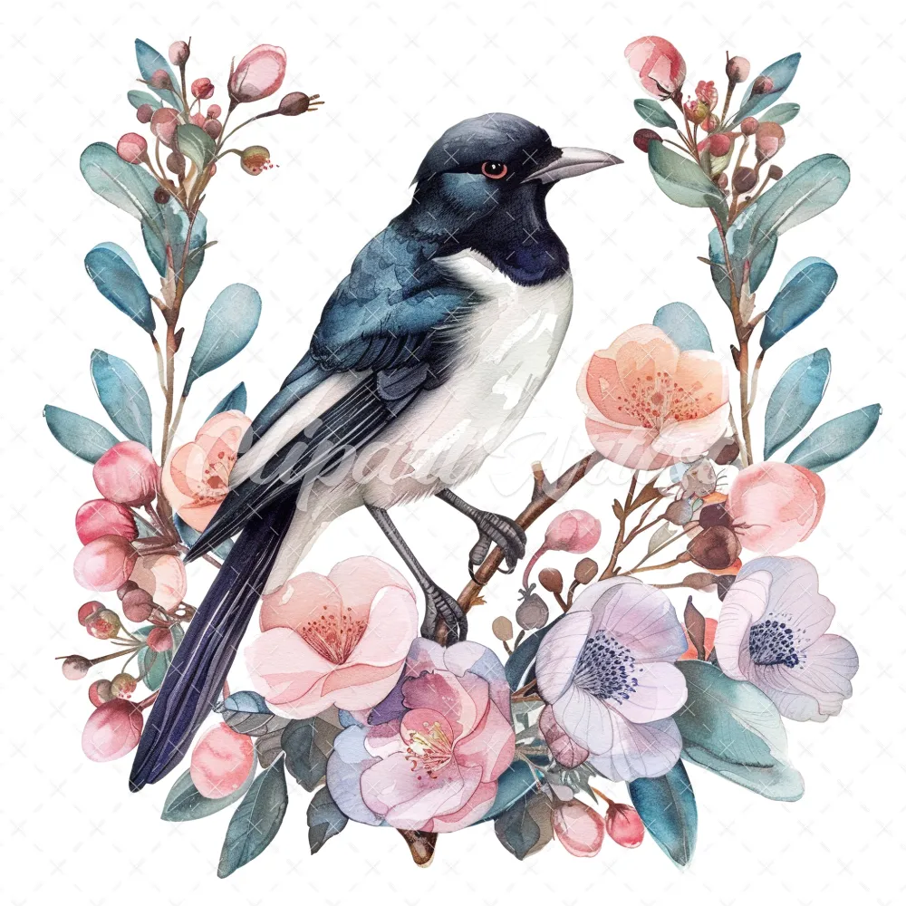 19 High-Quality Floral Magpie Clipart – Floral magpie digital watercolor JPG instant download for commercial use – Digital download