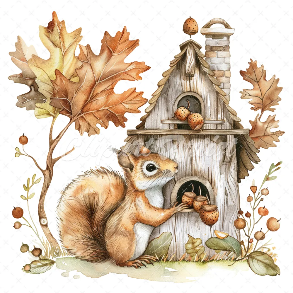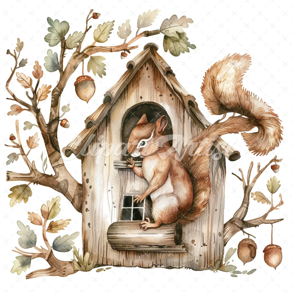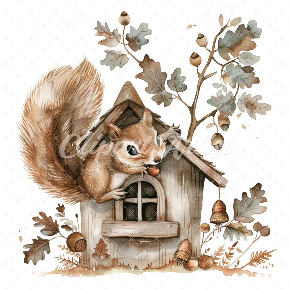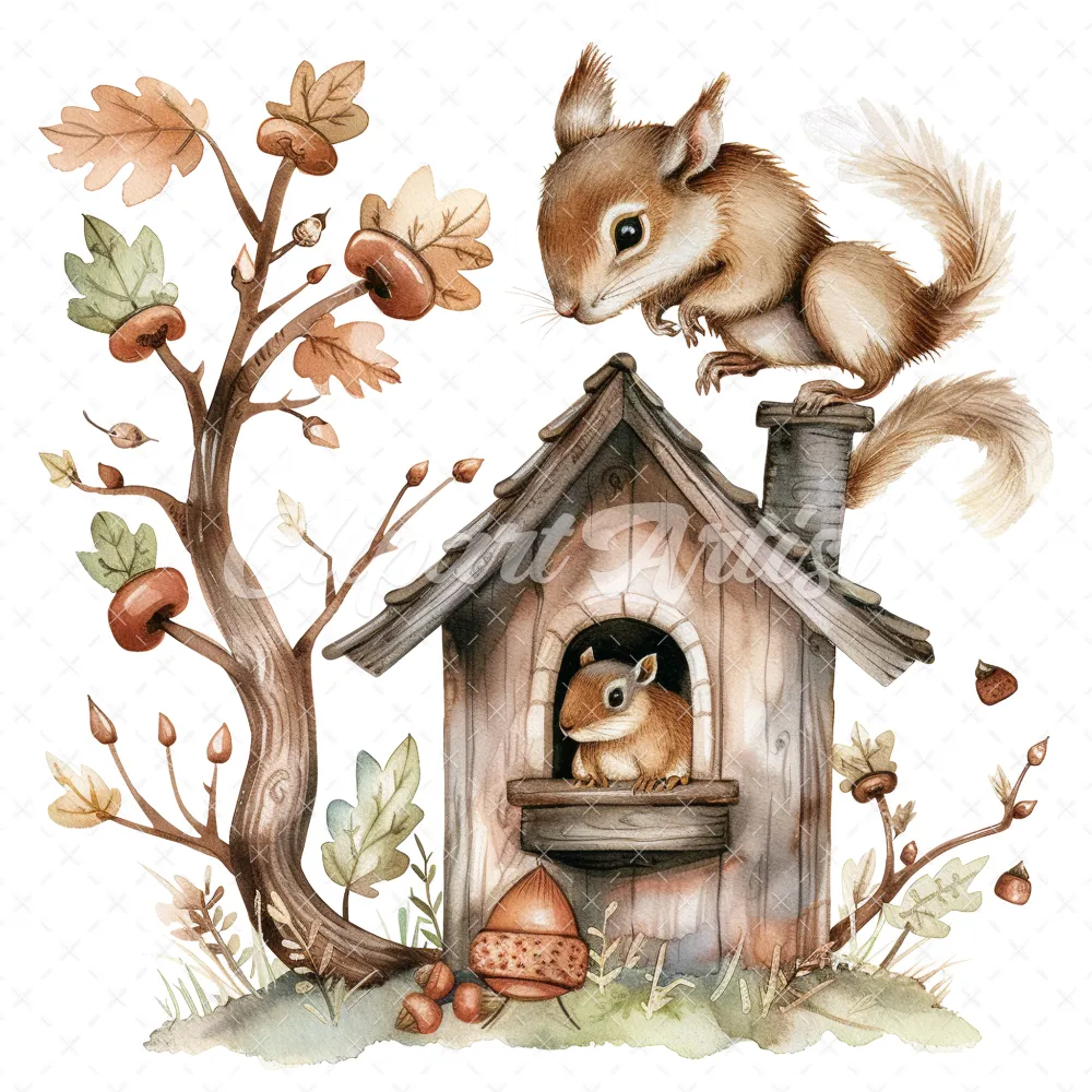 19 High-Quality Squirrel Oak Acorn House Clipart – Squirrel digital watercolor JPG instant download for commercial use – Digital download