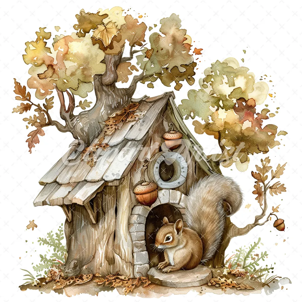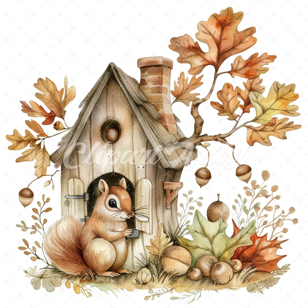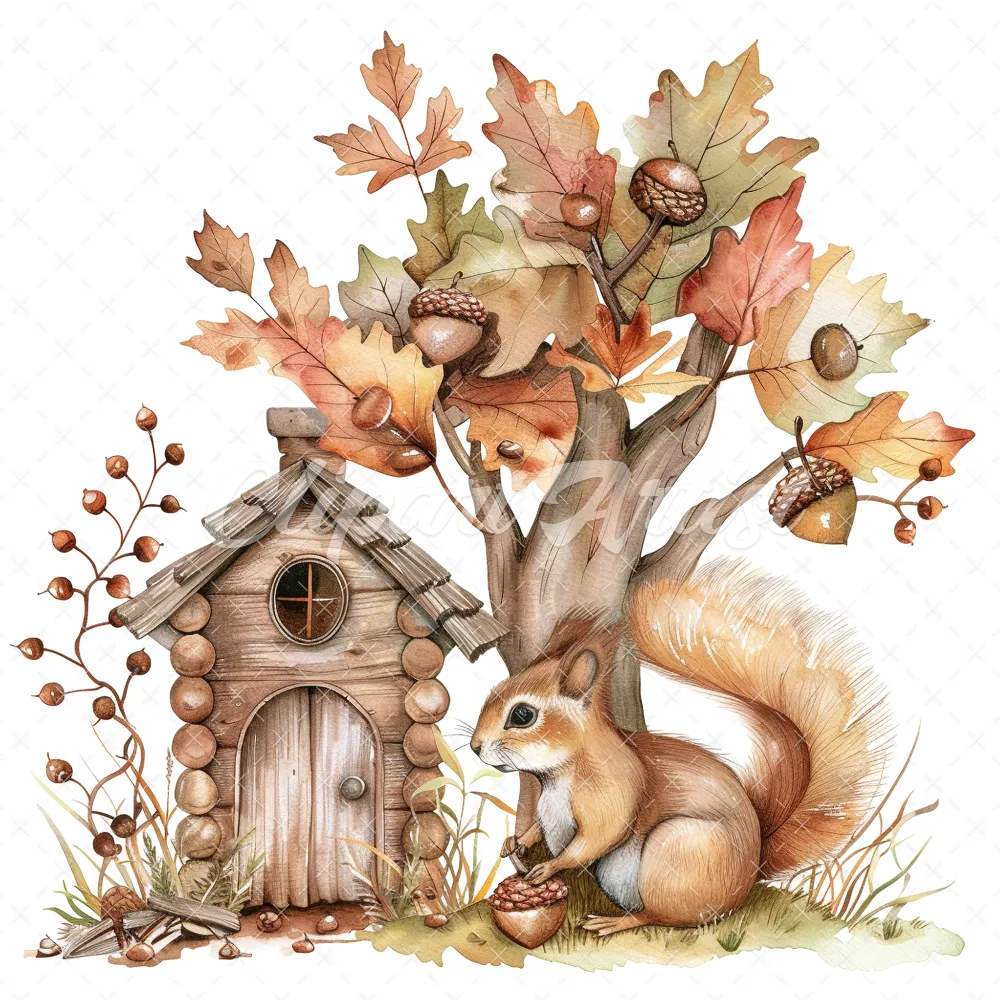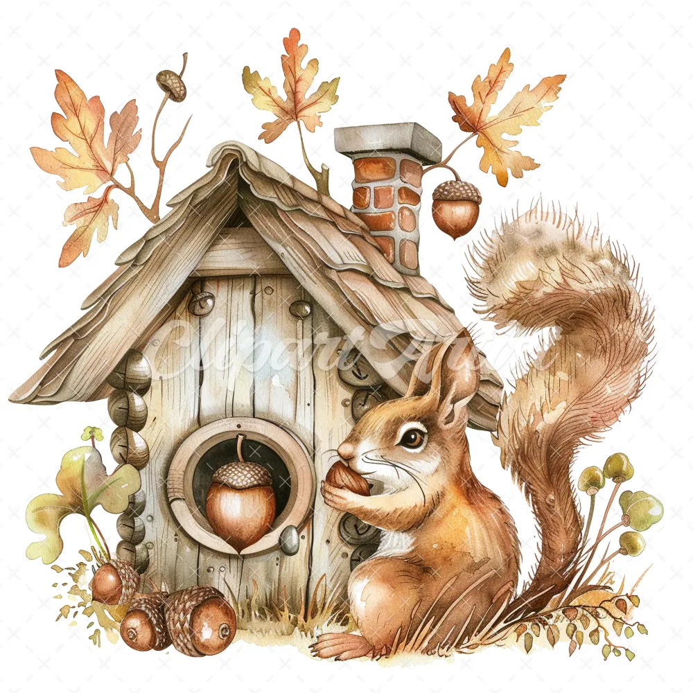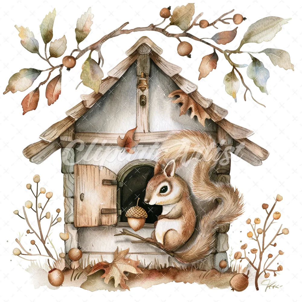 19 High-Quality Squirrel Oak Acorn House Clipart – Squirrel digital watercolor JPG instant download for commercial use – Digital download