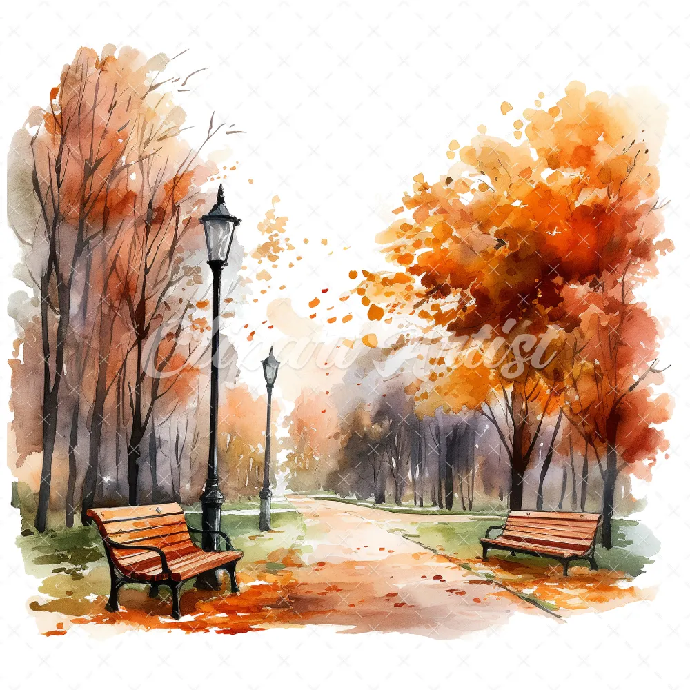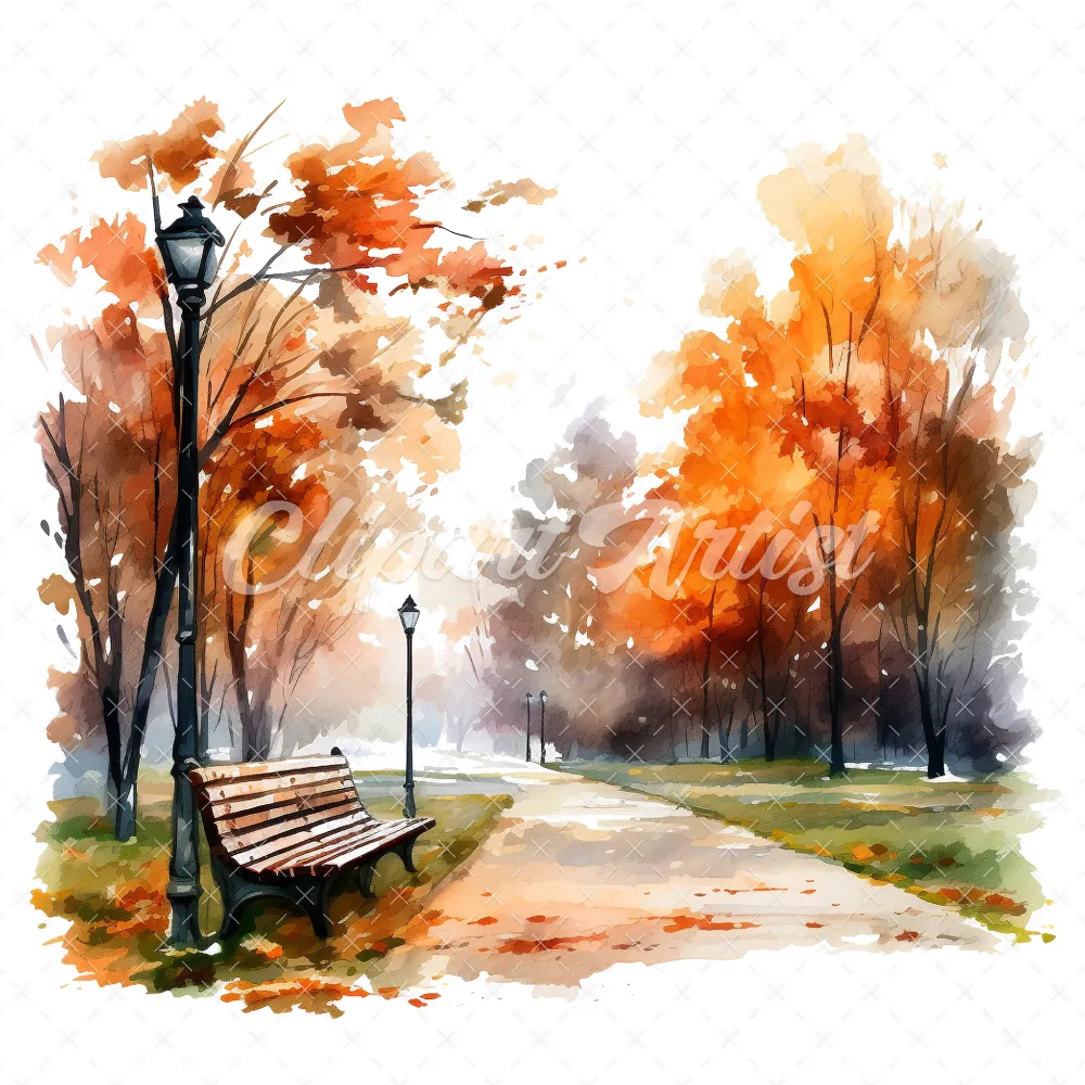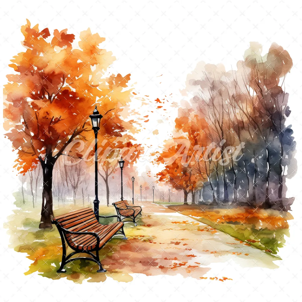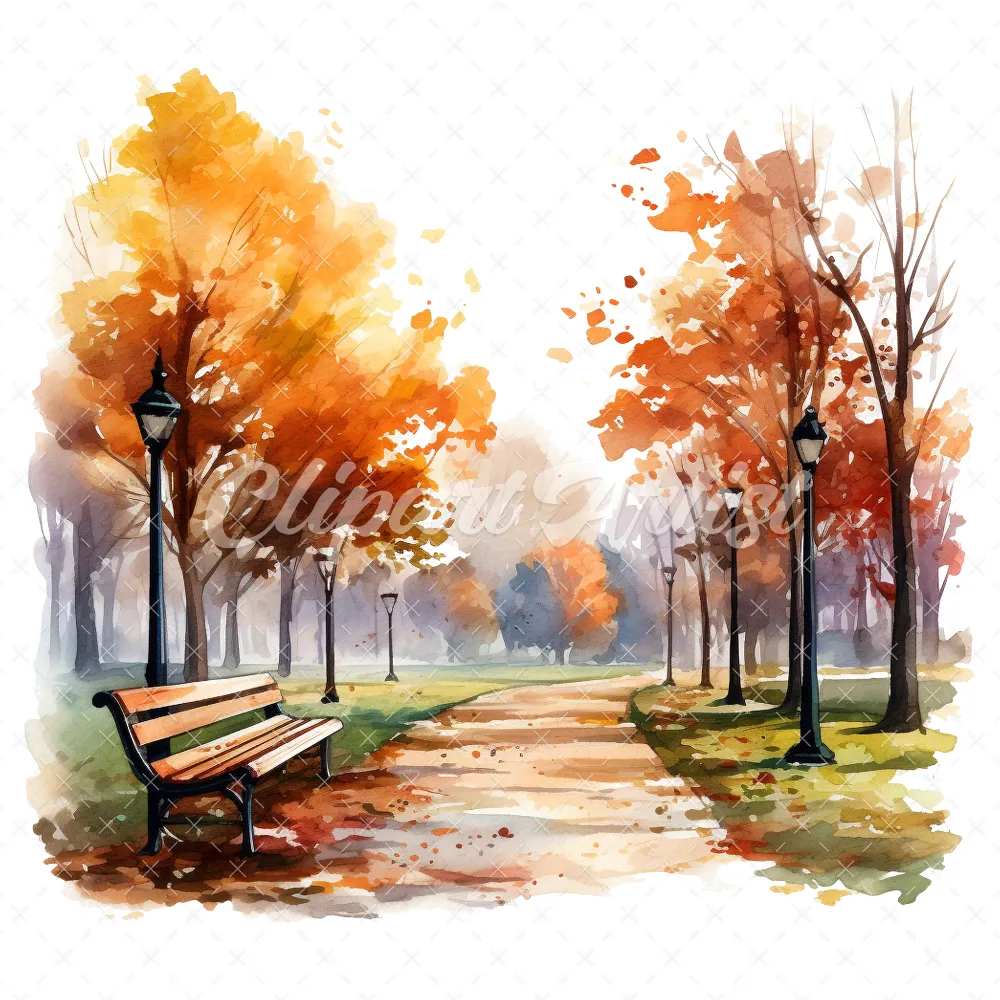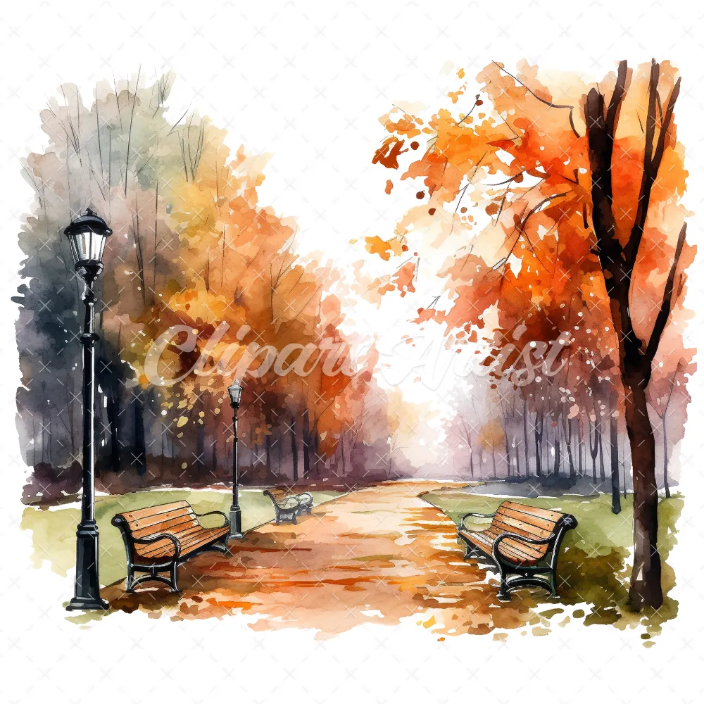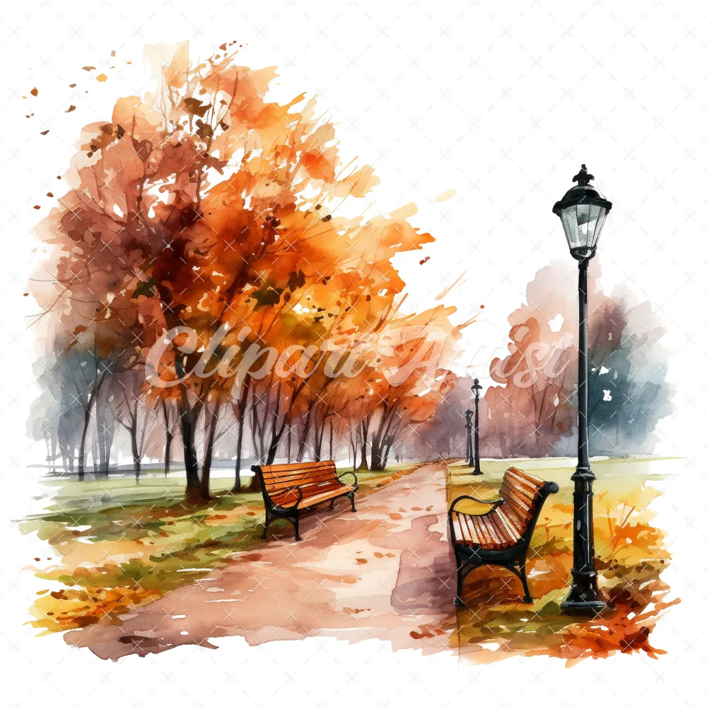 20 High-Quality Autumn Park Clipart – Autumn park digital watercolor JPG instant download for commercial use – Digital download