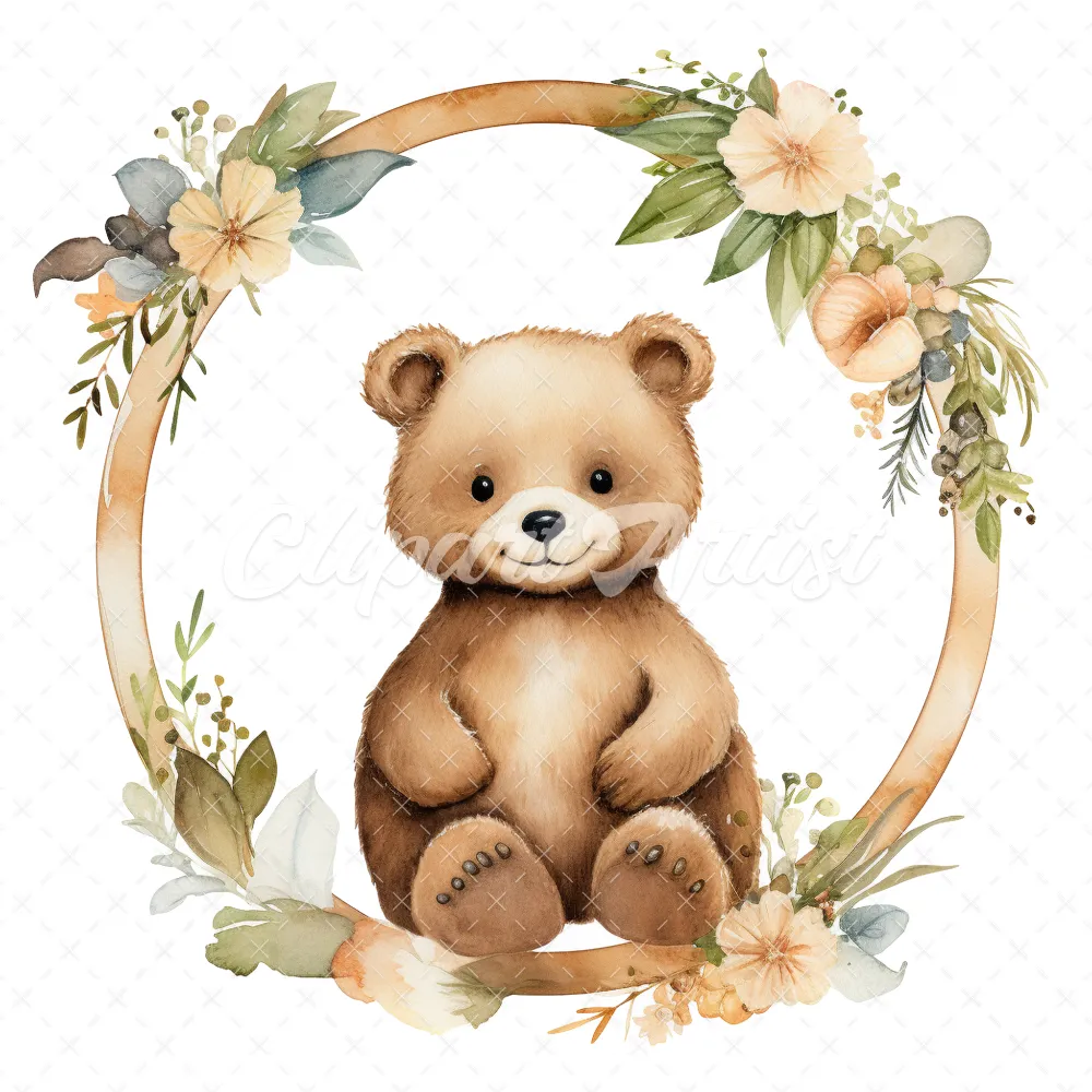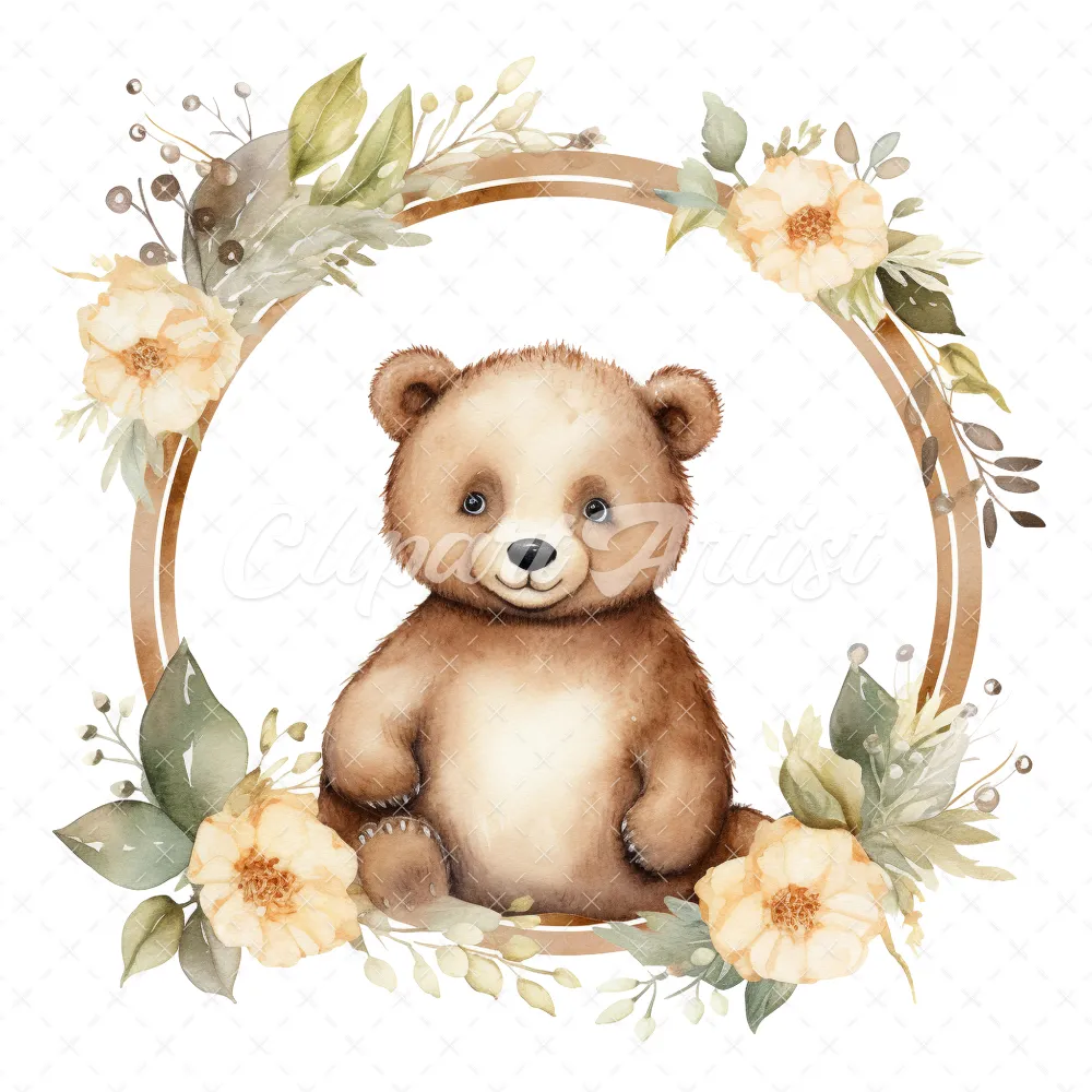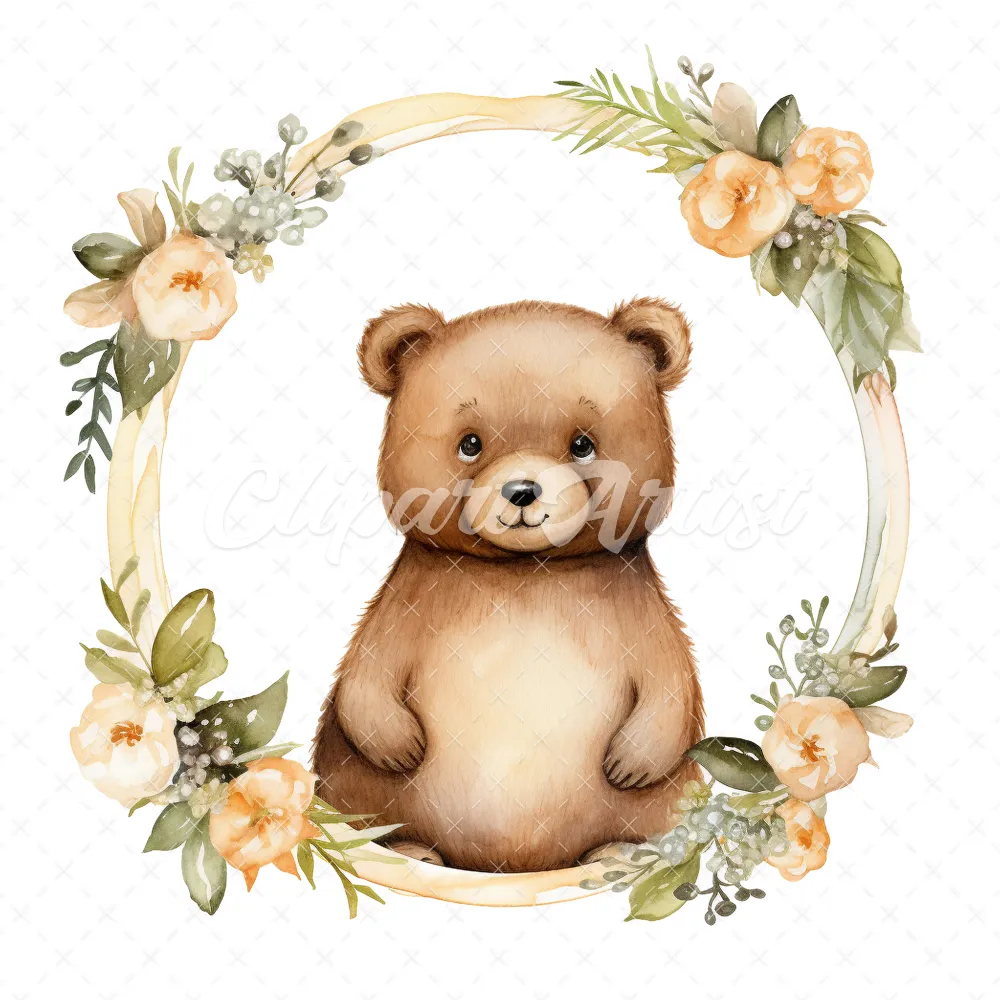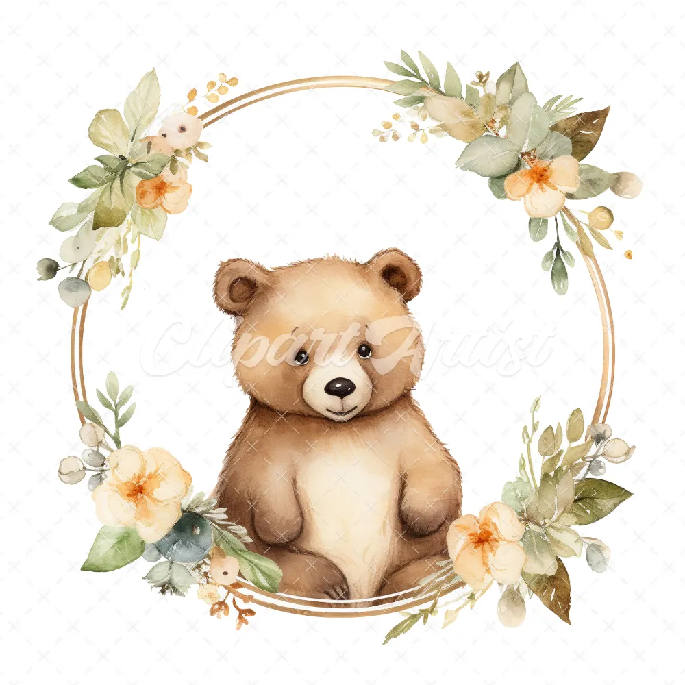 20 High-Quality Bear In Round Frame Rack Clipart – Bear frame digital watercolor JPG instant download for commercial use – Digital download
