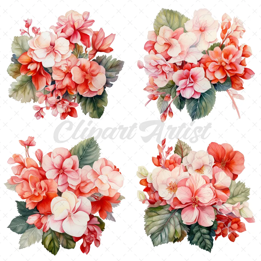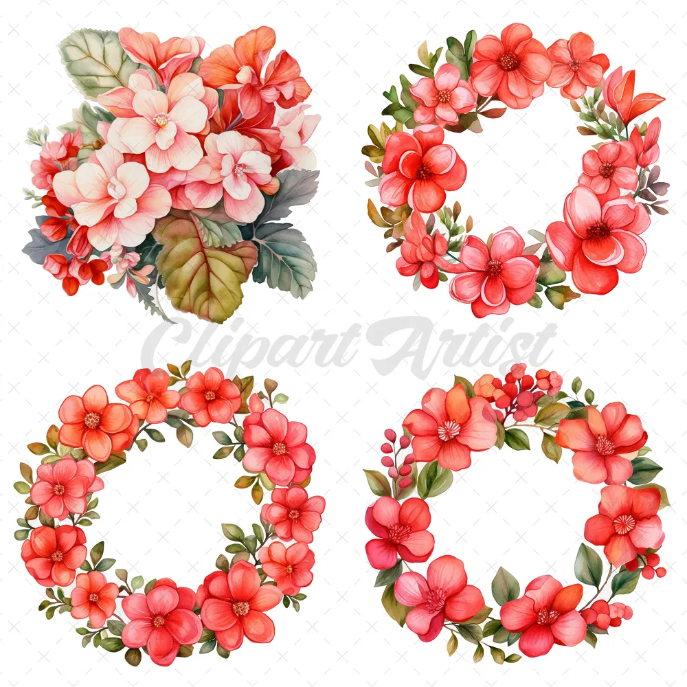 20 High-Quality Begonias Clipart – Pink red begonias digital watercolor wreath JPG instant download for commercial use – Digital download