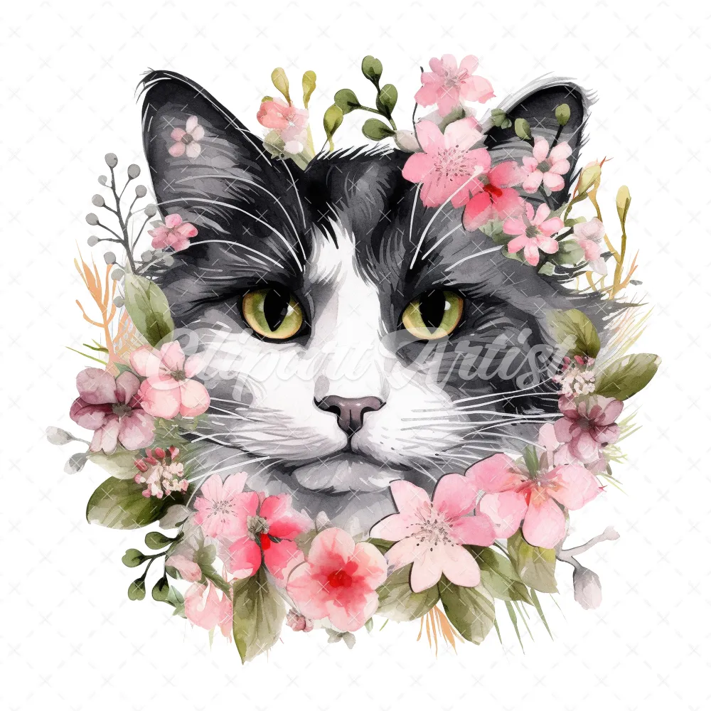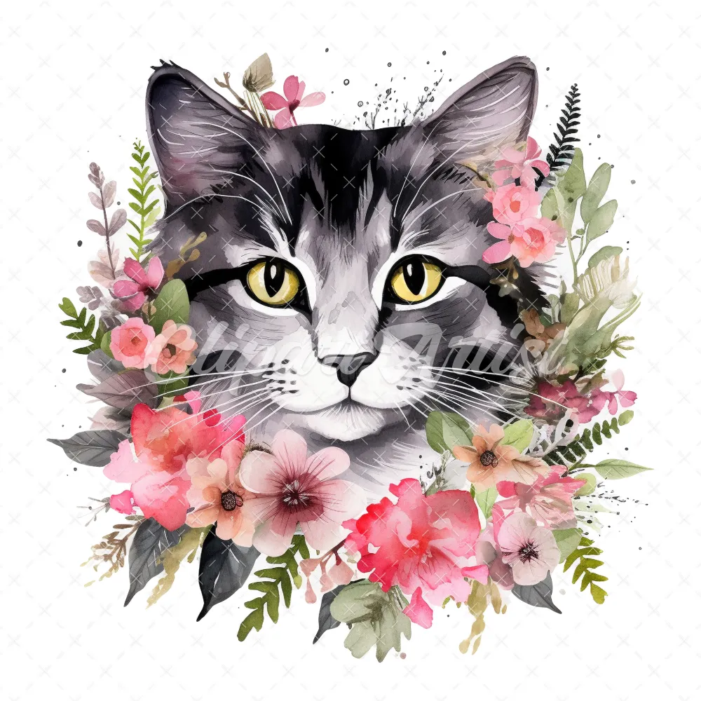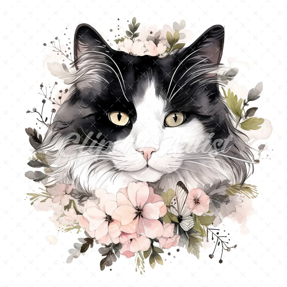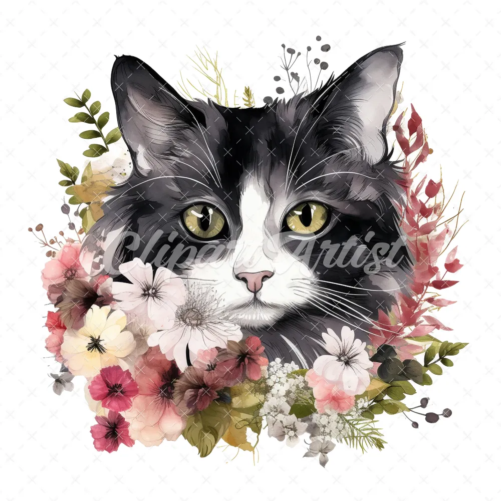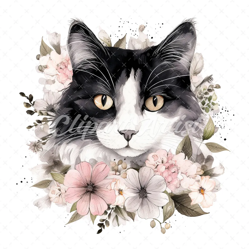 20 High-Quality Black and White Floral Cats Clipart – Cats digital watercolor JPG instant download for commercial use – Digital download