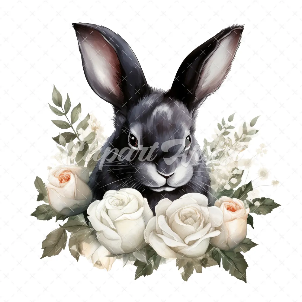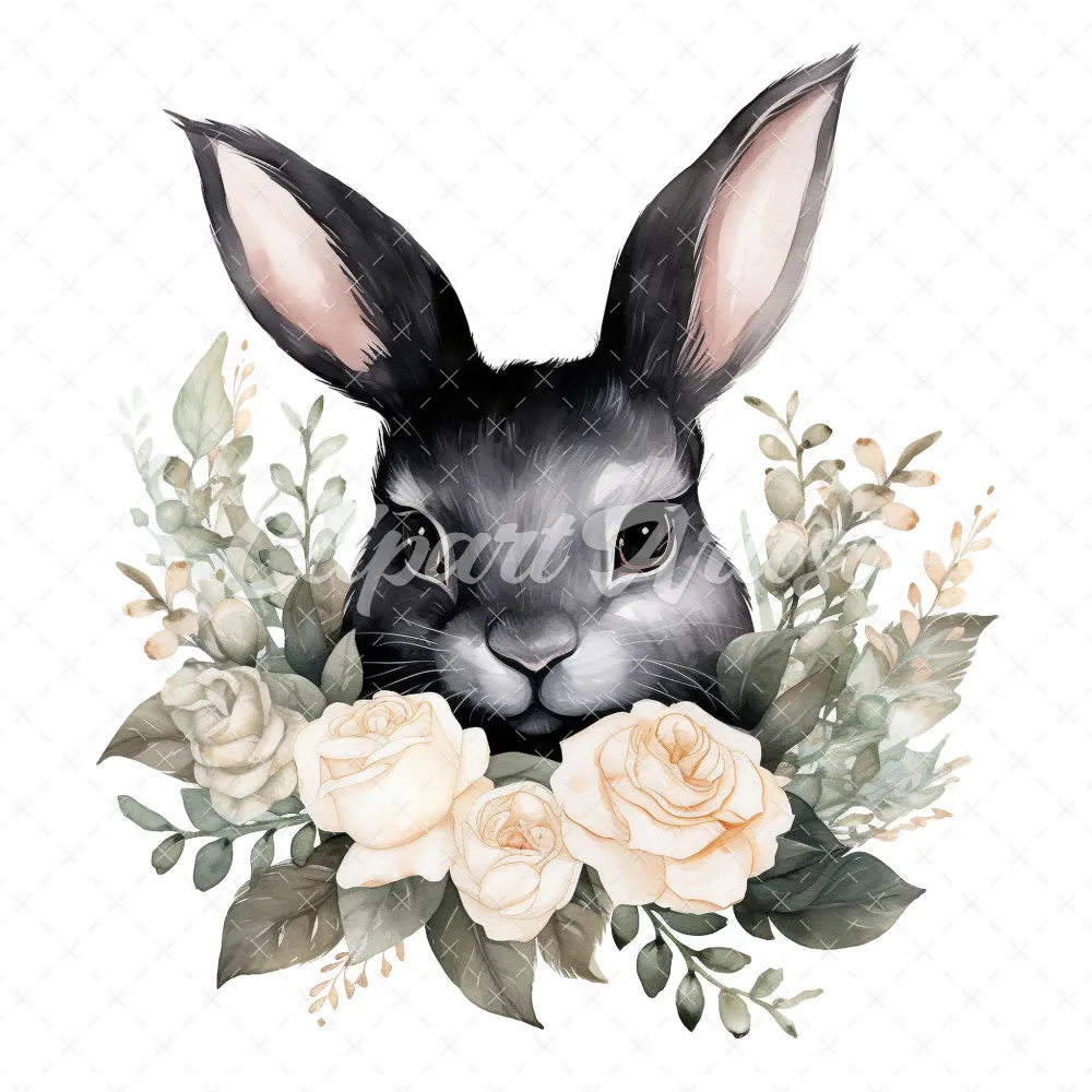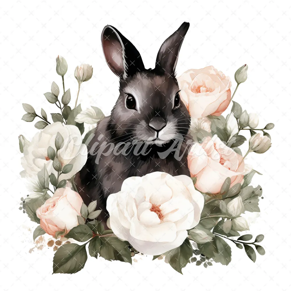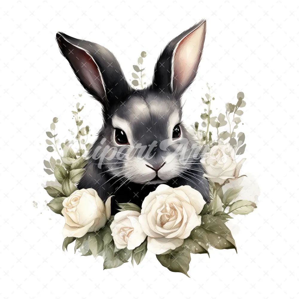 20 High-Quality Black Bunny With White Roses Clipart – Bunny digital watercolor JPG instant download for commercial use – Digital download