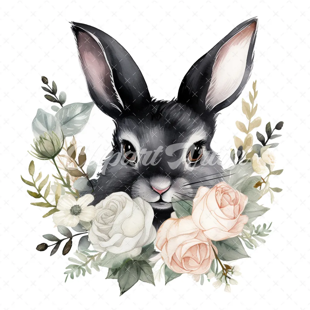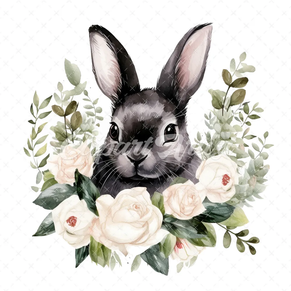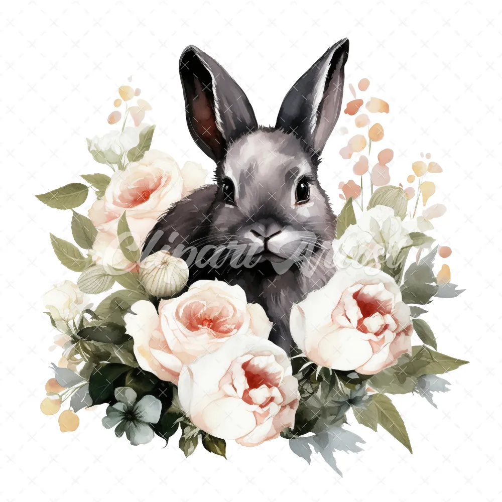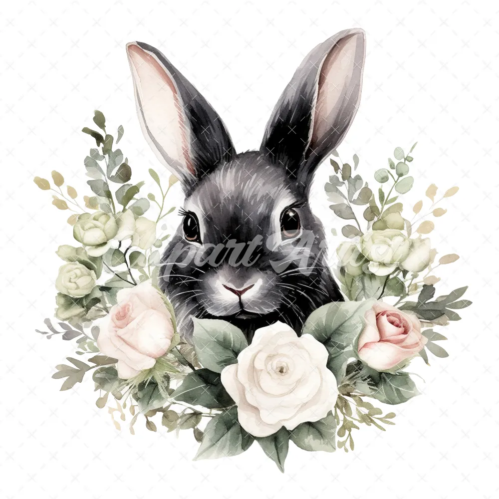 20 High-Quality Black Bunny With White Roses Clipart – Bunny digital watercolor JPG instant download for commercial use – Digital download