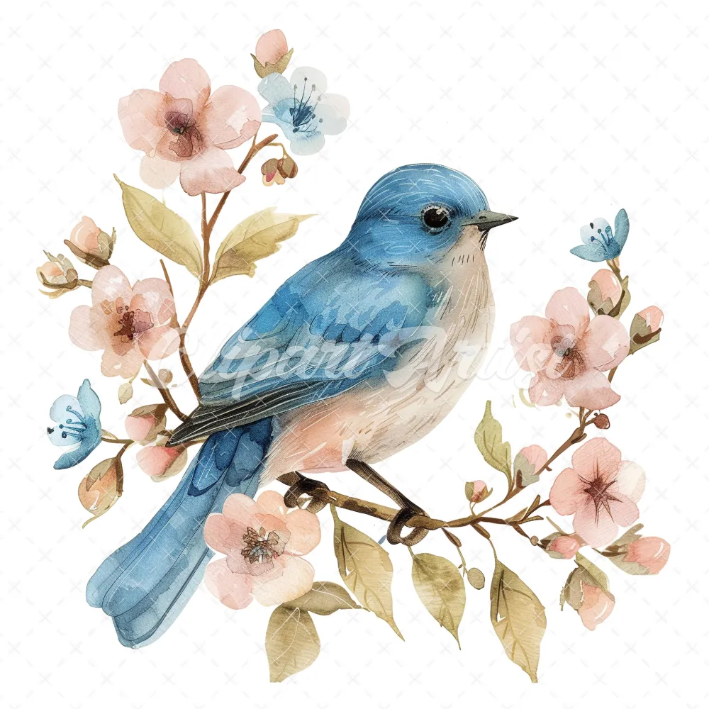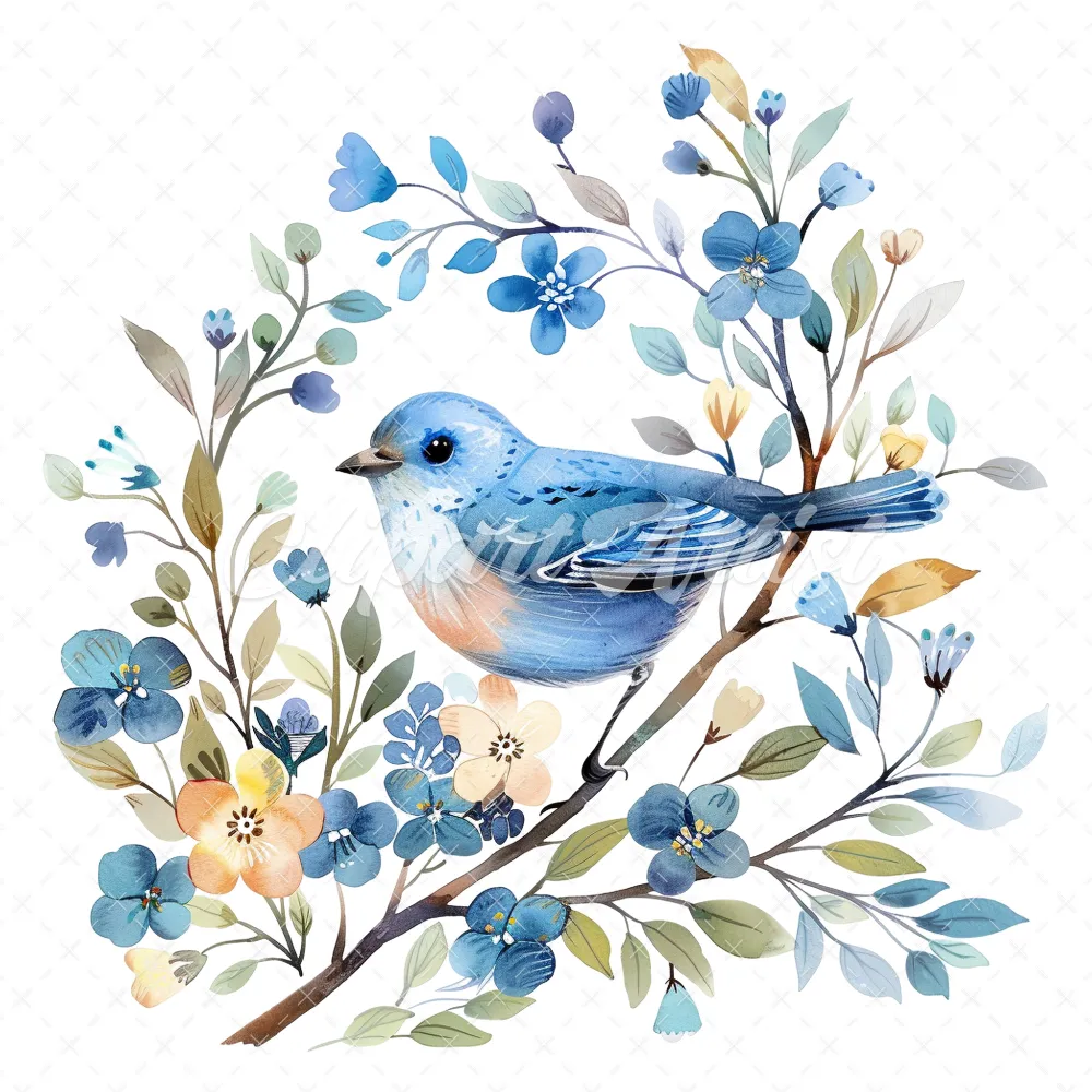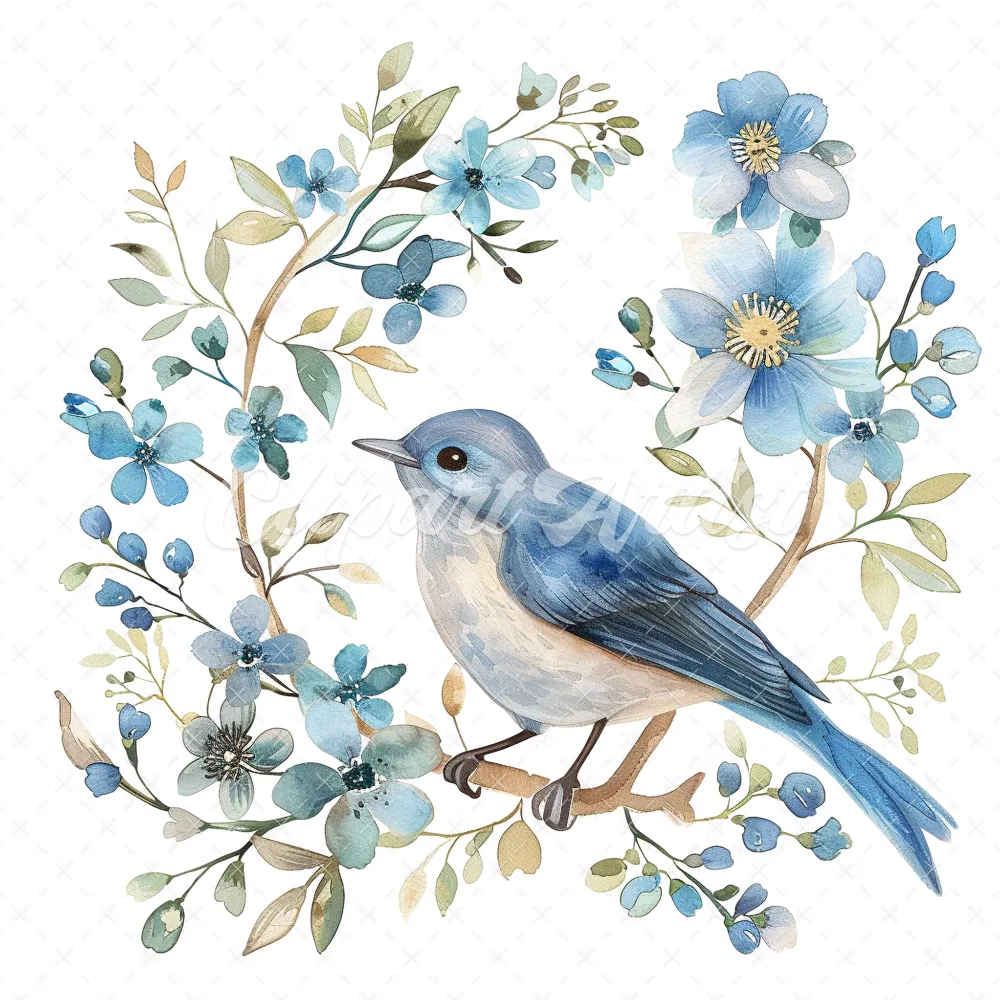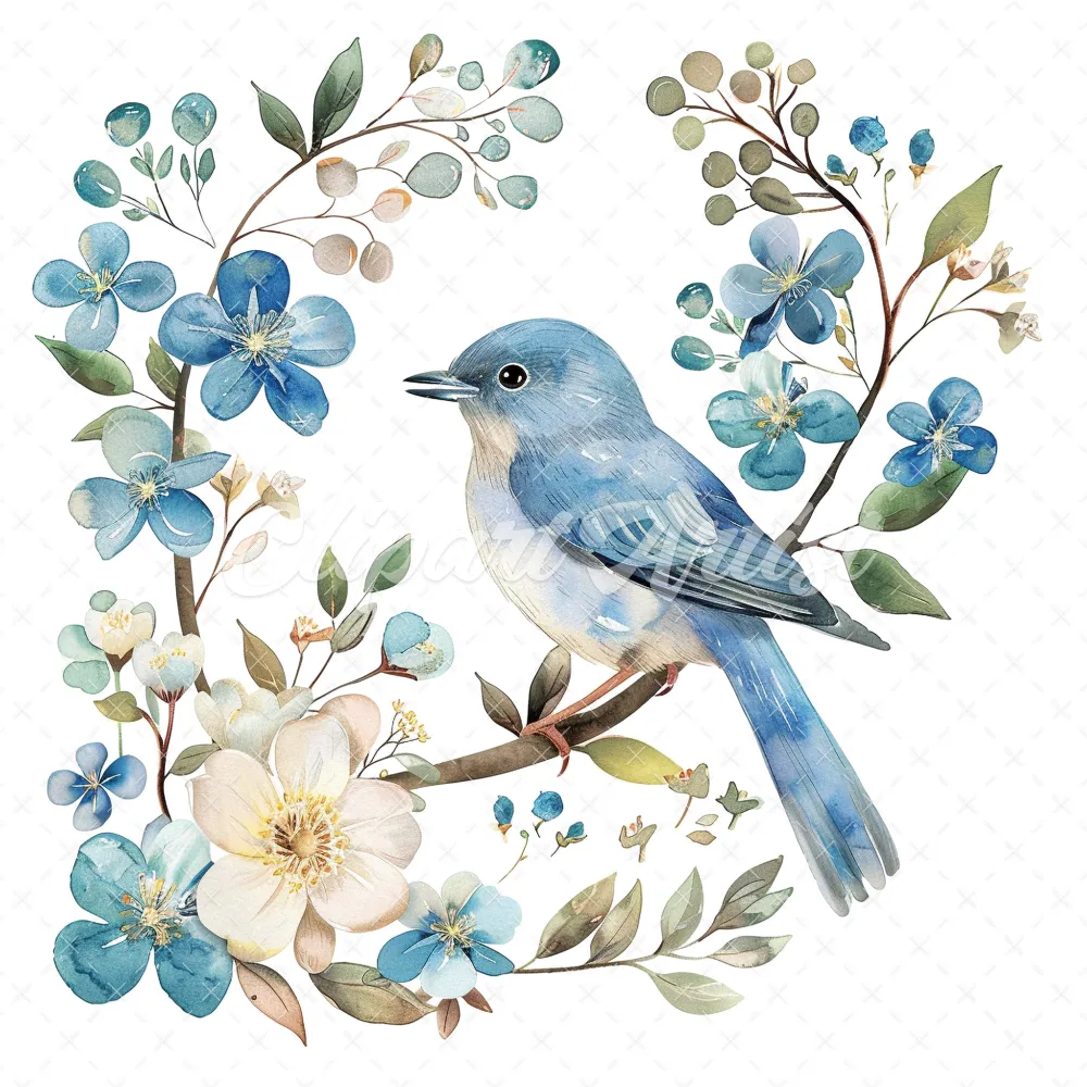 20 High-Quality Blue Bird Floral Clipart – Blue bird floral digital watercolor JPG instant download for commercial use – Digital download