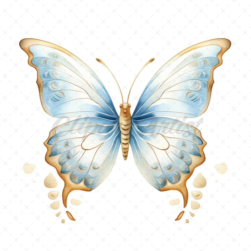 20 High-Quality Blue Gold Butterfly Clipart – Blue butterfly digital watercolor JPG instant download for commercial use – Digital download
