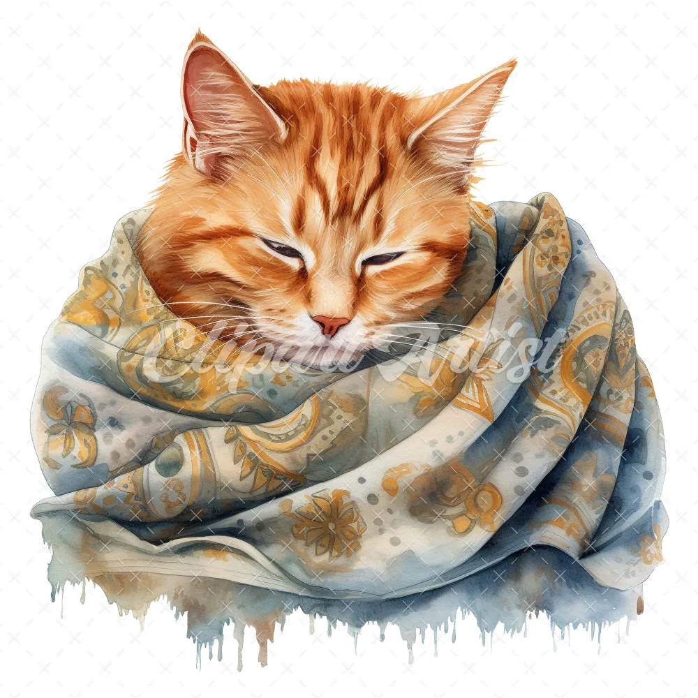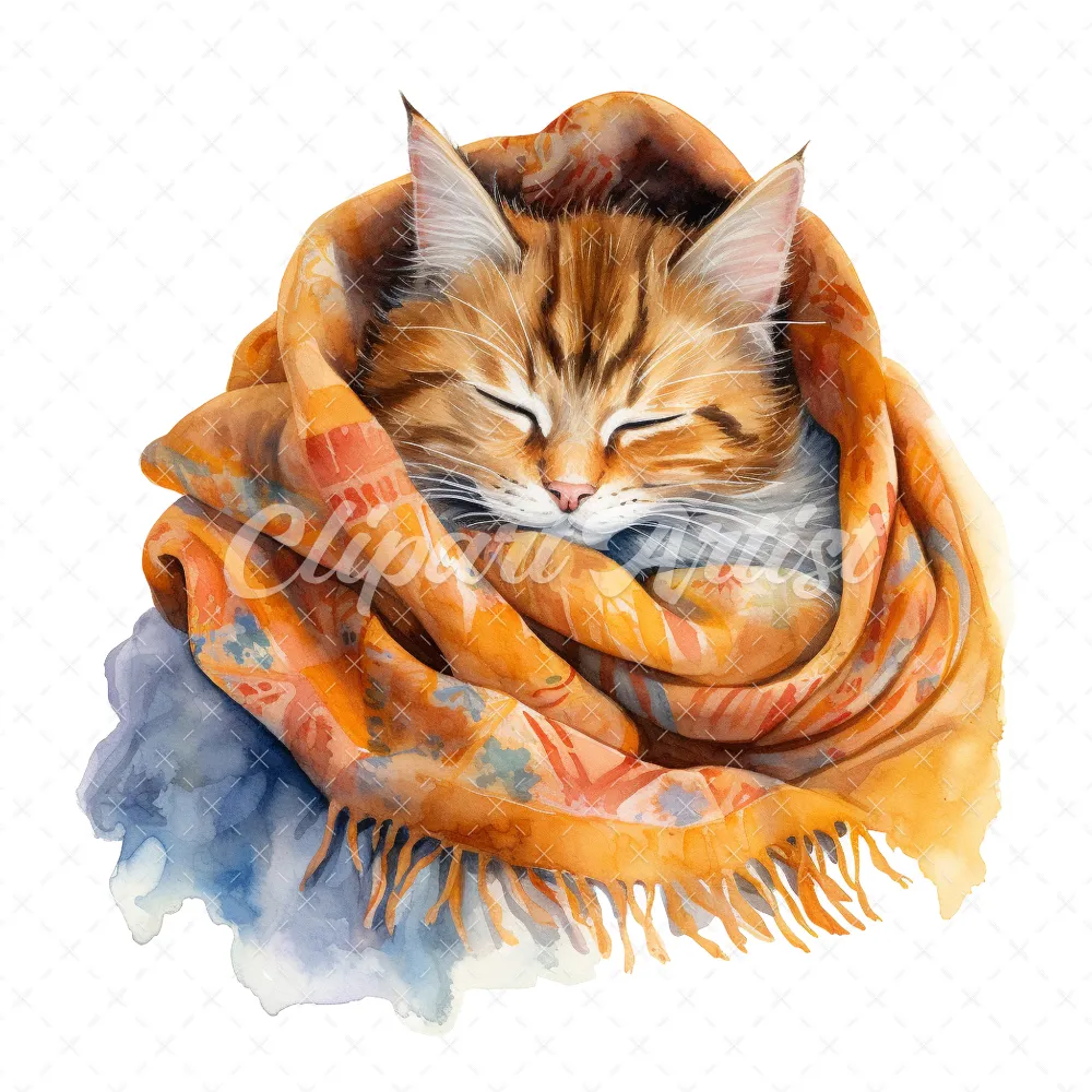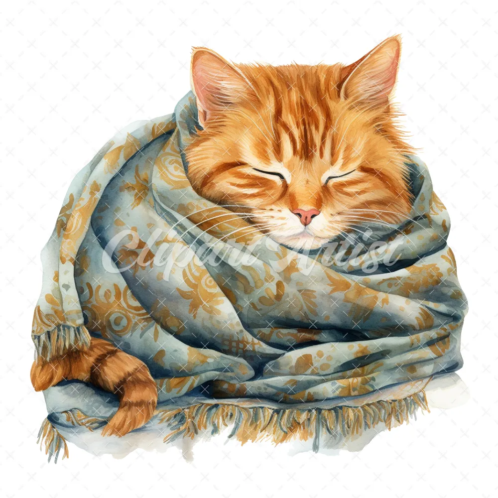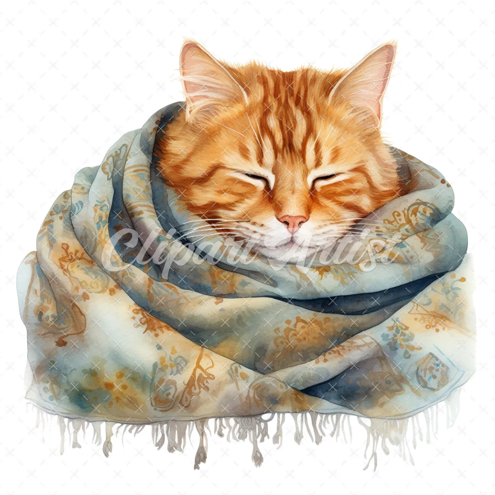 20 High-Quality Cat Sleeping in Shawl Clipart – Sleeping Cat digital watercolor JPG instant download for commercial use – Digital download