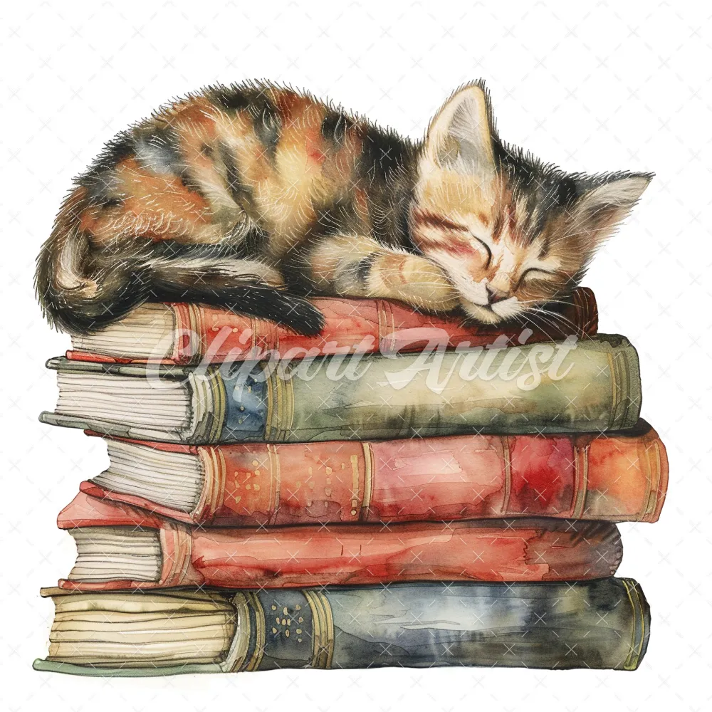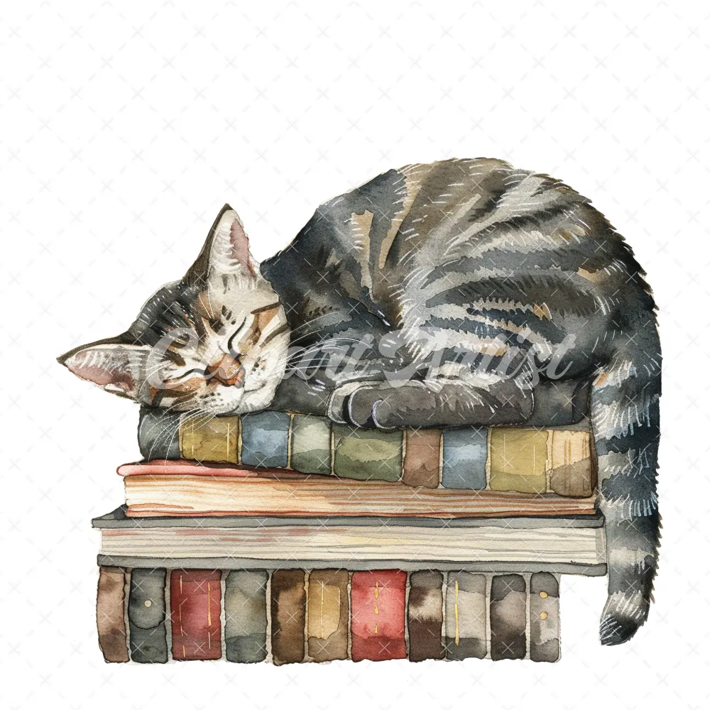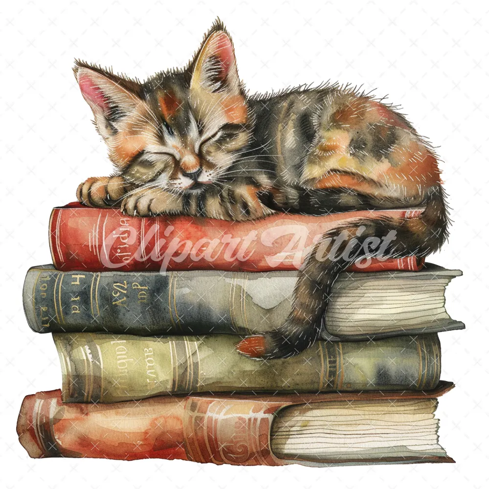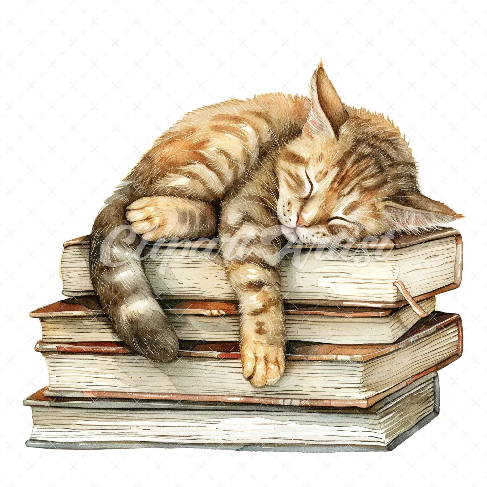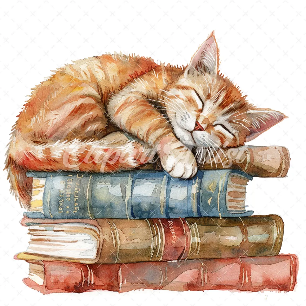 20 High-Quality Cat Sleeping On Books Clipart – Cat sleeping digital watercolor JPG instant download for commercial use – Digital download