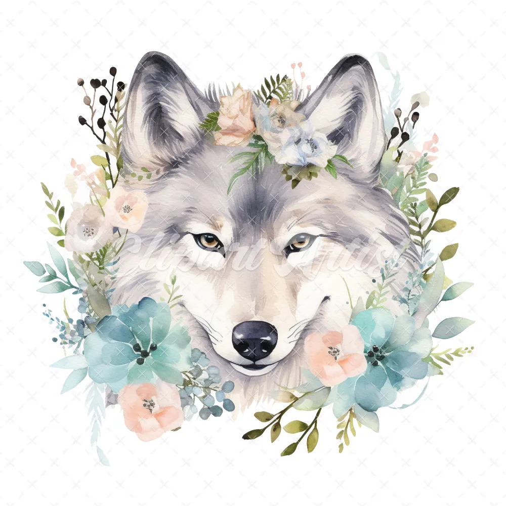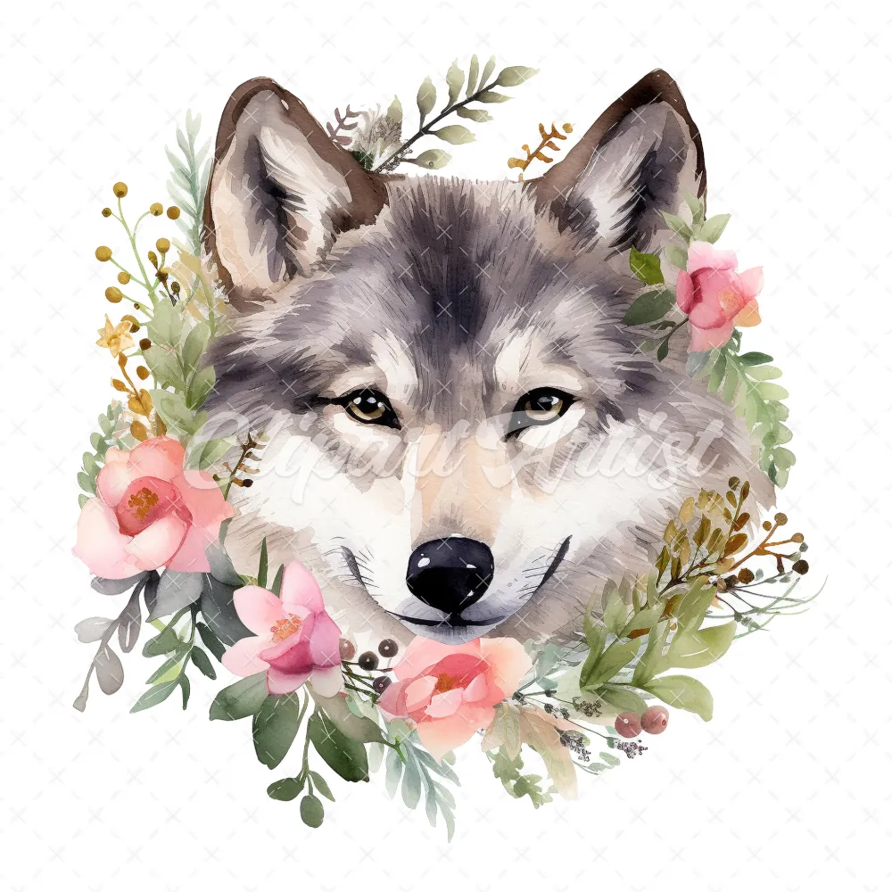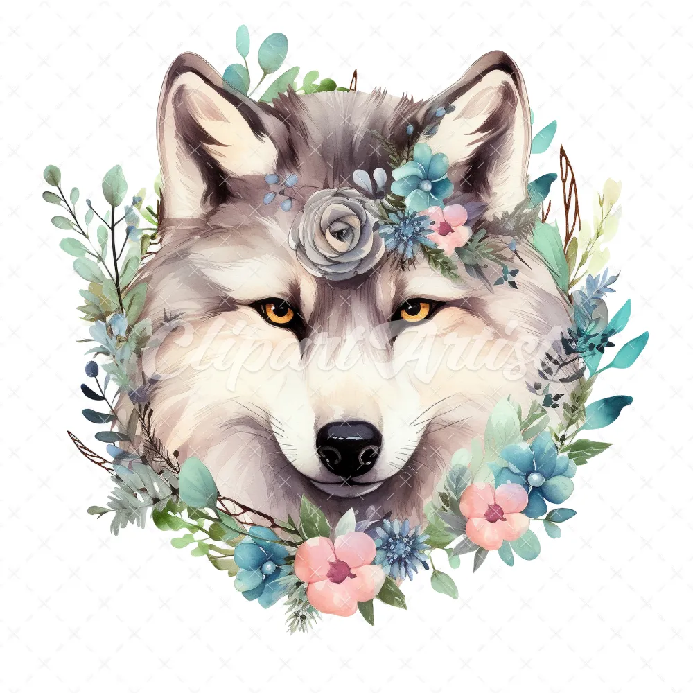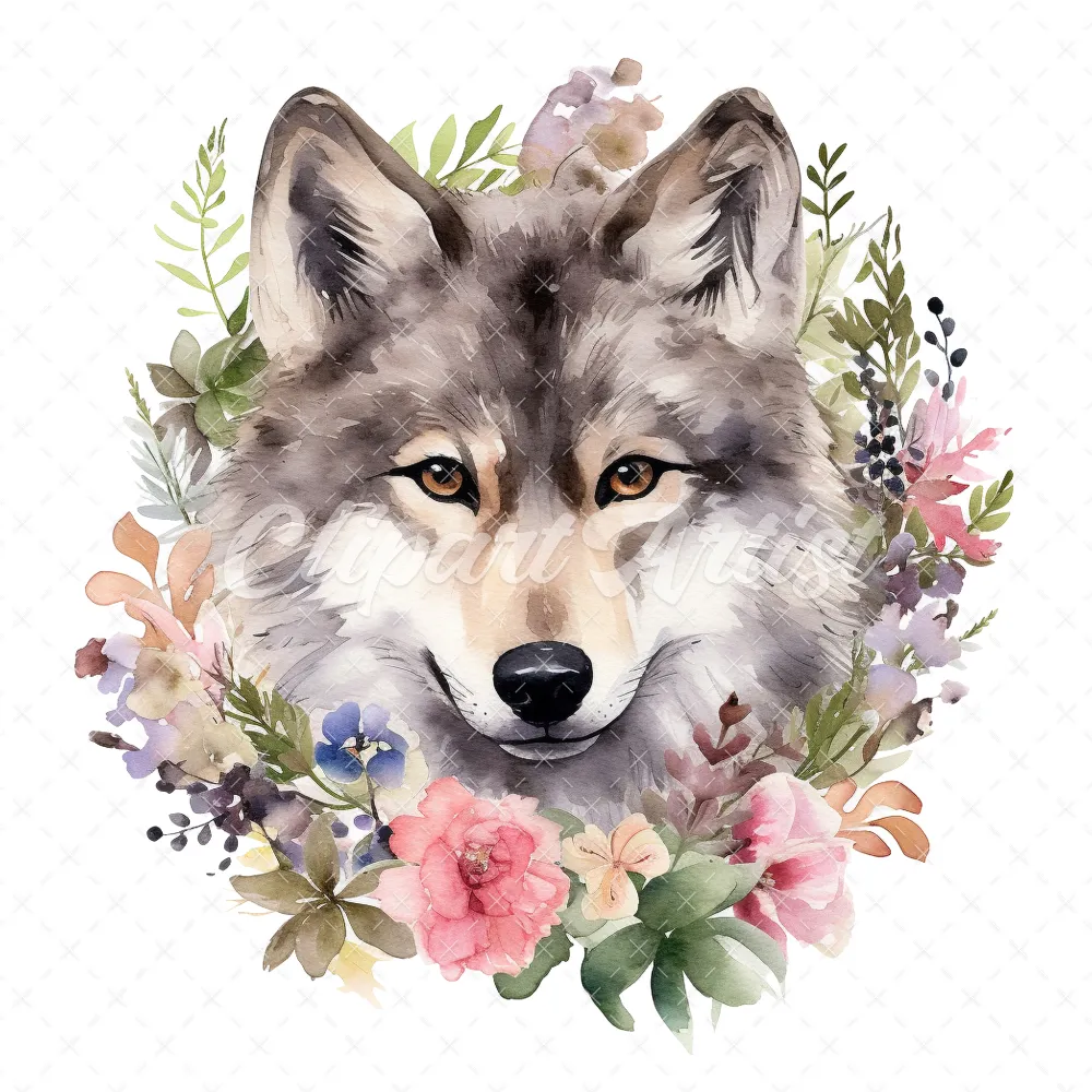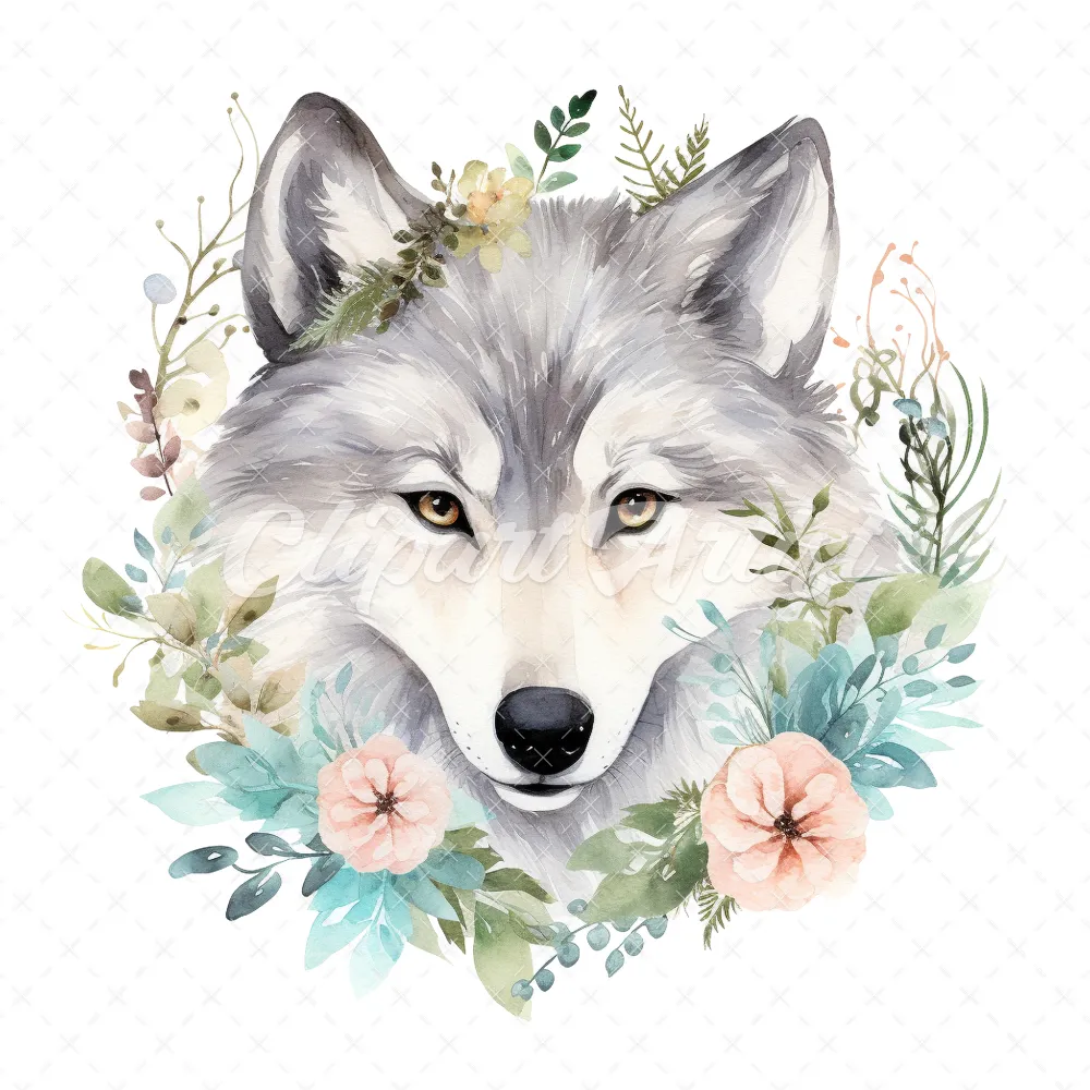 20 High-Quality Cute Wolf In Wreath Clipart – Cute wolf digital watercolor JPG instant download for commercial use – Digital download