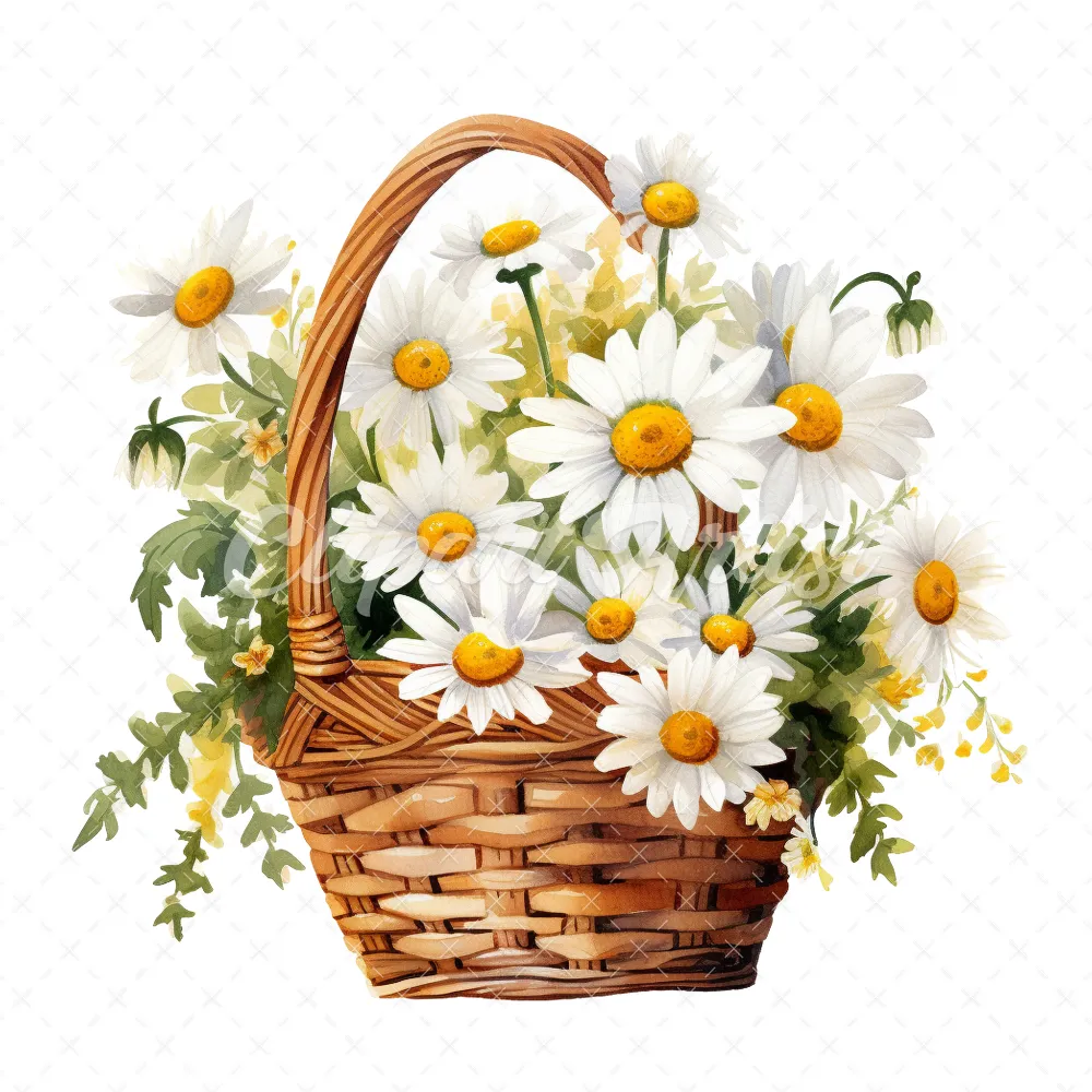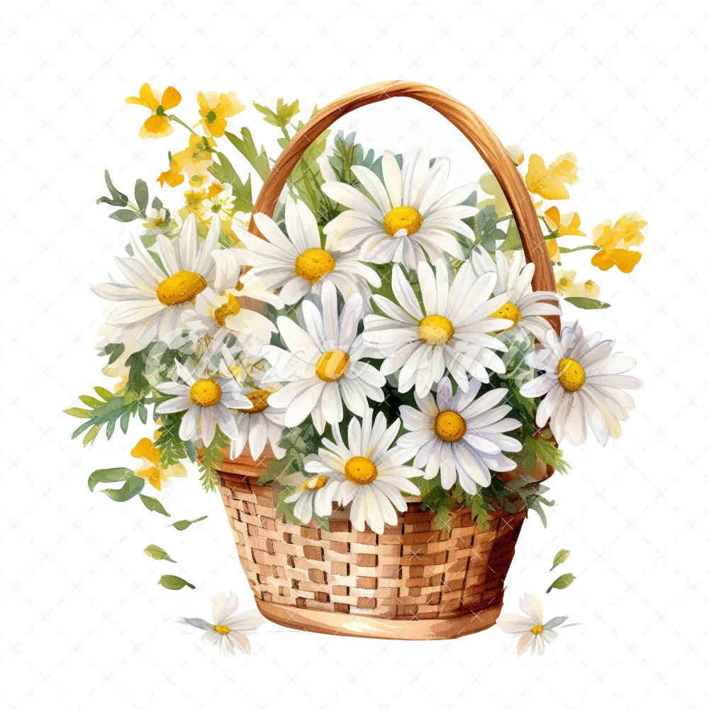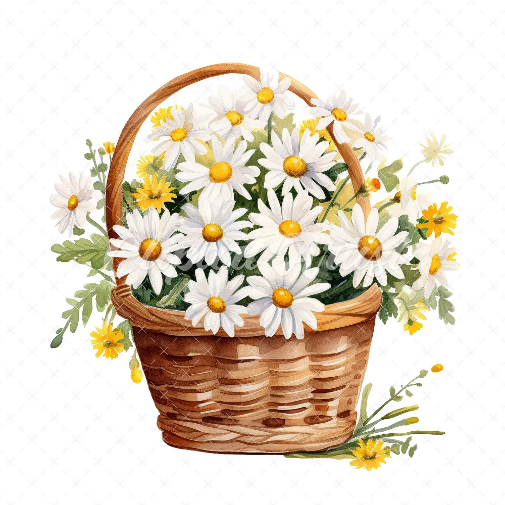 20 High-Quality Daisies Basket Clipart – Daisies basket digital watercolor JPG instant download for commercial use – Digital download
