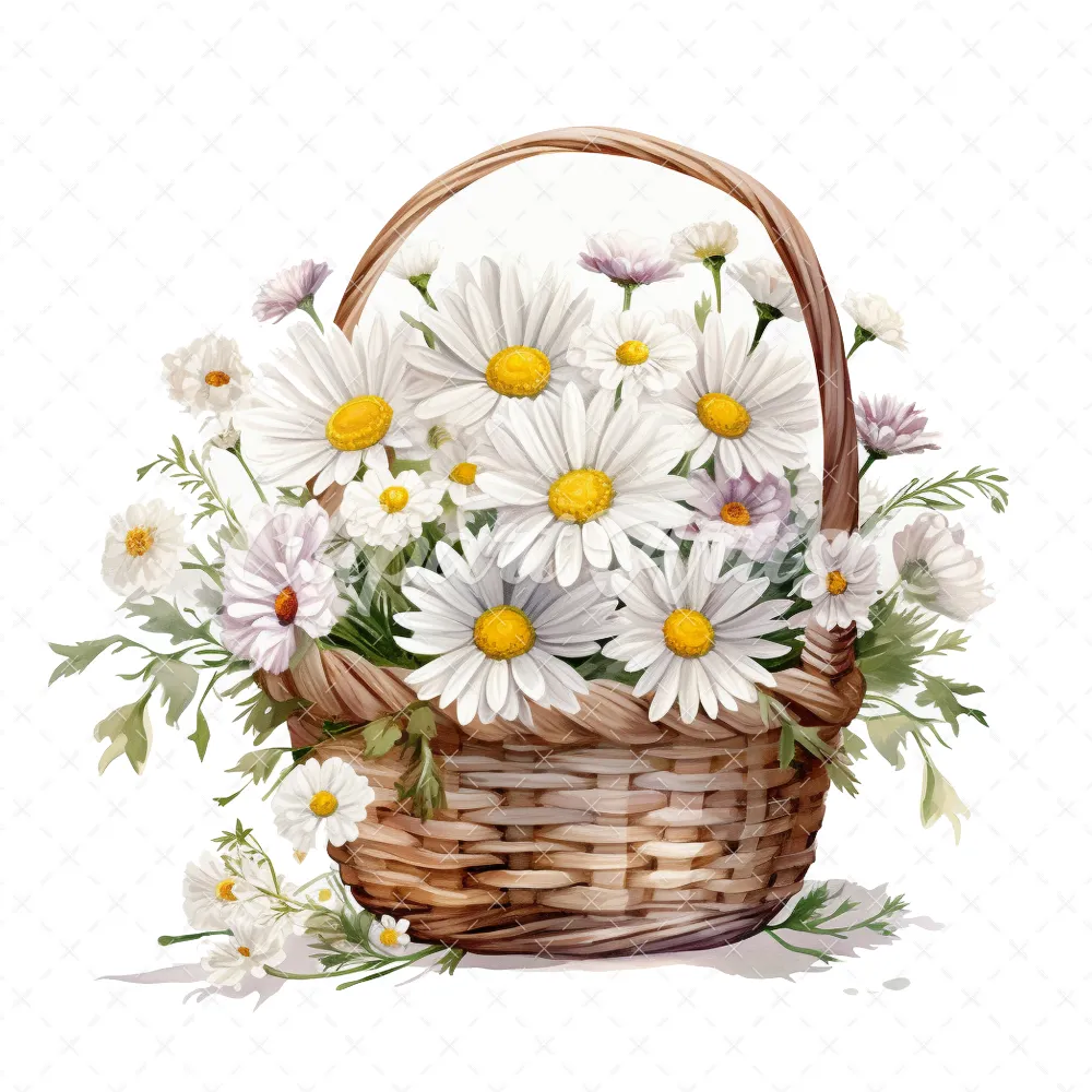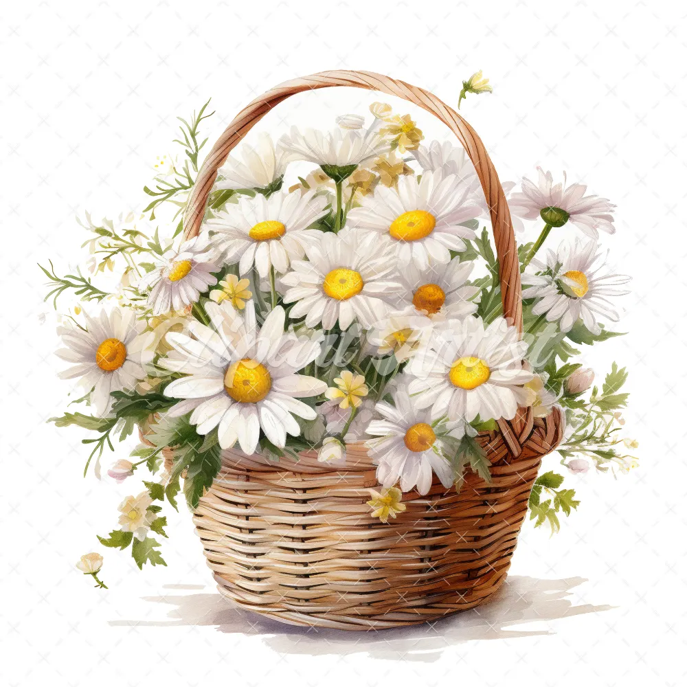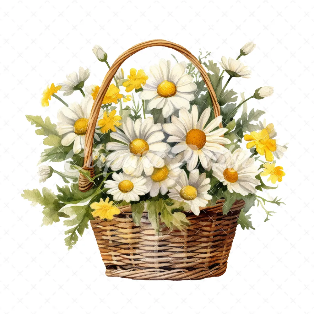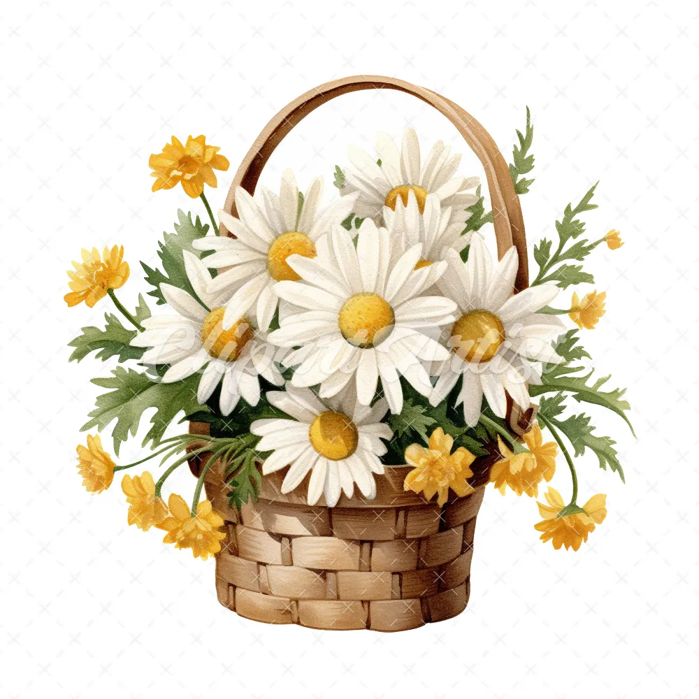 20 High-Quality Daisies Basket Clipart – Daisies basket digital watercolor JPG instant download for commercial use – Digital download