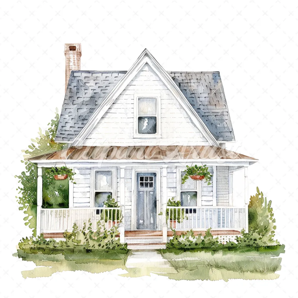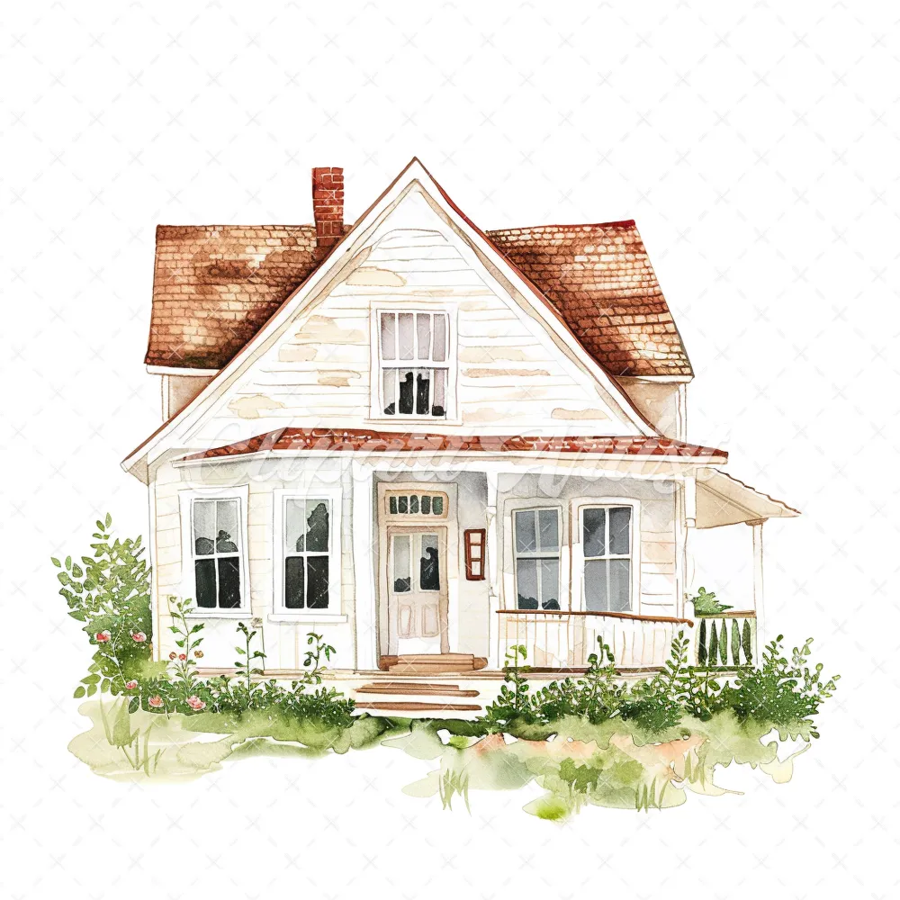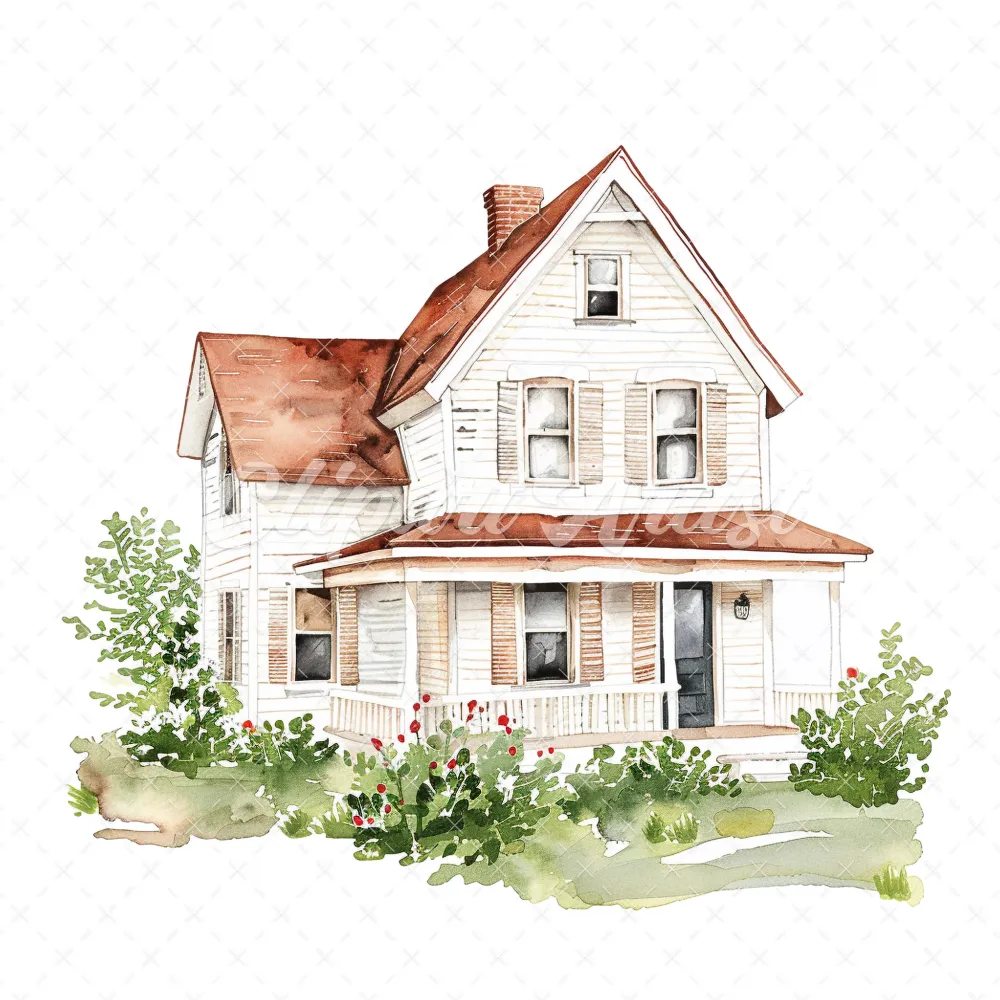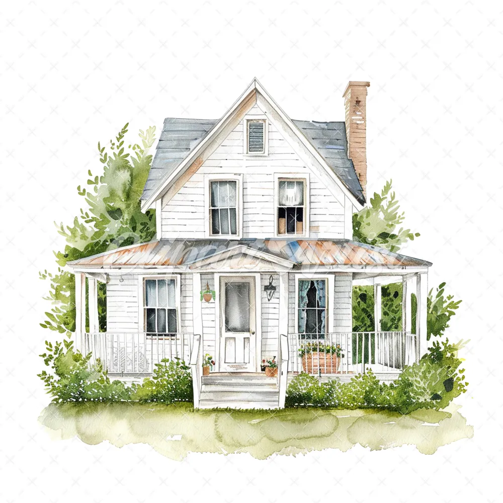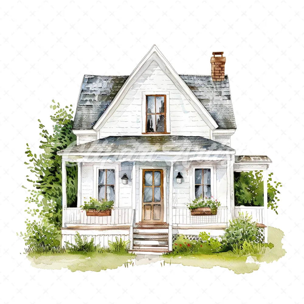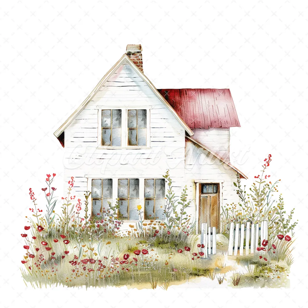 20 High-Quality Farmhouse Clipart – Farmhouse with flowers digital watercolor JPG instant download for commercial use – Digital download