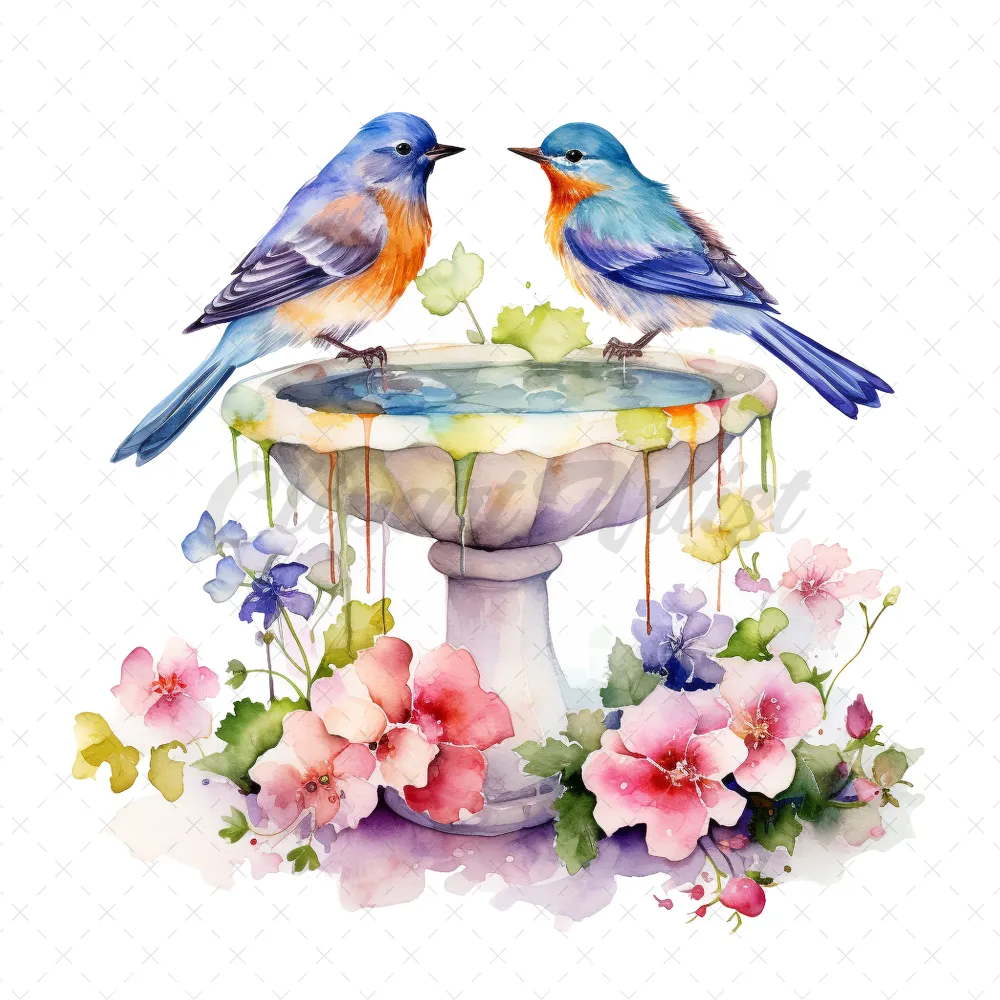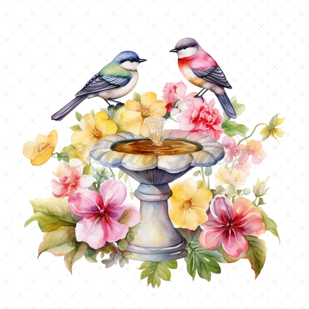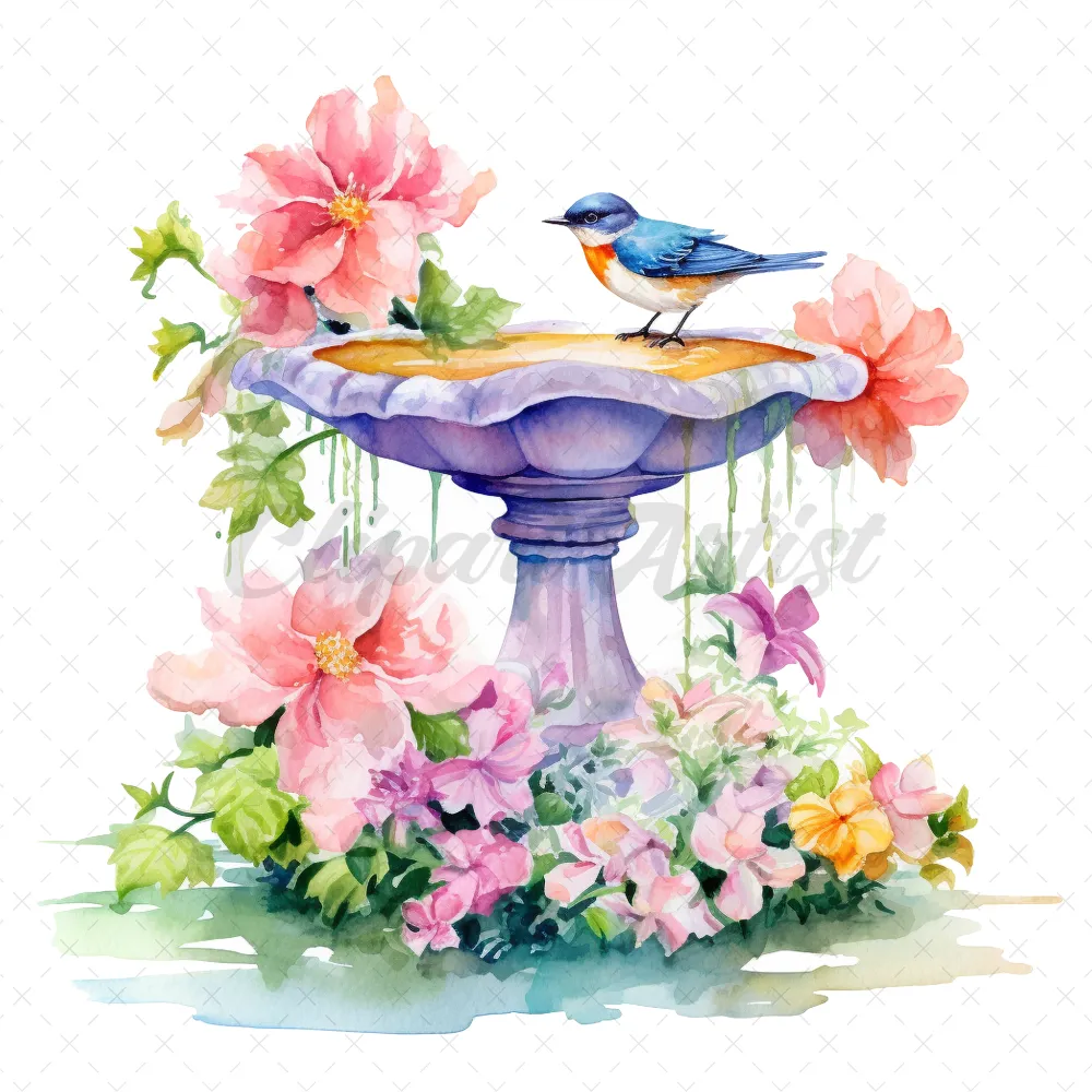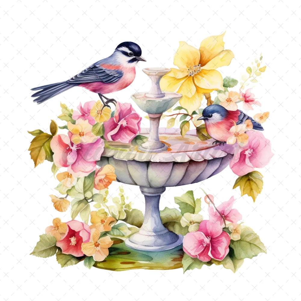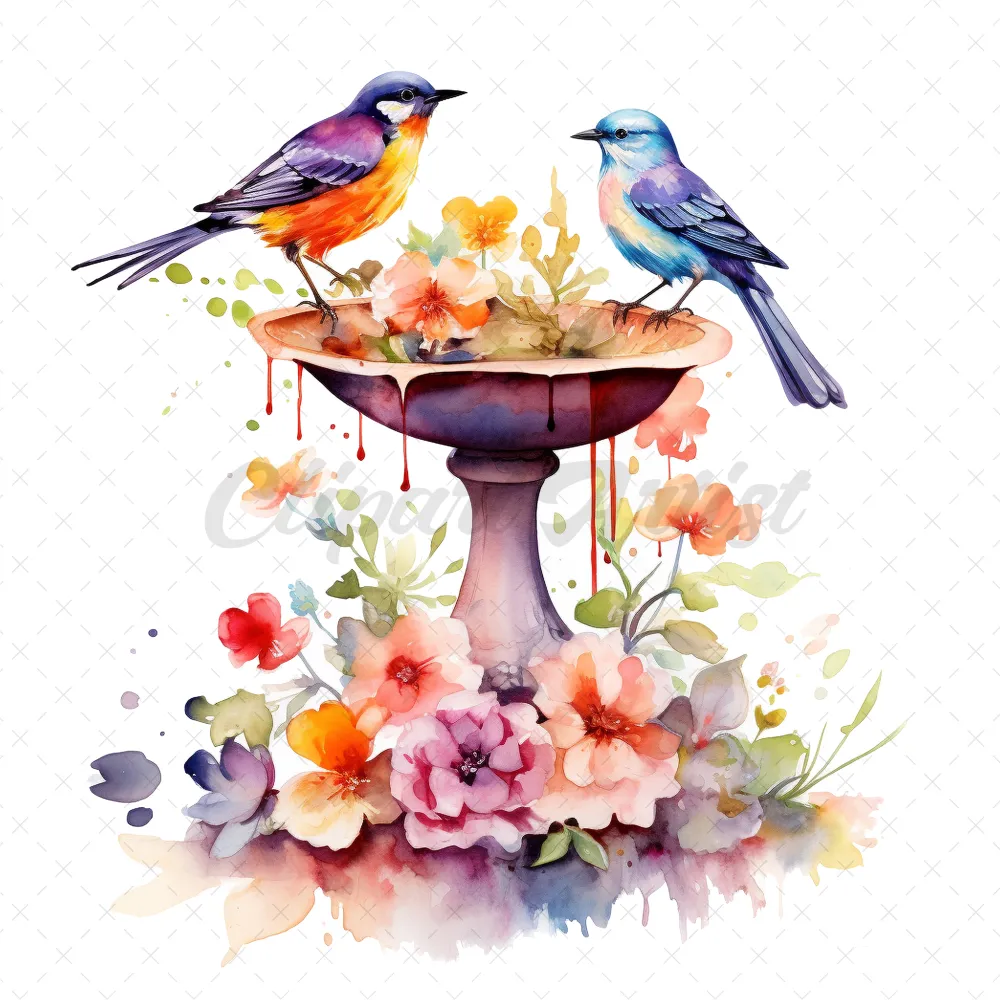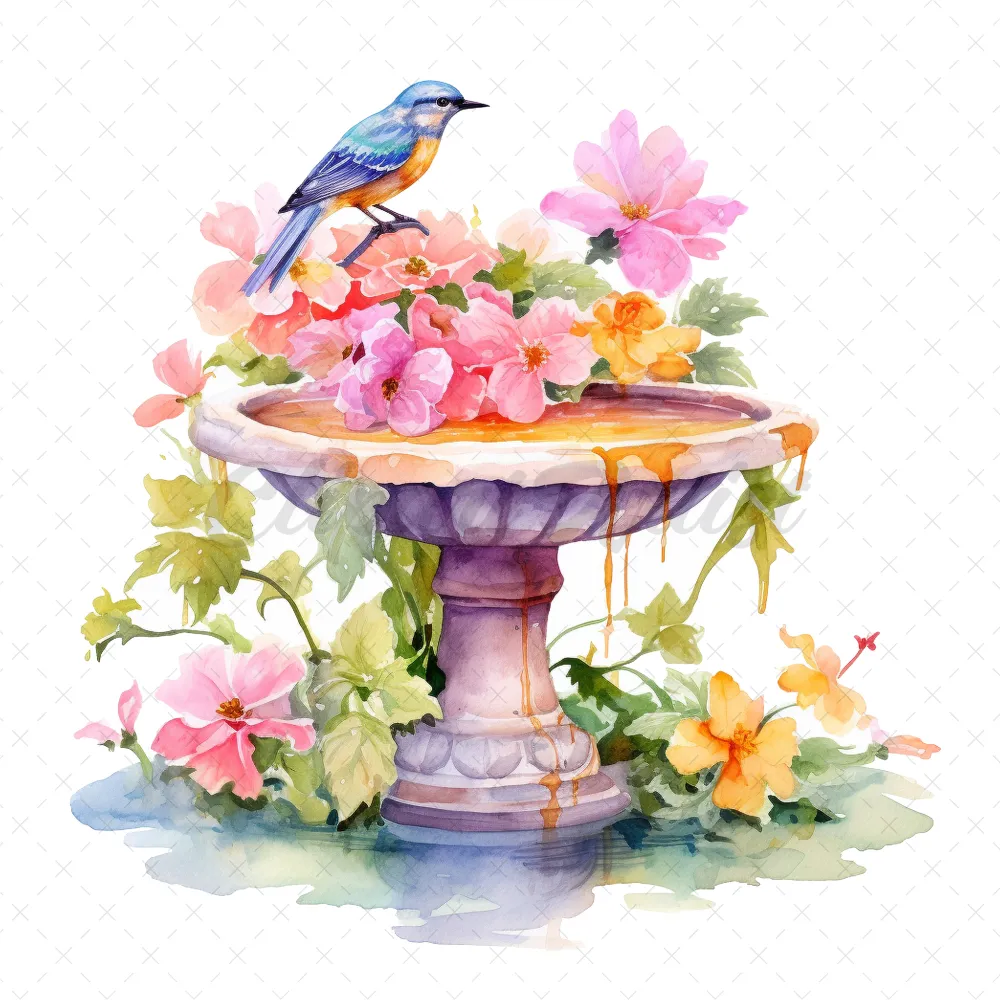 20 High-Quality Floral Birdbath Clipart – Floral birdbath digital watercolor JPG instant download for commercial use – Digital download