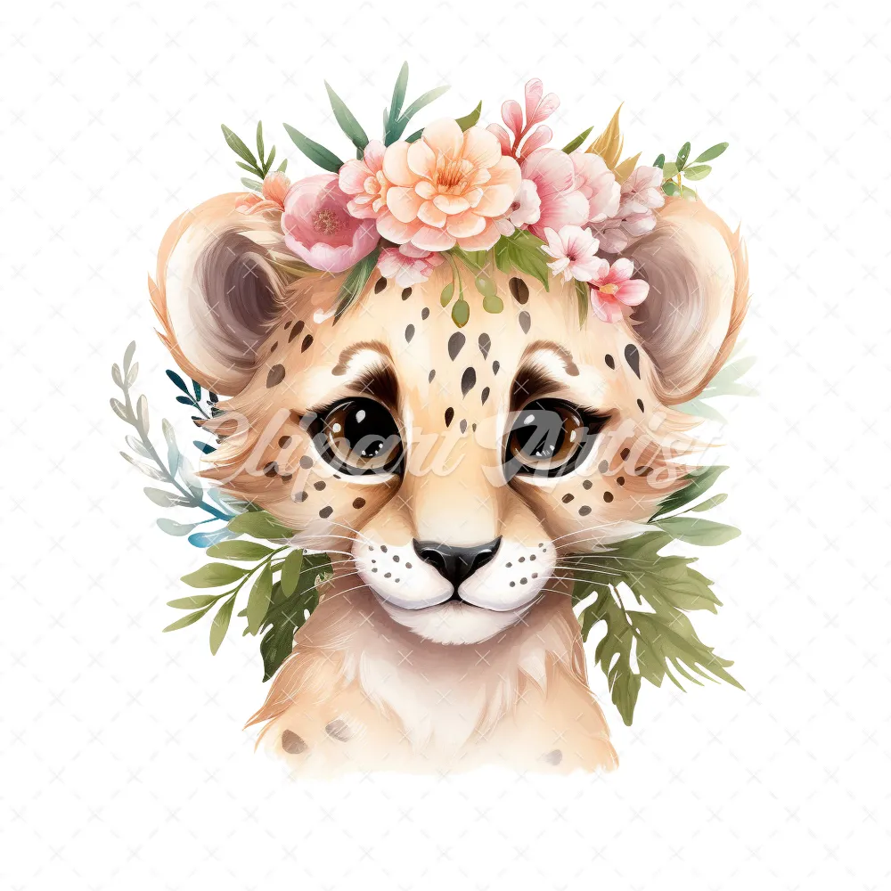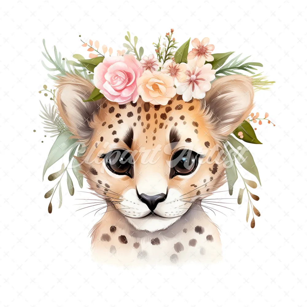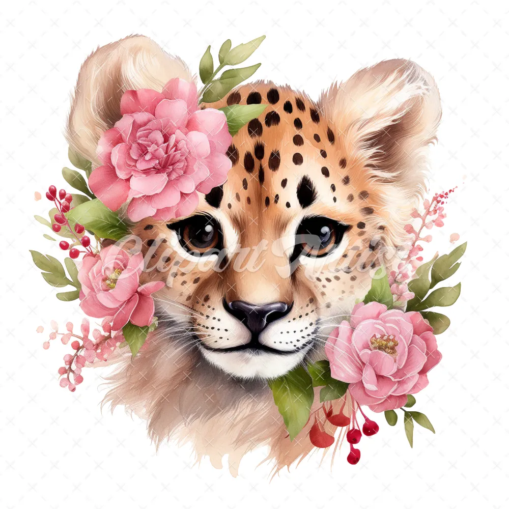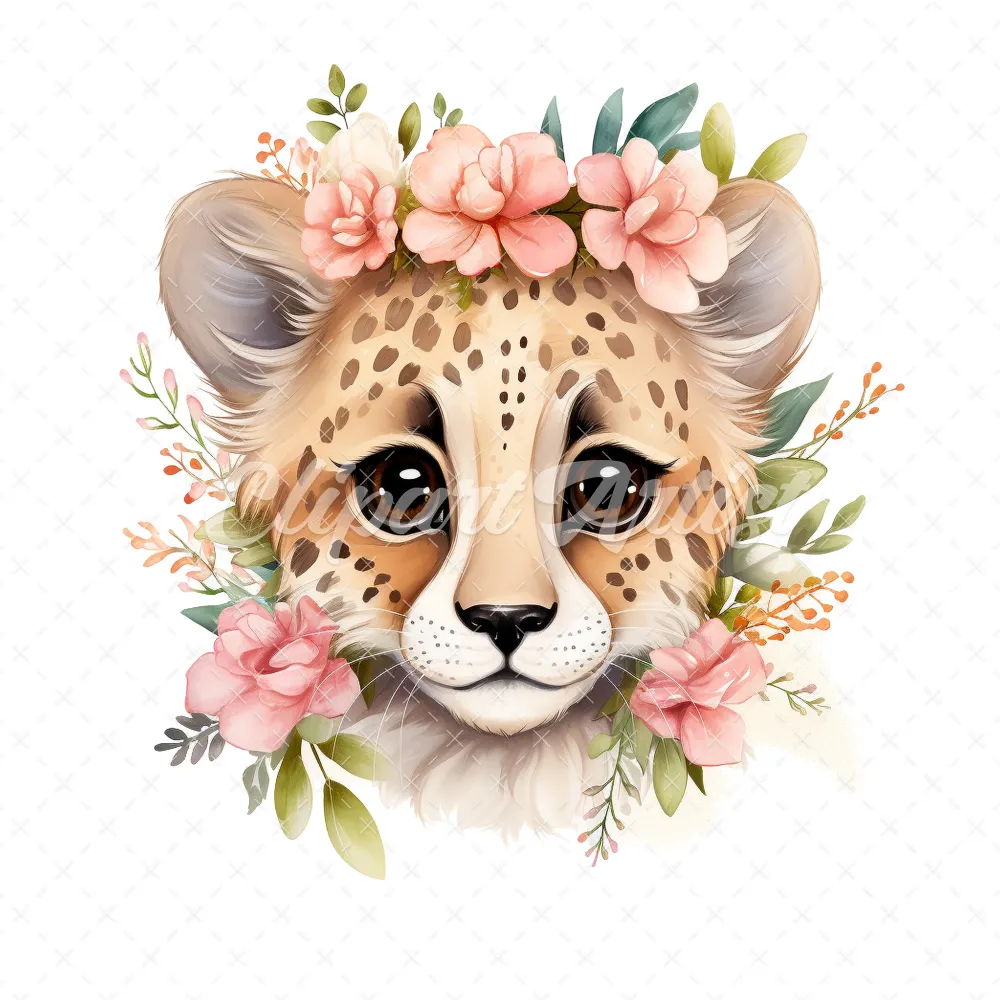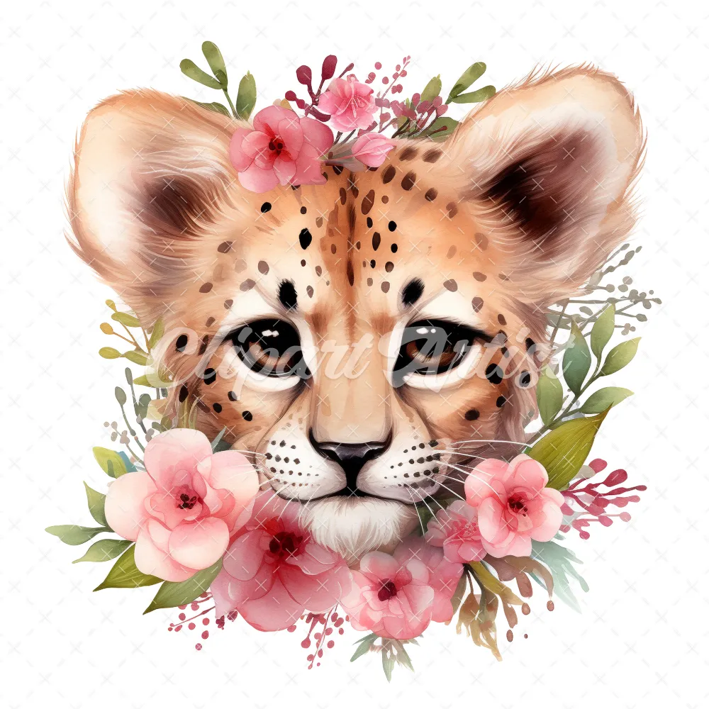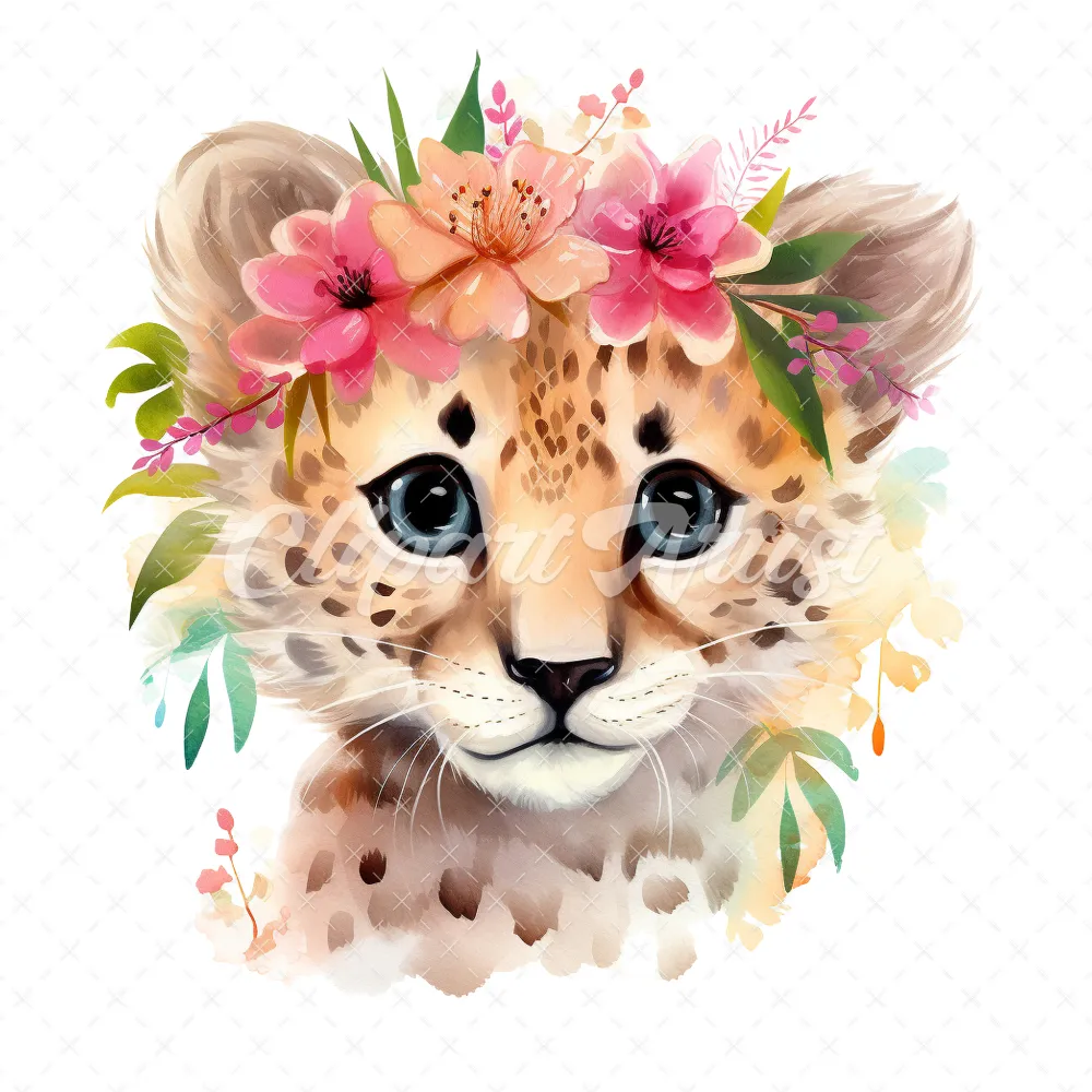 20 High-Quality Floral Cute Cheetah Clipart – Cute cheetah digital watercolor JPG instant download for commercial use – Digital download