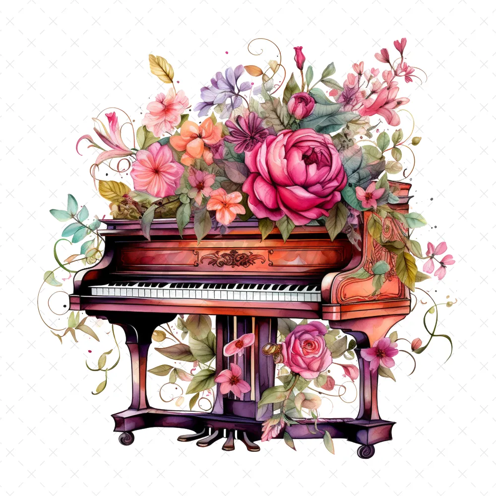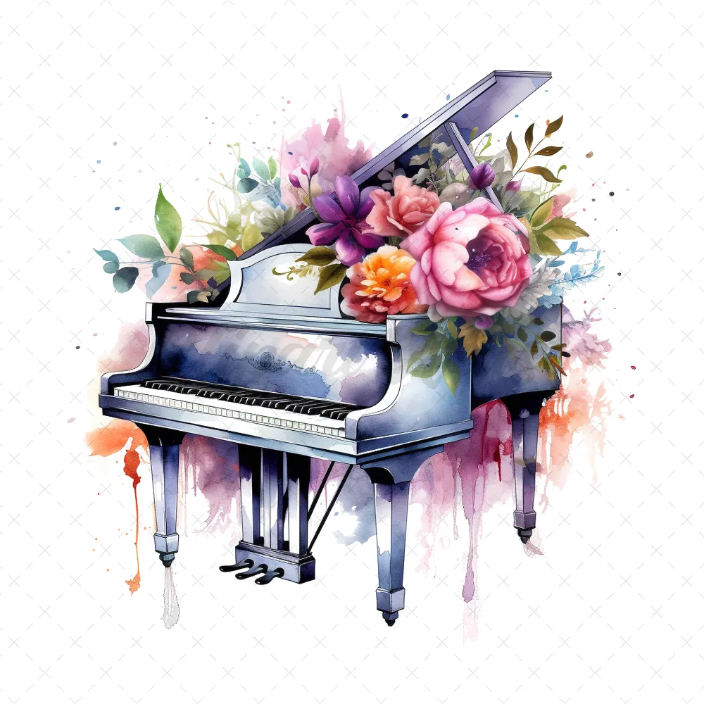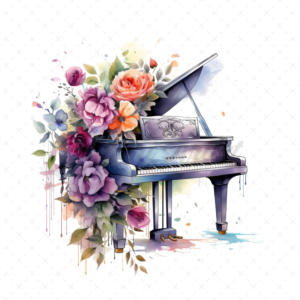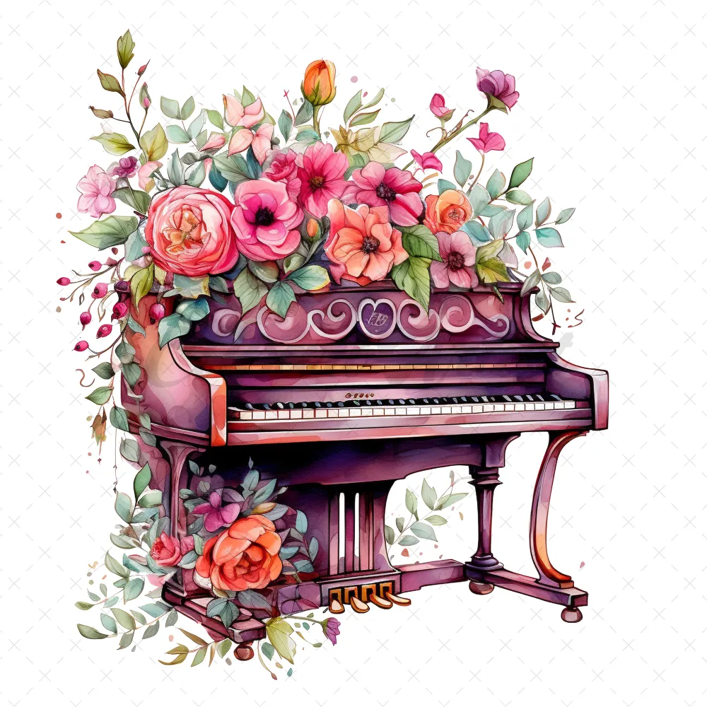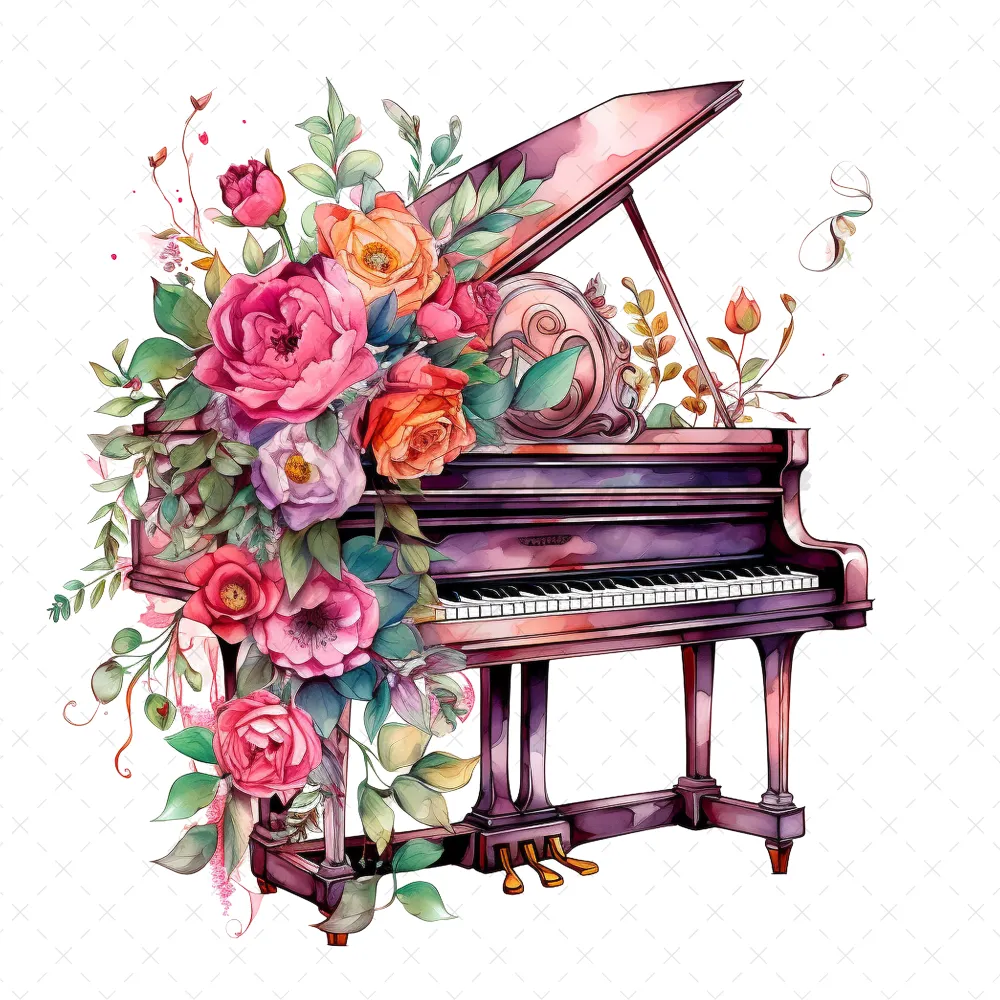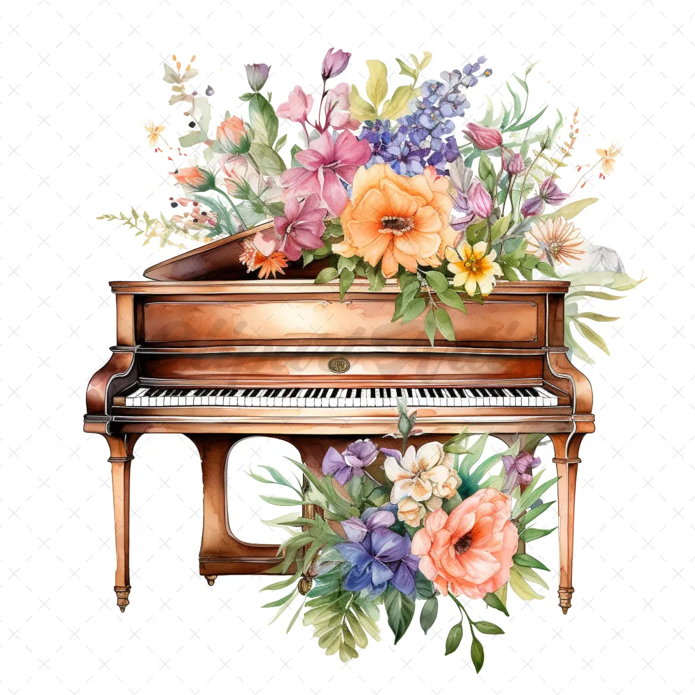 20 High-Quality Floral Piano Clipart – Floral piano digital watercolor JPG instant download for commercial use – Digital download