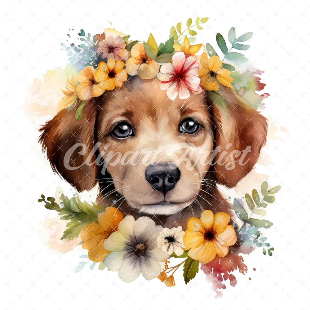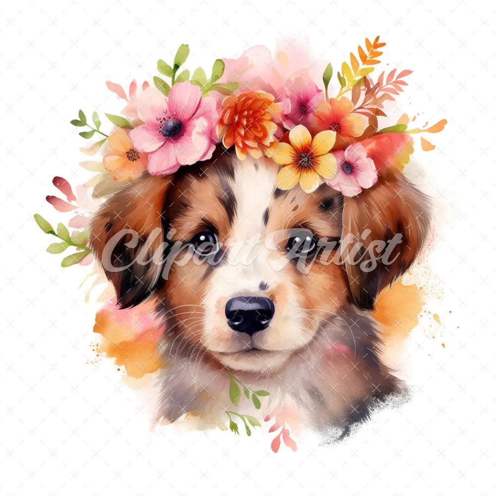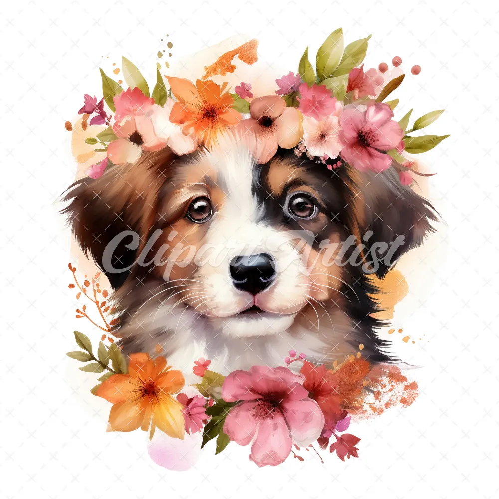 20 High-Quality Floral Portrait Puppy Clipart – Floral Puppy digital watercolor JPG instant download for commercial use – Digital download