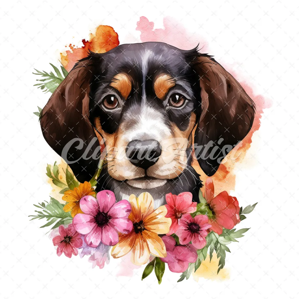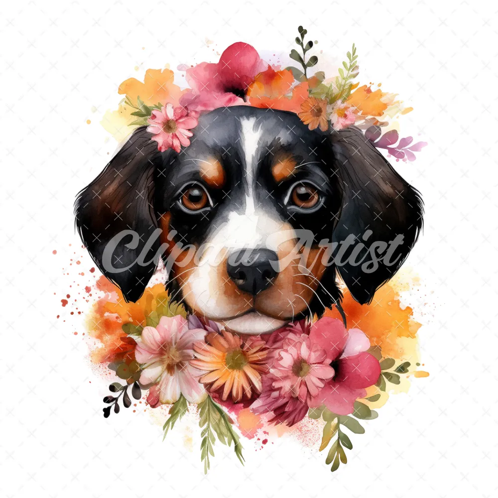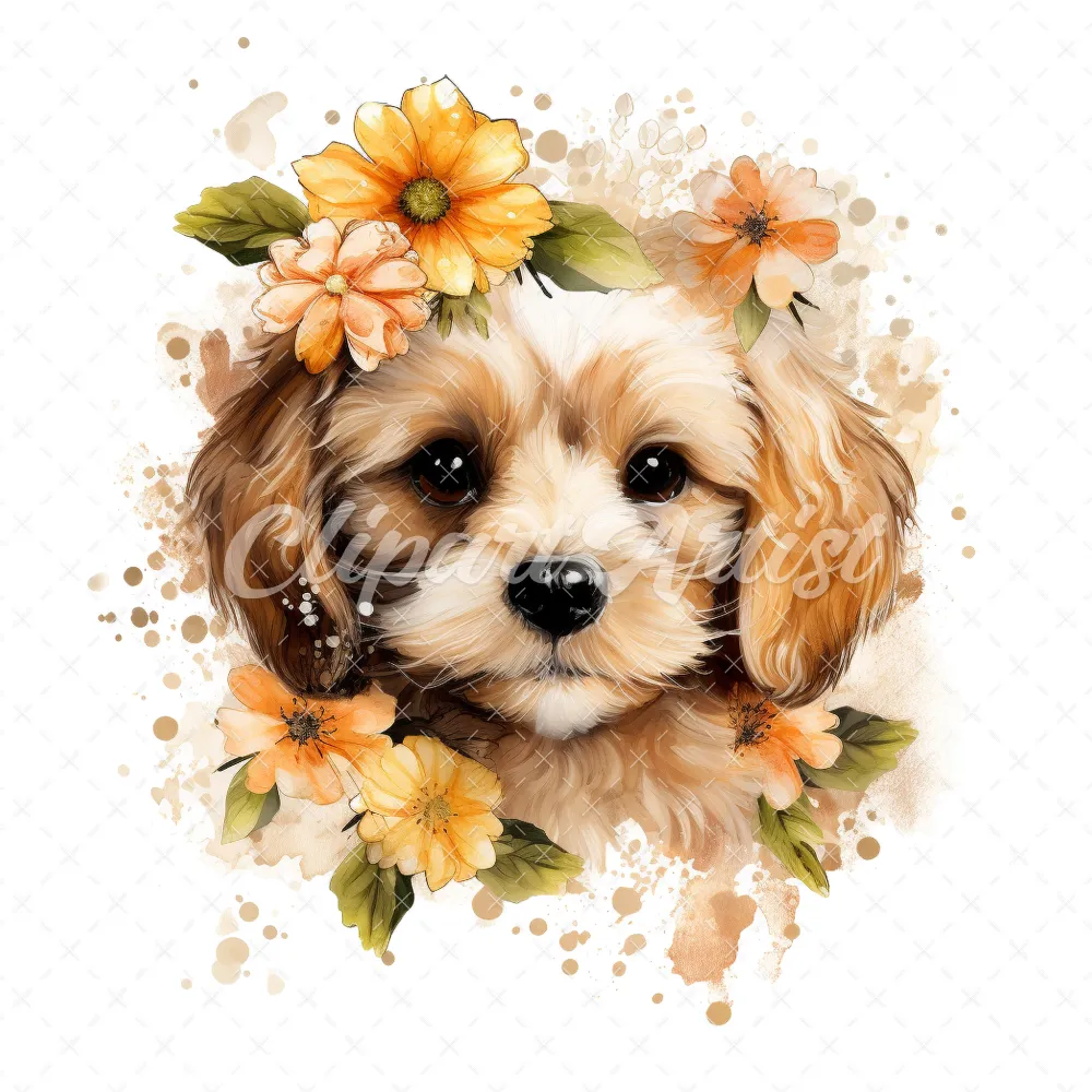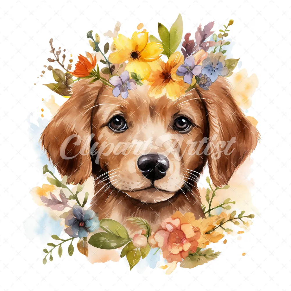 20 High-Quality Floral Portrait Puppy Clipart – Floral Puppy digital watercolor JPG instant download for commercial use – Digital download
