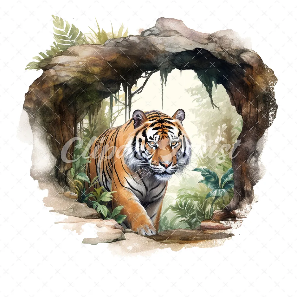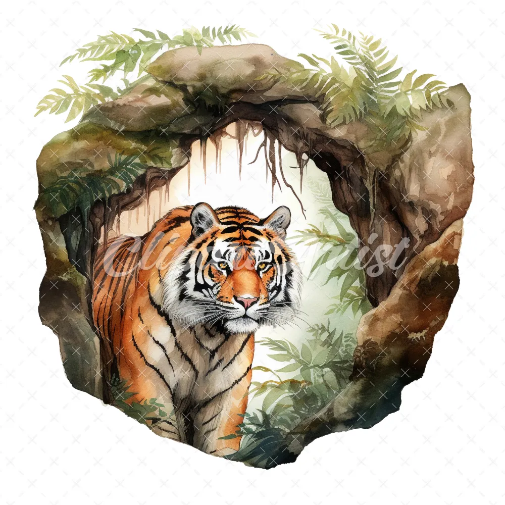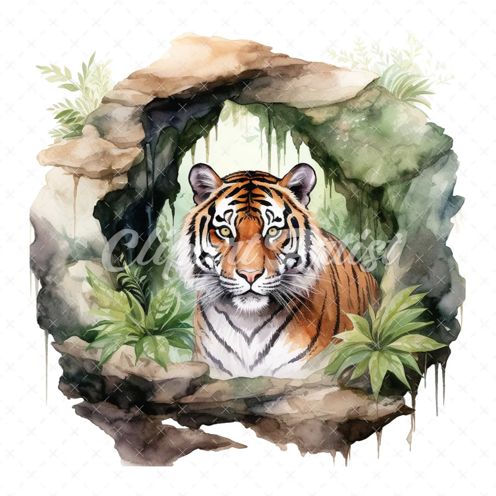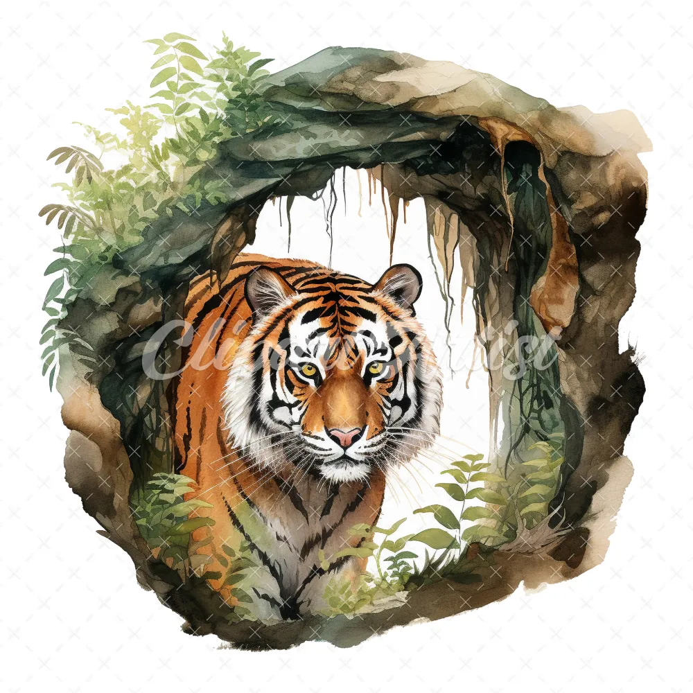 20 High-Quality Forest Cave Tiger Clipart – Cave tiger digital watercolor JPG instant download for commercial use – Digital download