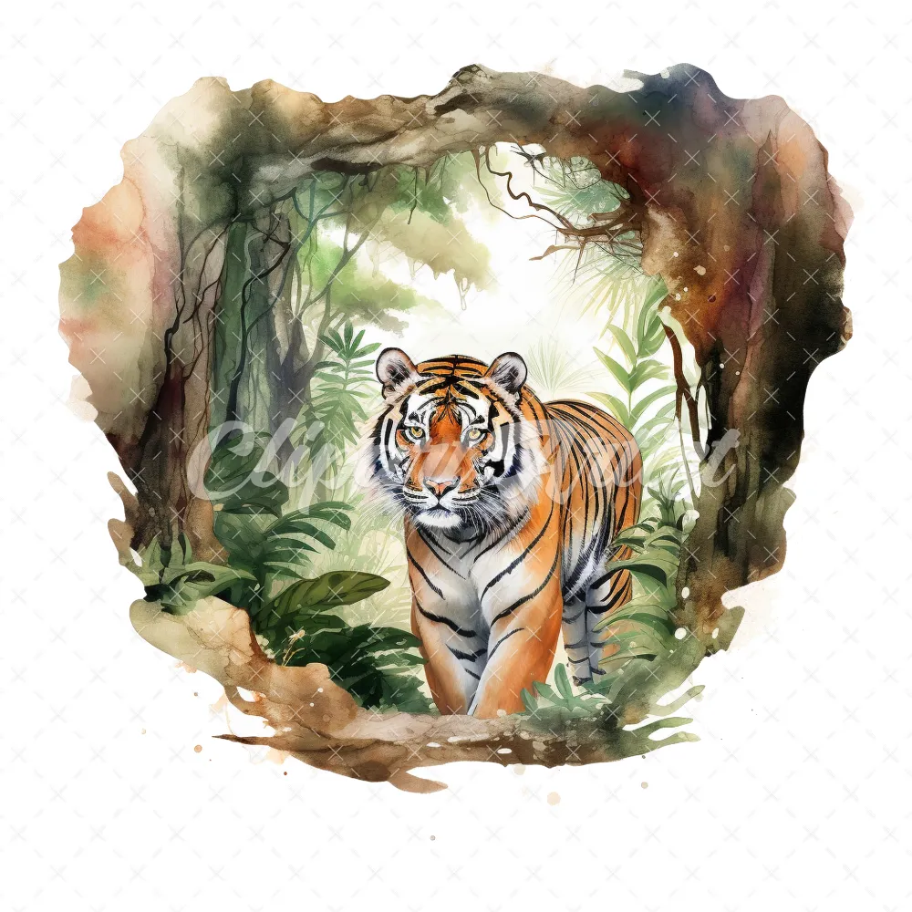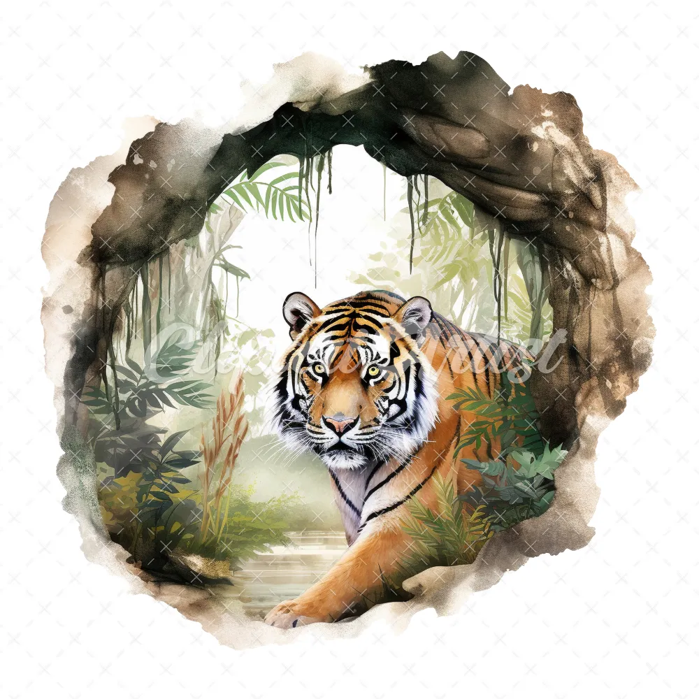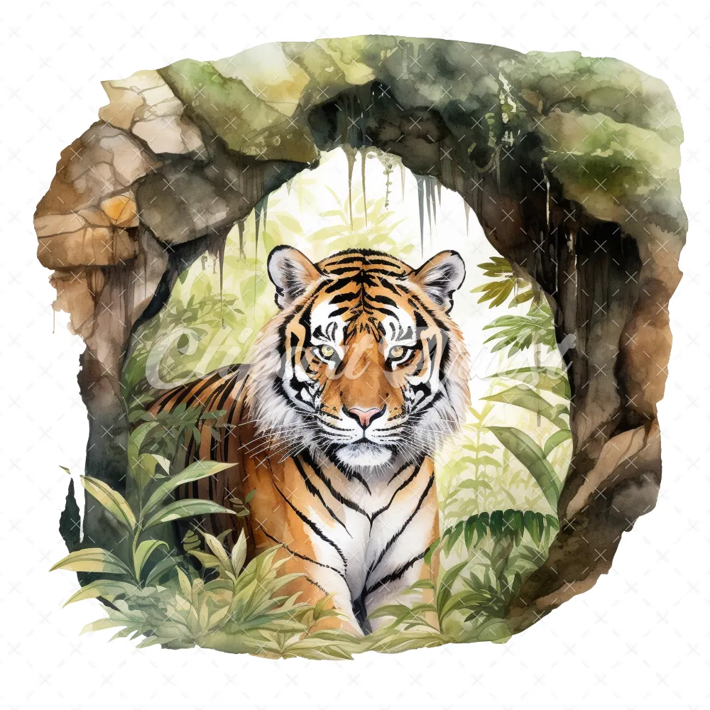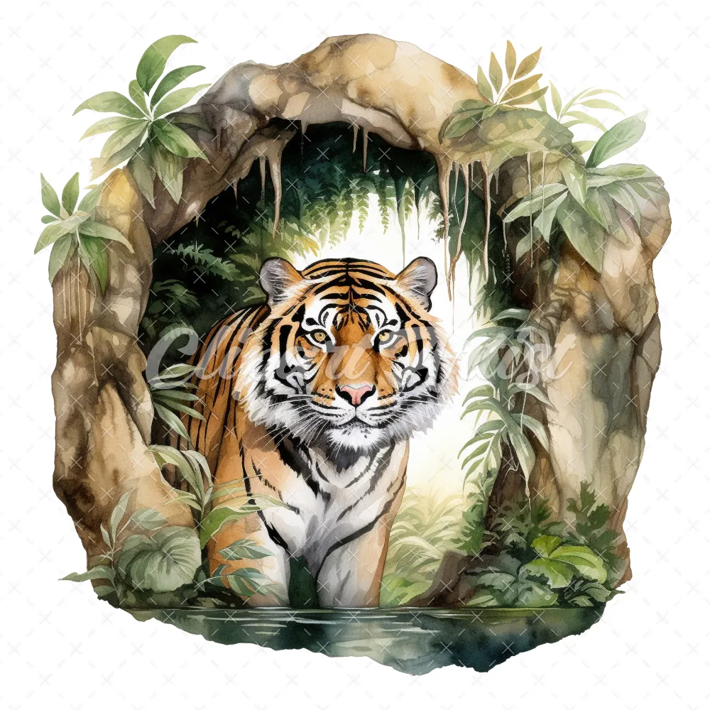 20 High-Quality Forest Cave Tiger Clipart – Cave tiger digital watercolor JPG instant download for commercial use – Digital download