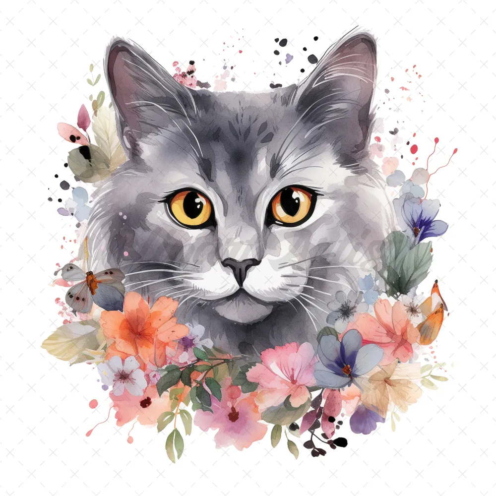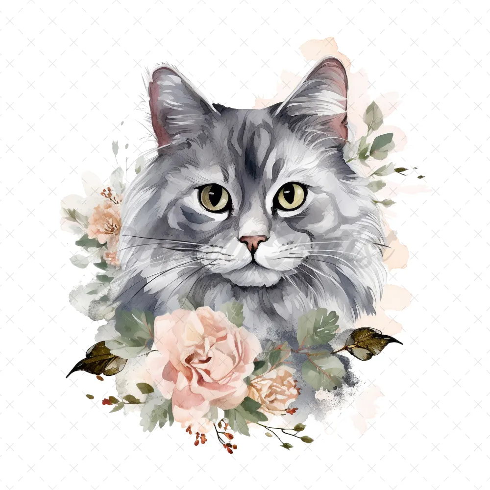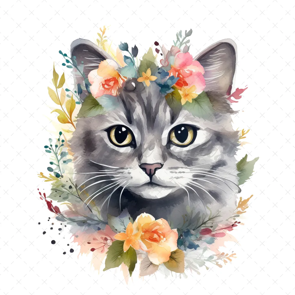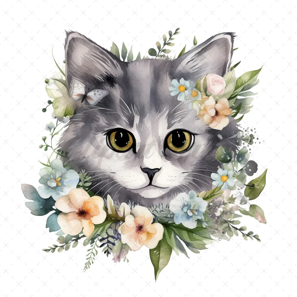 20 High-Quality Gray Floral Cats Clipart – Floral cats digital watercolor JPG instant download for commercial use – Digital download