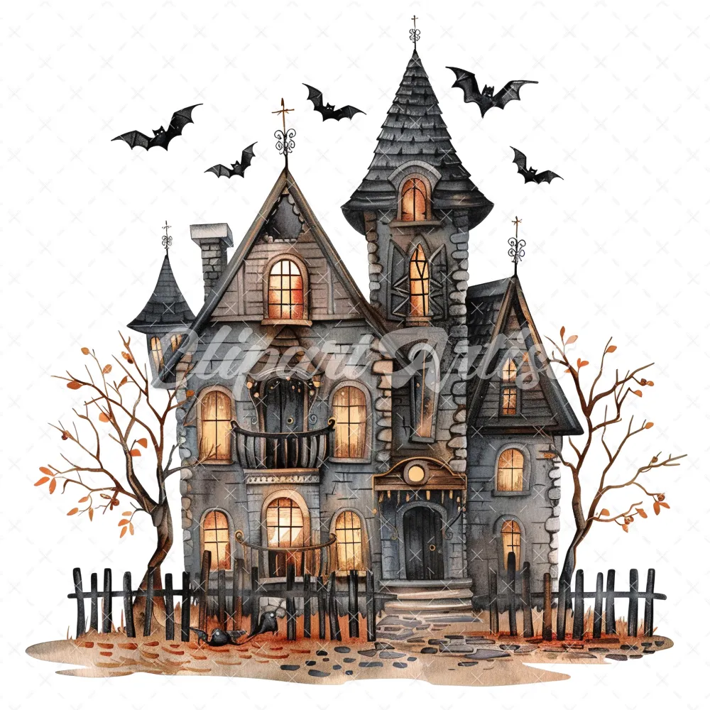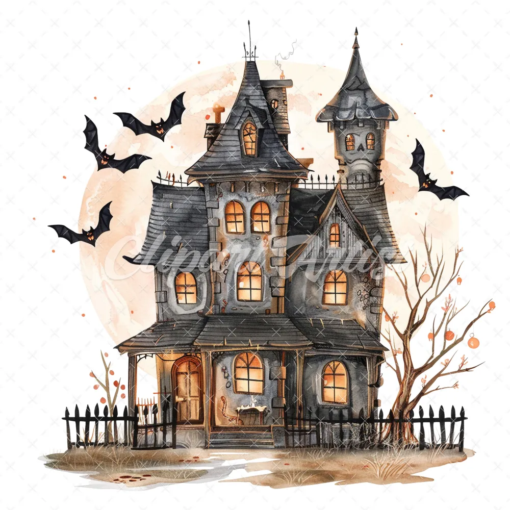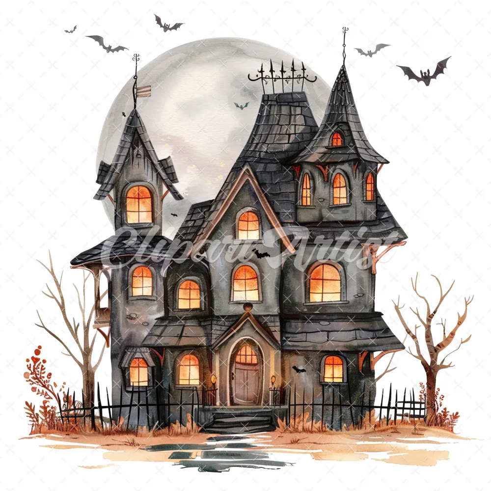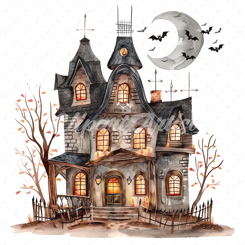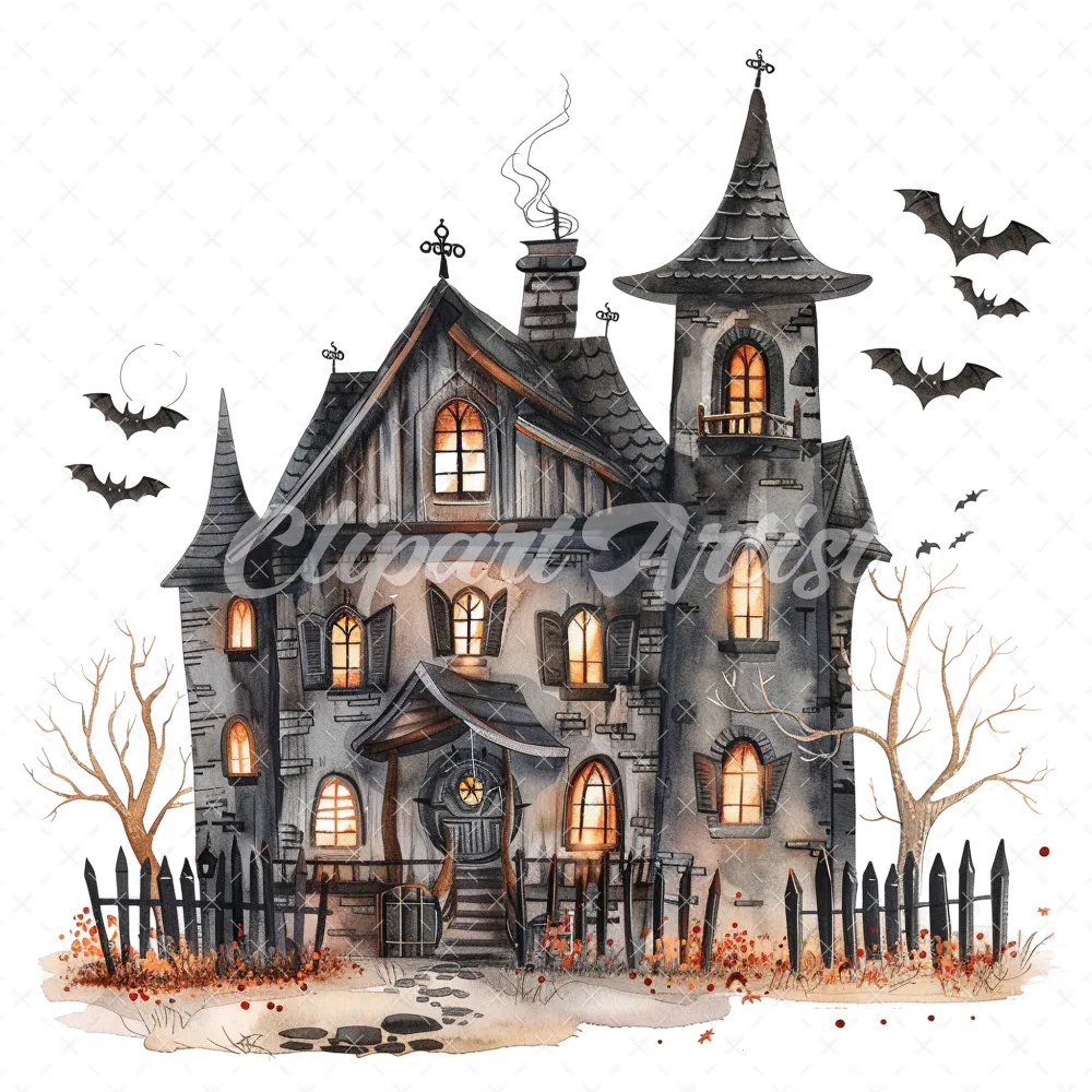 20 High-Quality Haunted House Clipart – Haunted house digital watercolor JPG instant download for commercial use – Digital download