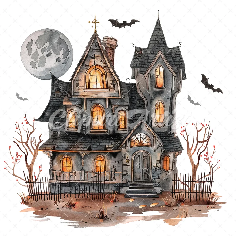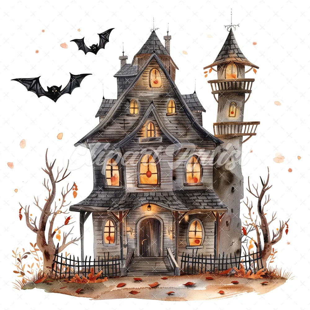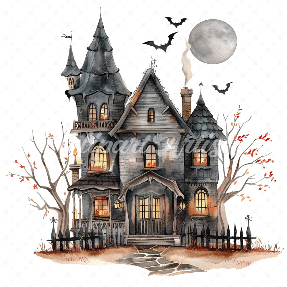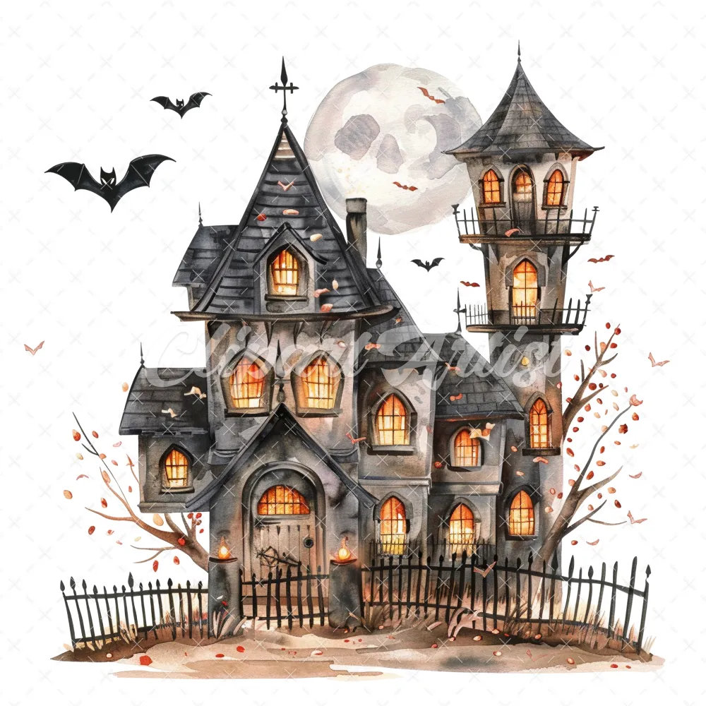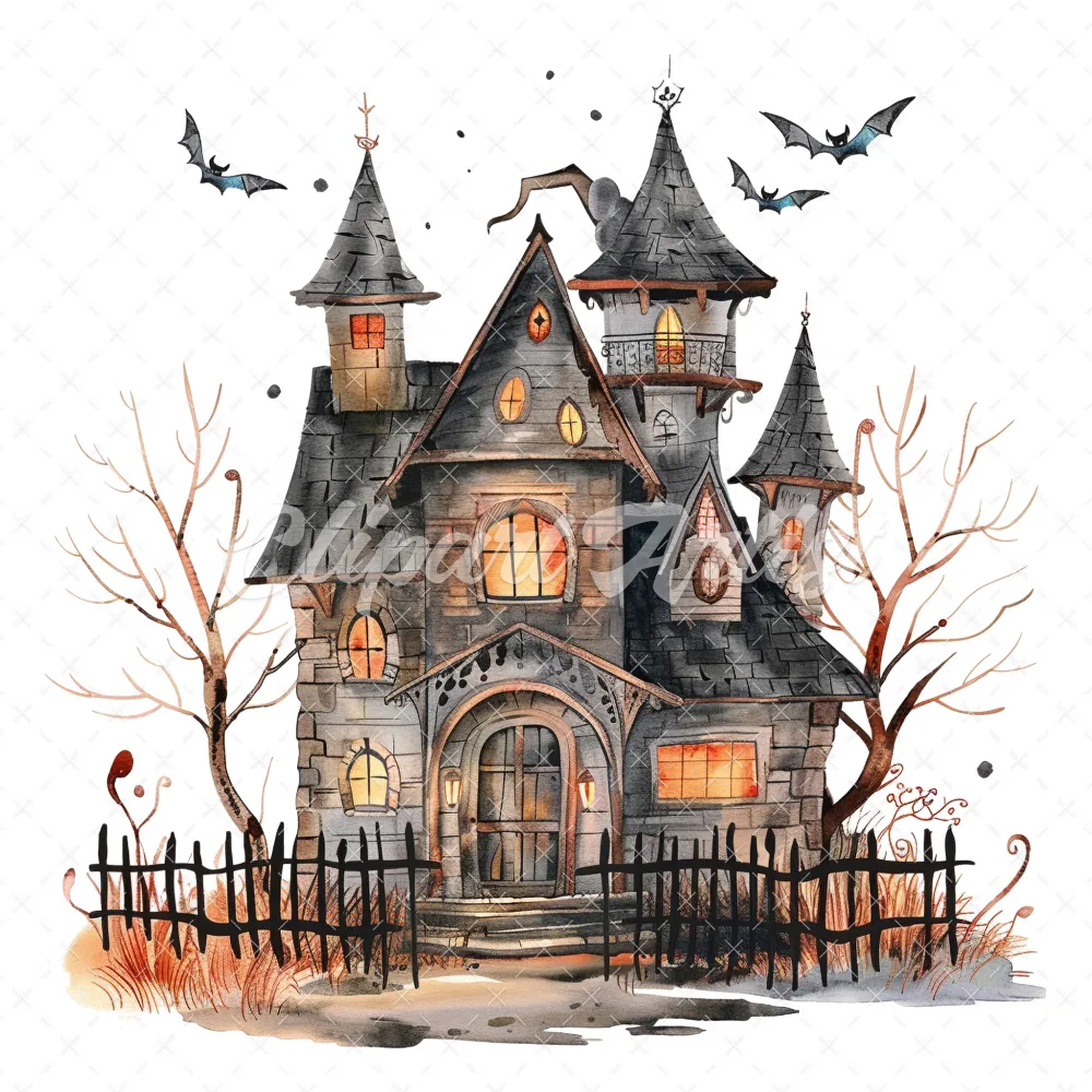 20 High-Quality Haunted House Clipart – Haunted house digital watercolor JPG instant download for commercial use – Digital download