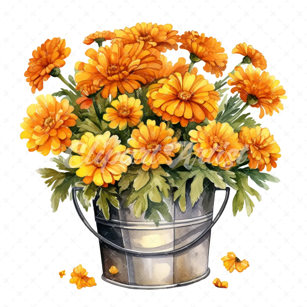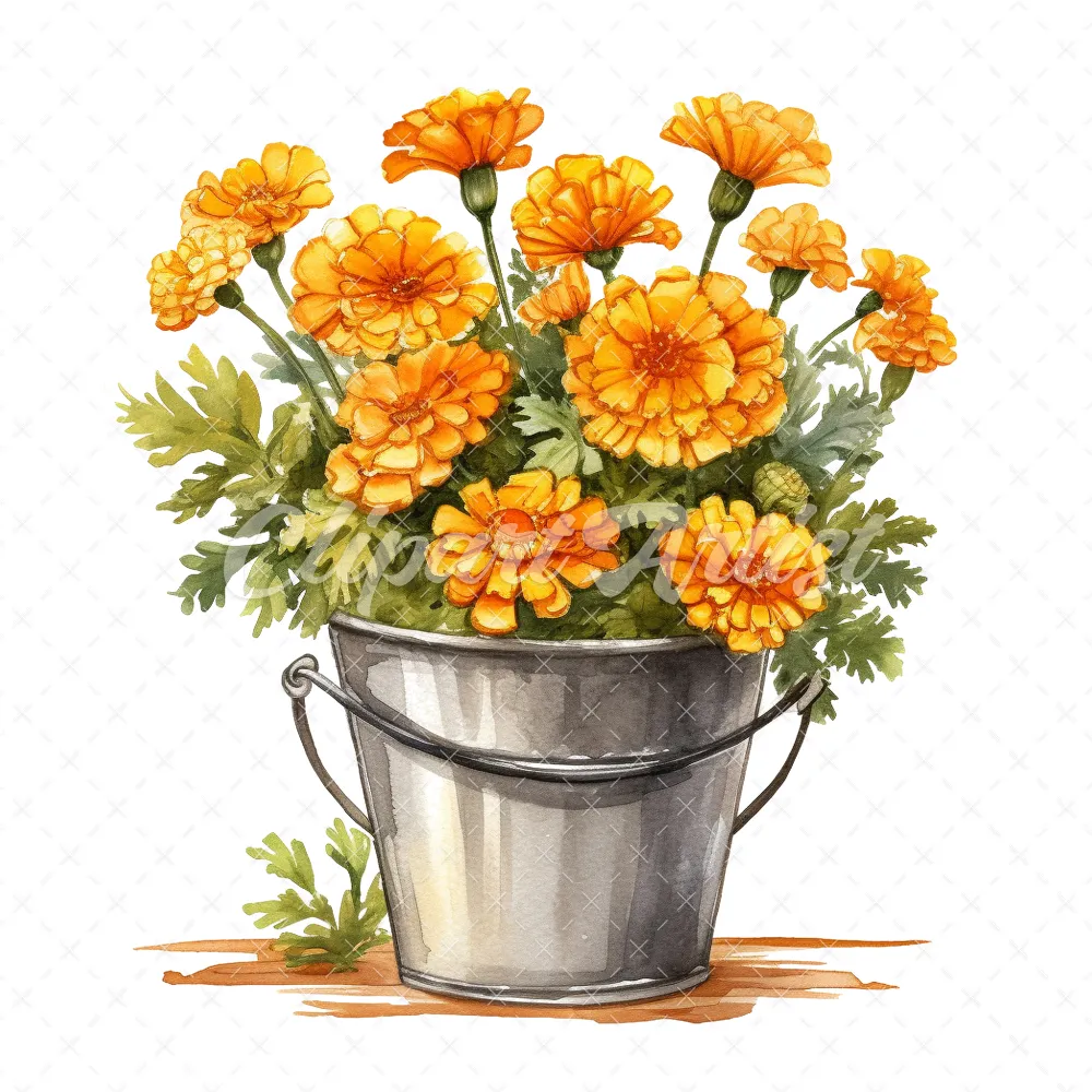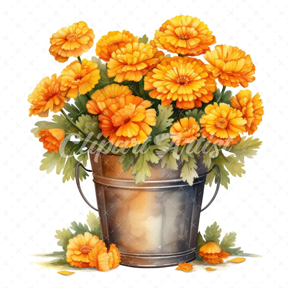 20 High-Quality Marigolds Bucket Clipart – Marigolds bucket digital watercolor JPG instant download for commercial use – Digital download