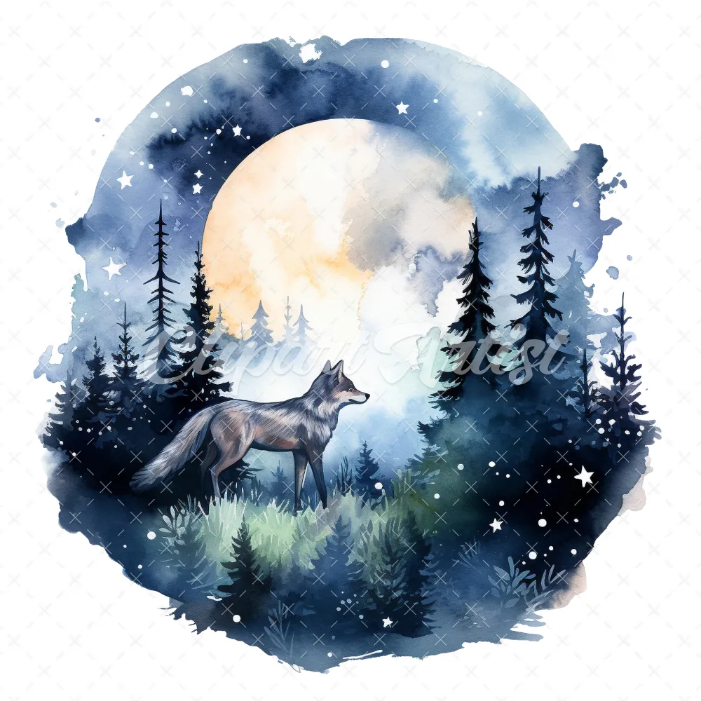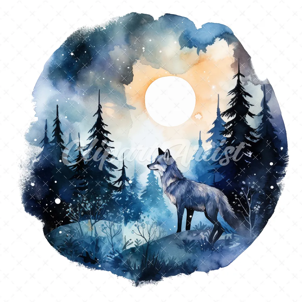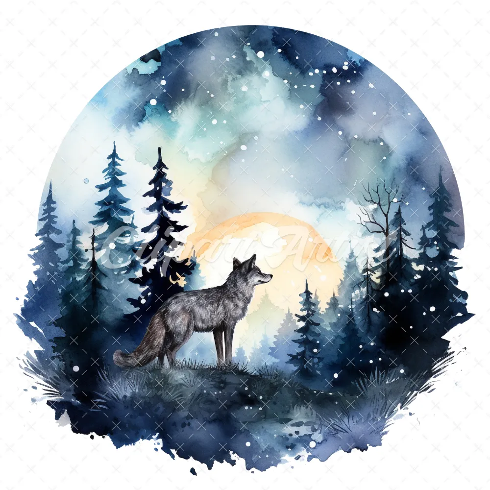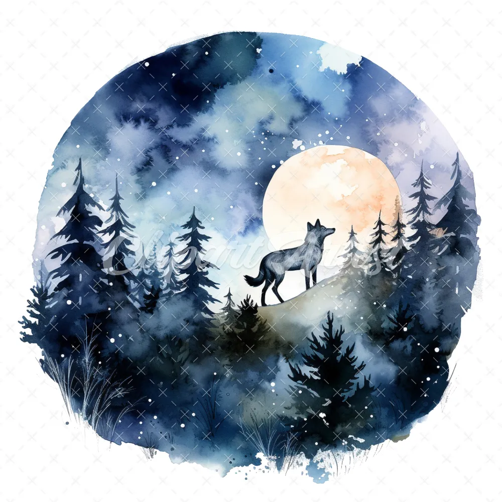 20 High-Quality Night Wolf Clipart – Night wolf digital watercolor JPG instant download for commercial use – Digital download