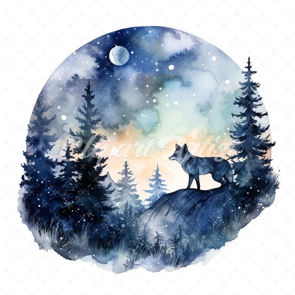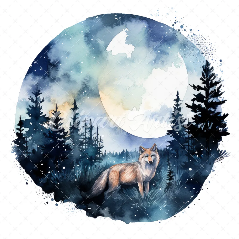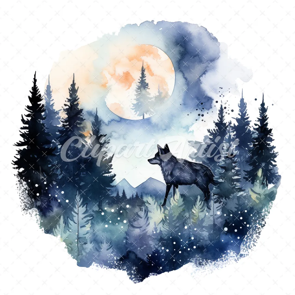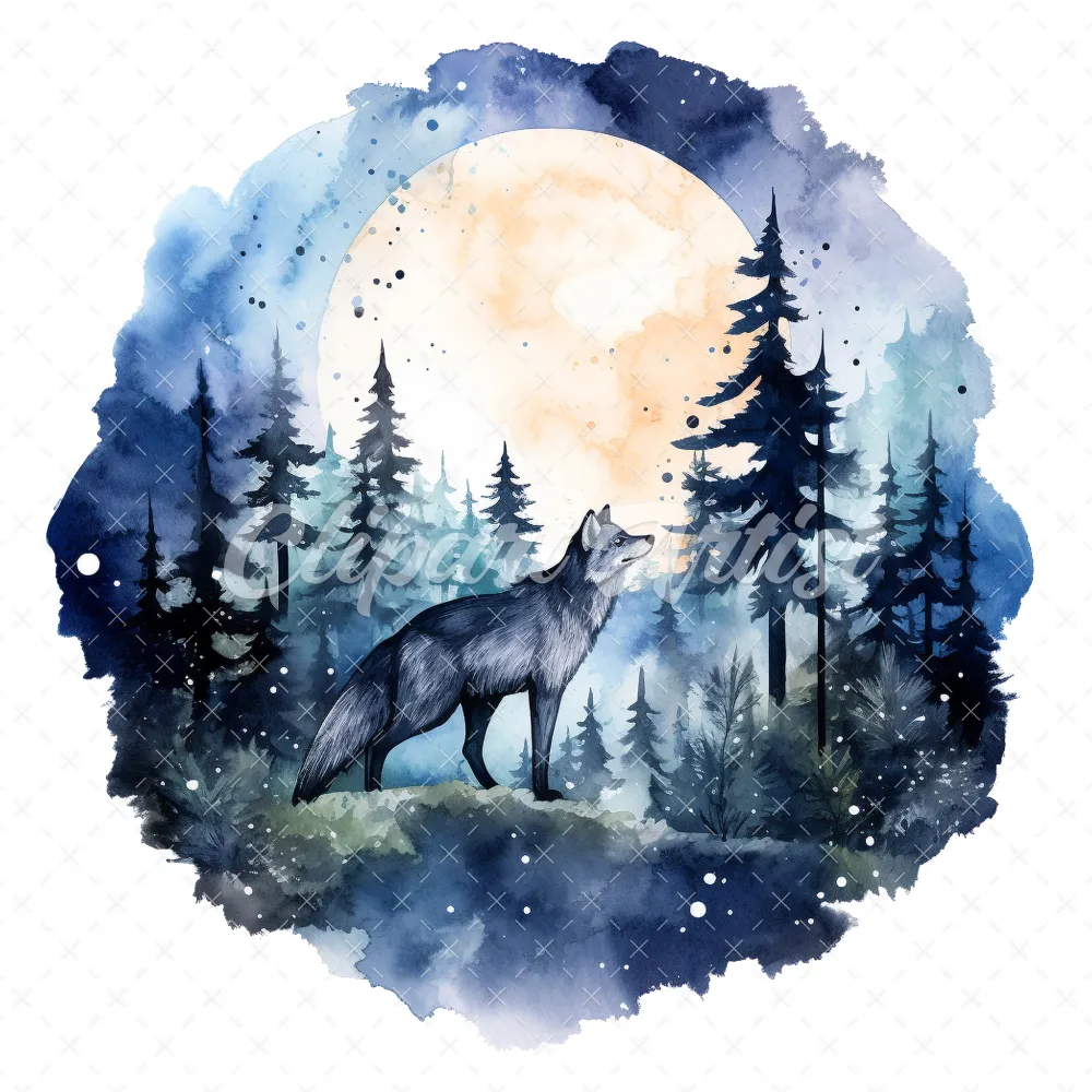 20 High-Quality Night Wolf Clipart – Night wolf digital watercolor JPG instant download for commercial use – Digital download