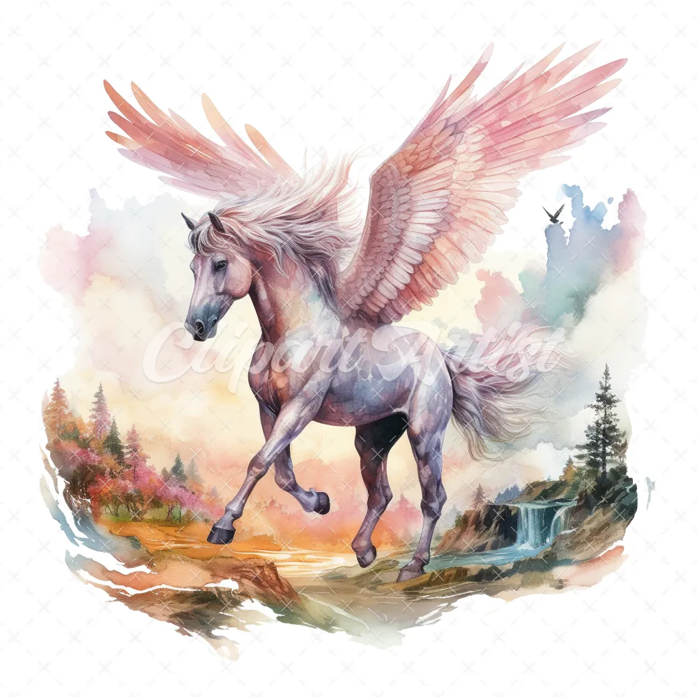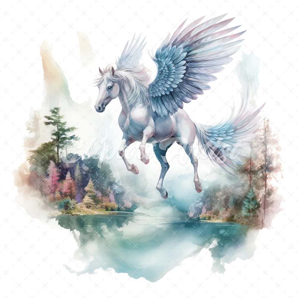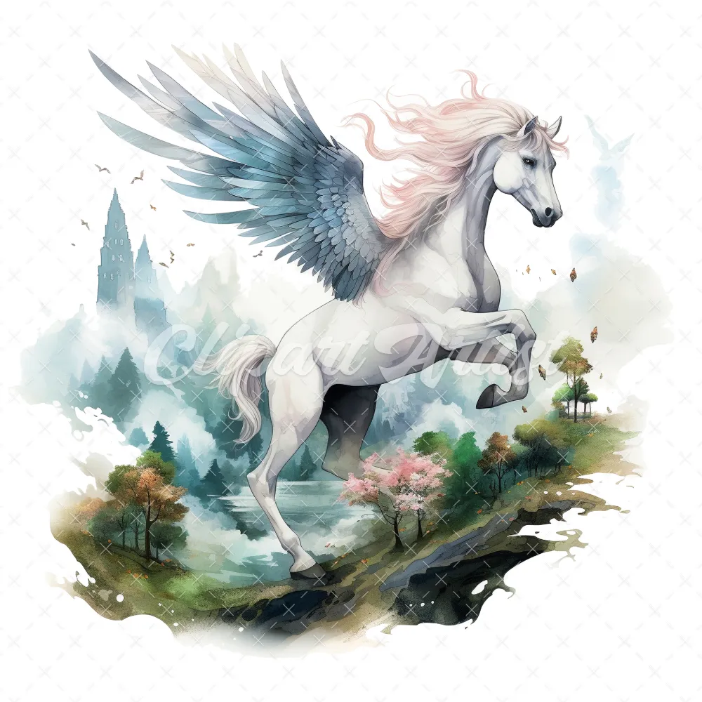 20 High-Quality Pegasus Landscape Clipart – Pegasus digital watercolor JPG instant download for commercial use – Digital download