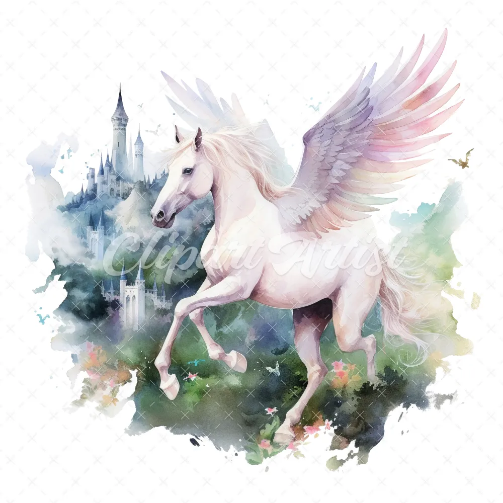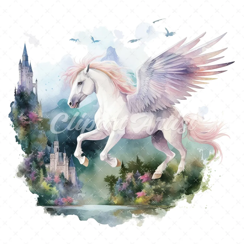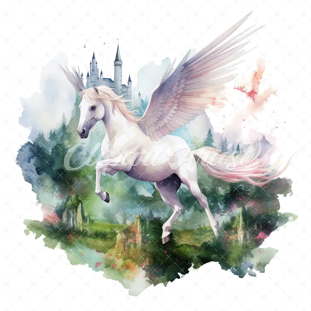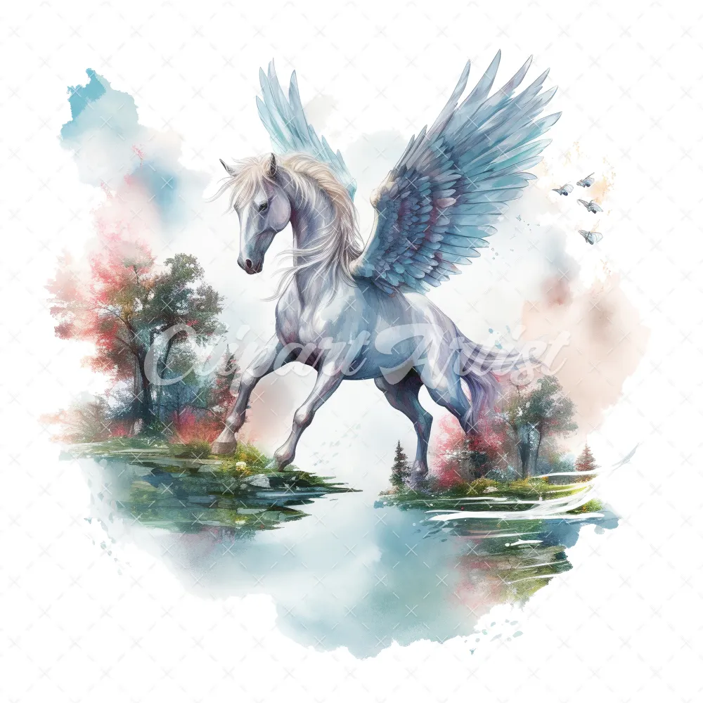 20 High-Quality Pegasus Landscape Clipart – Pegasus digital watercolor JPG instant download for commercial use – Digital download