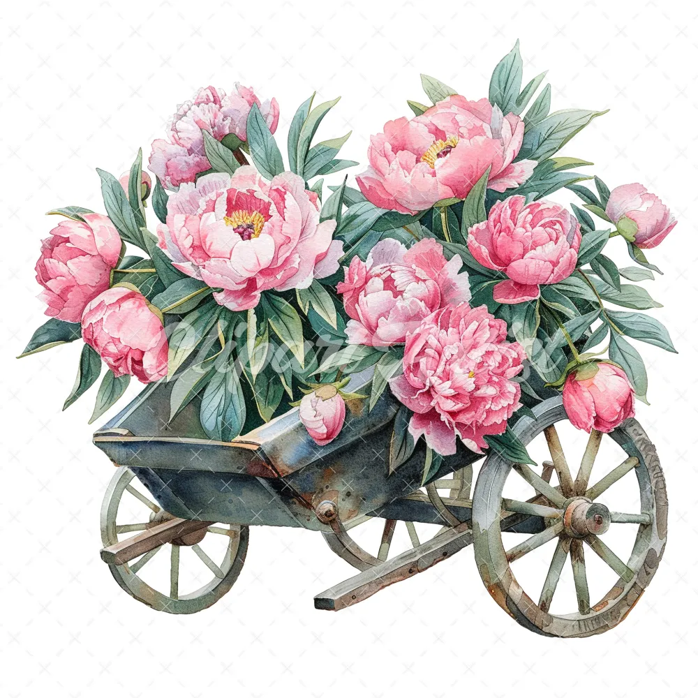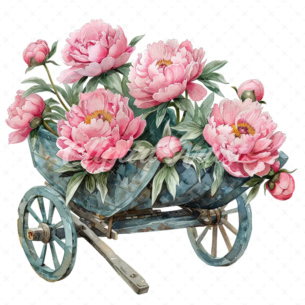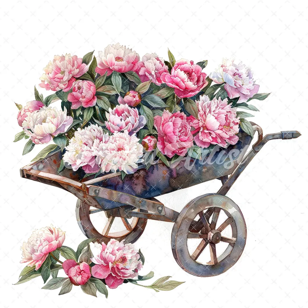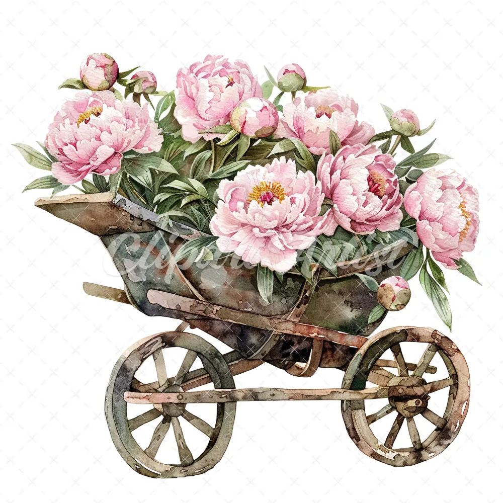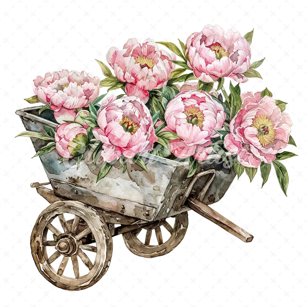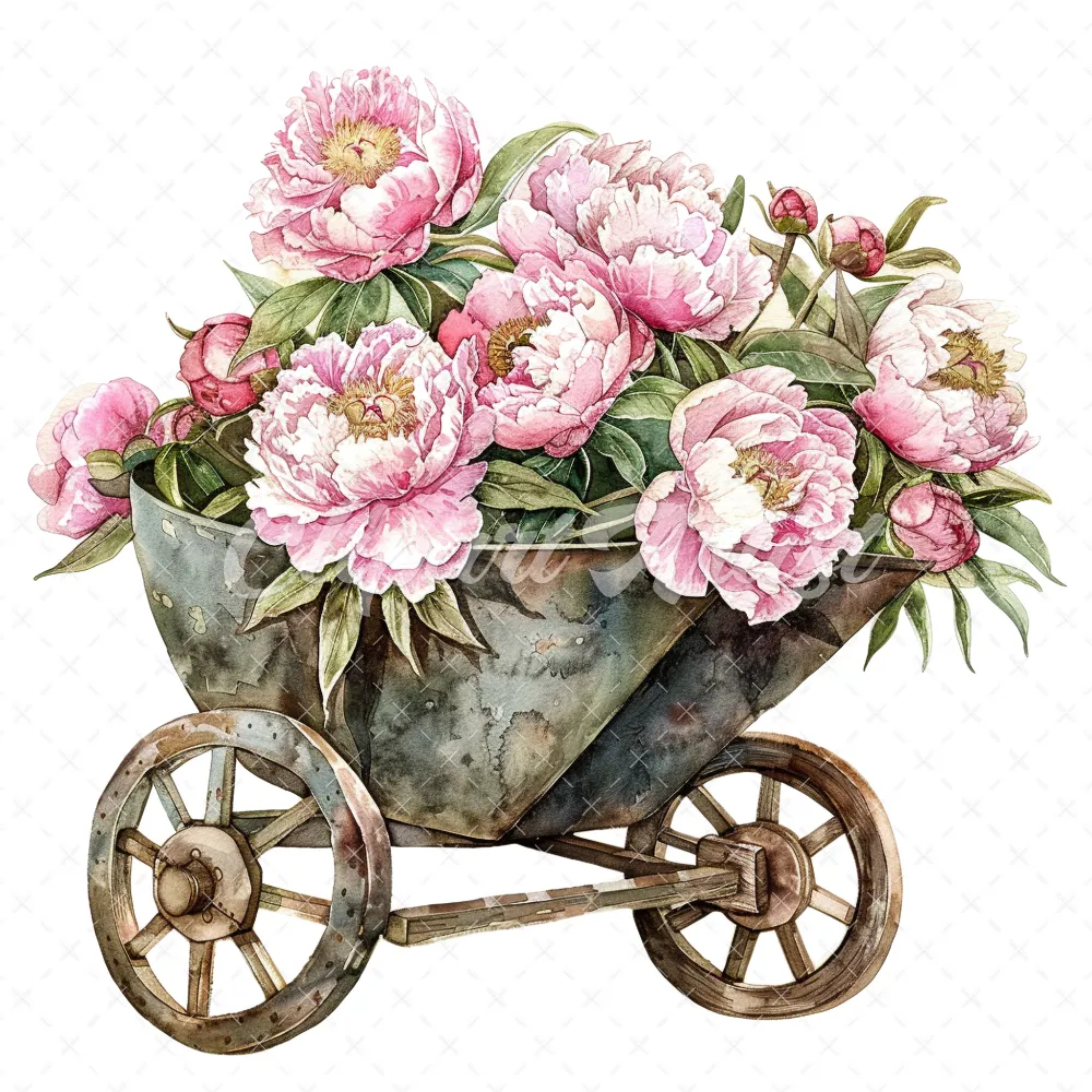 20 High-Quality Peonies Wheelbarrow Clipart – Wheelbarrow digital watercolor JPG instant download for commercial use – Digital download