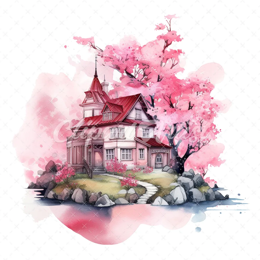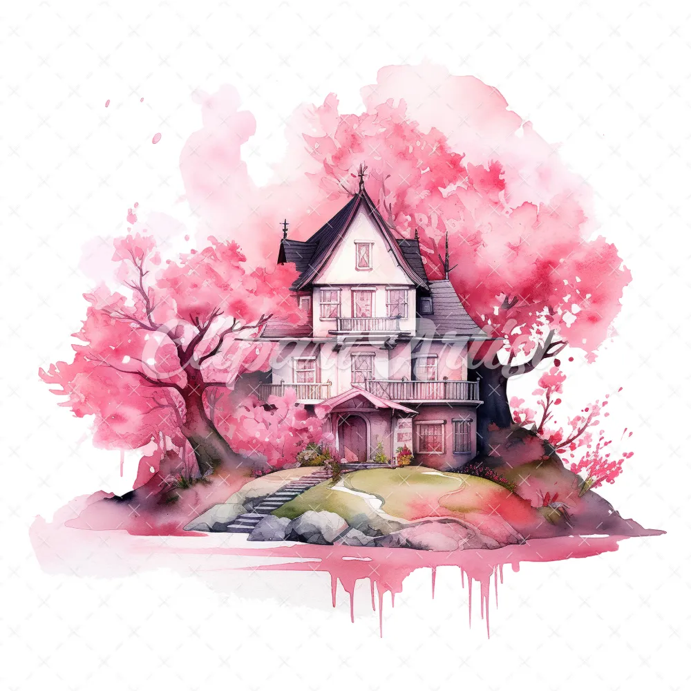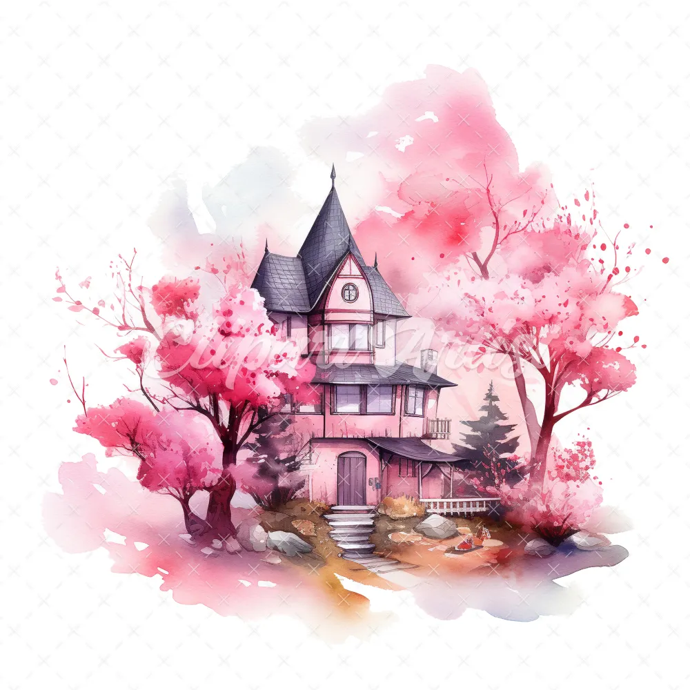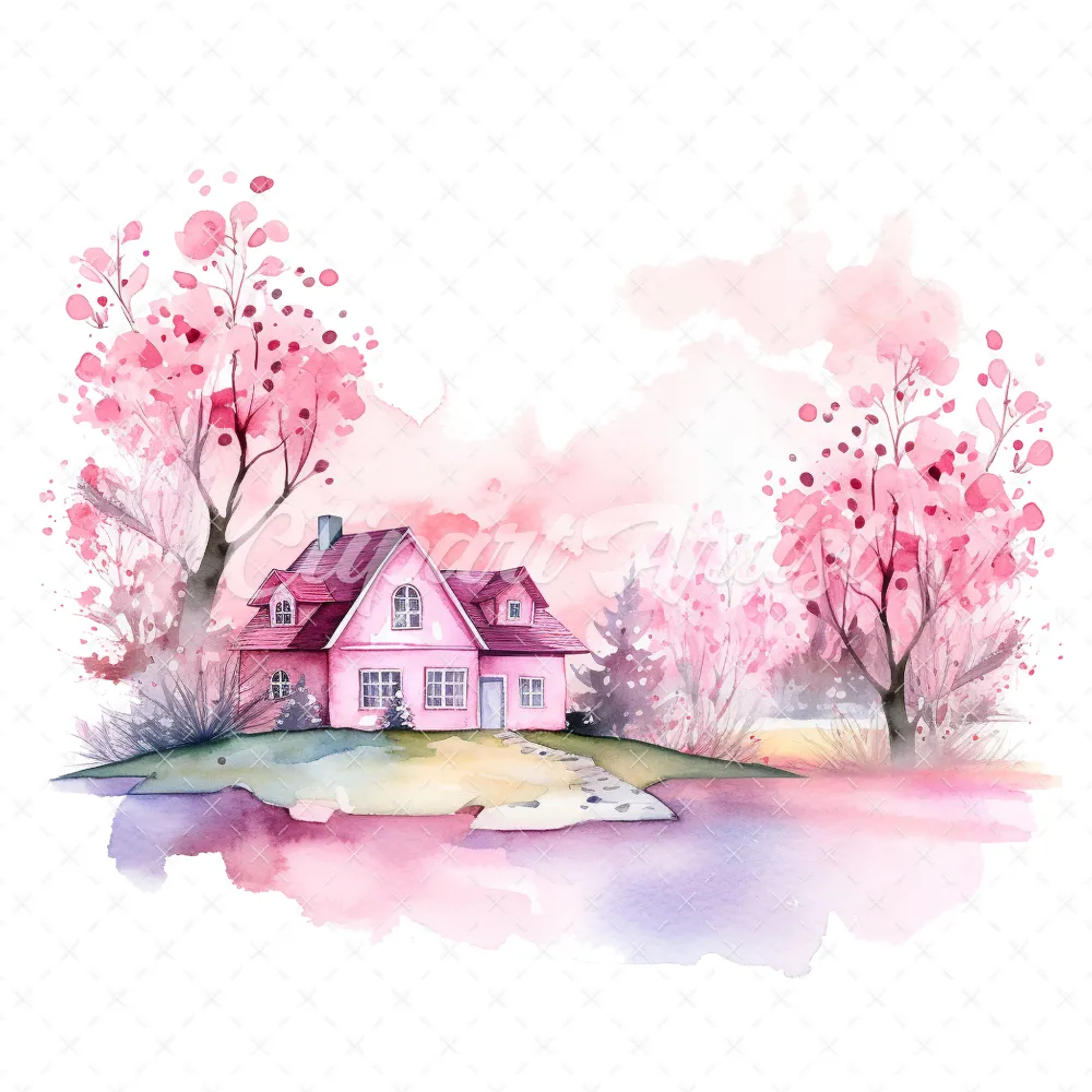 20 High-Quality Pink House Clipart – Pink house digital watercolor JPG instant download for commercial use – Digital download