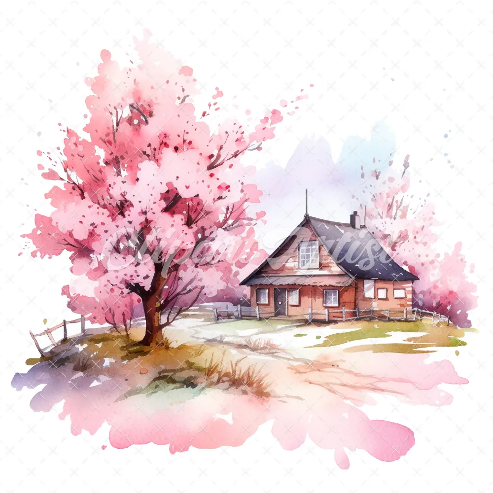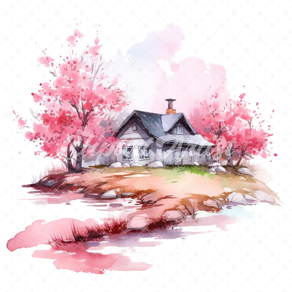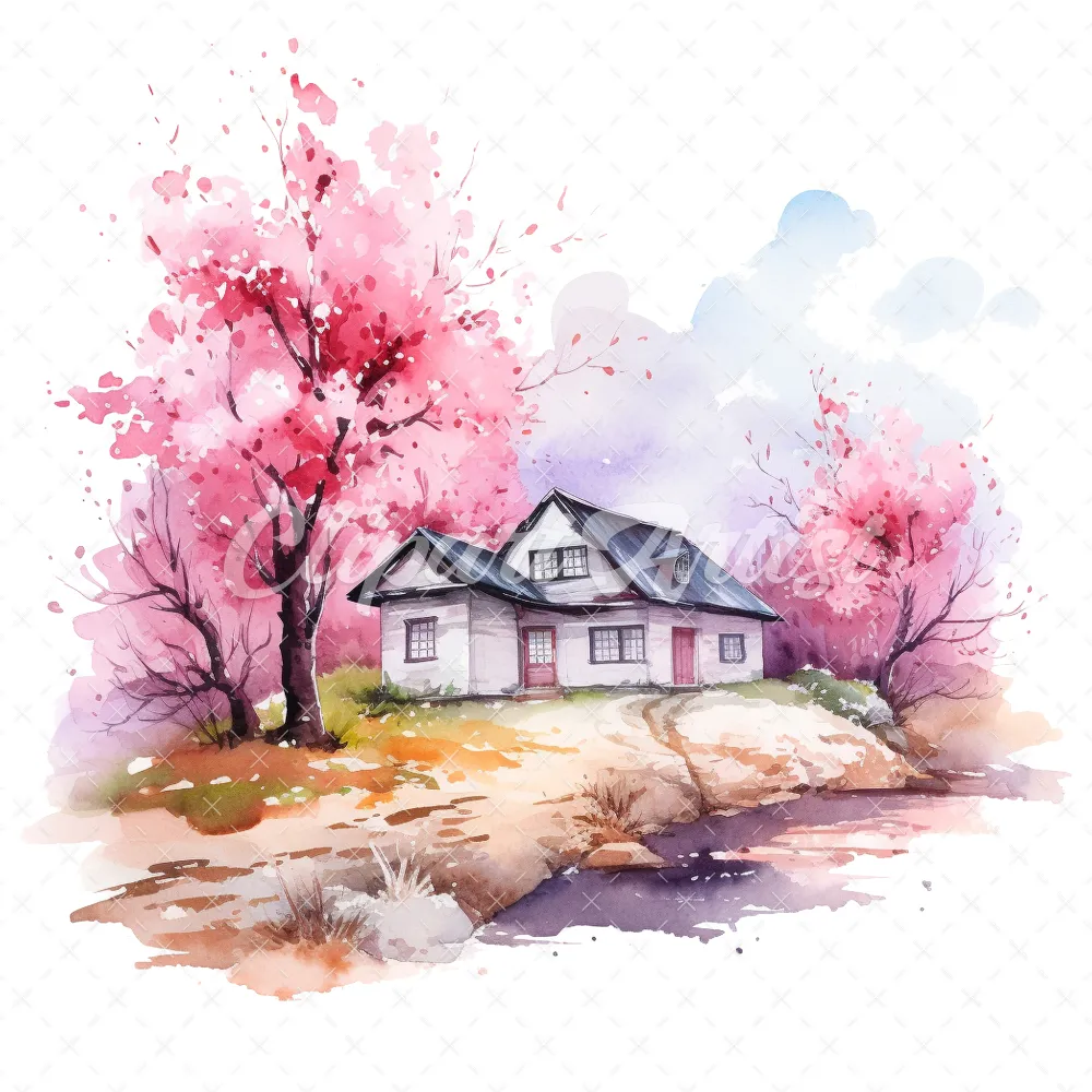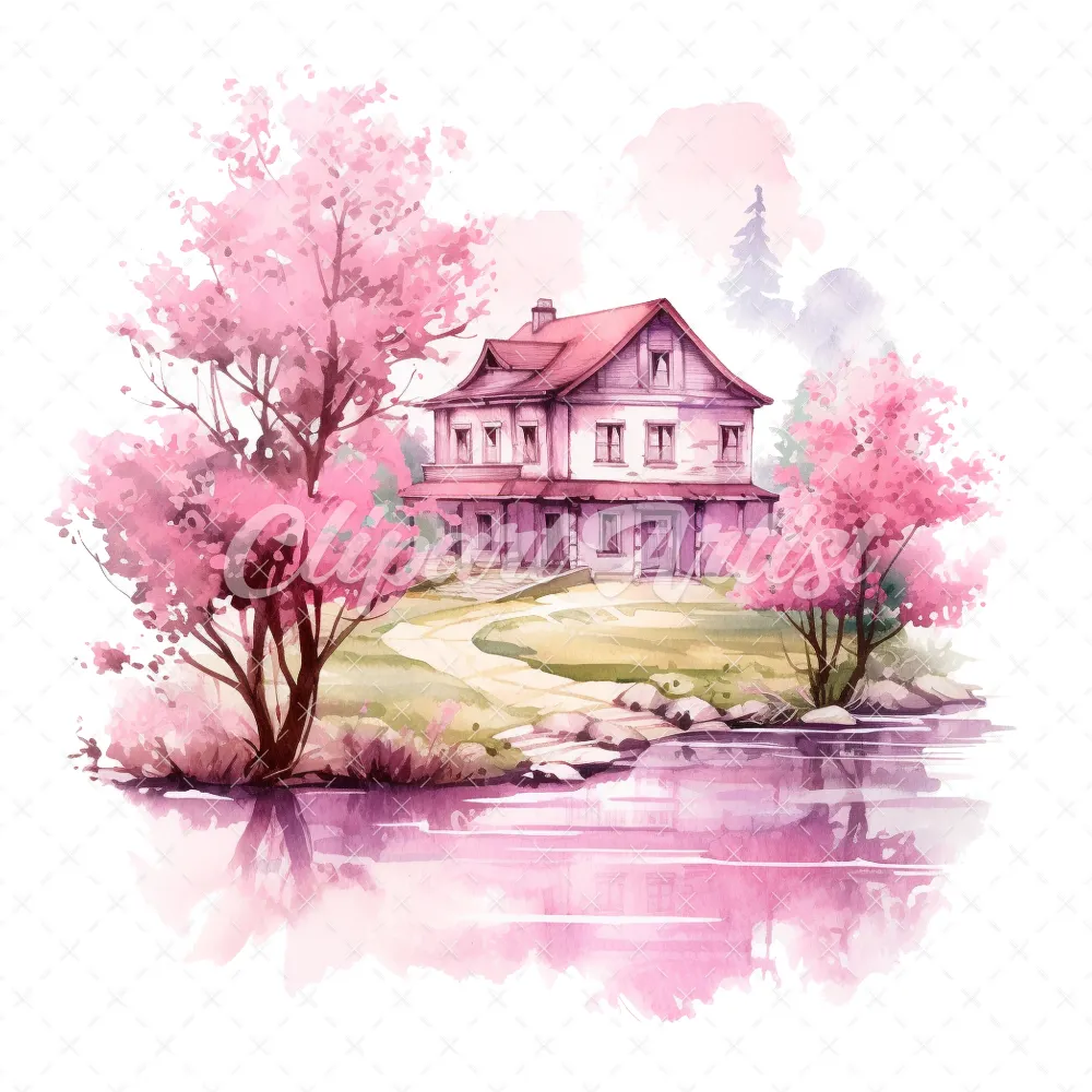 20 High-Quality Pink House Clipart – Pink house digital watercolor JPG instant download for commercial use – Digital download
