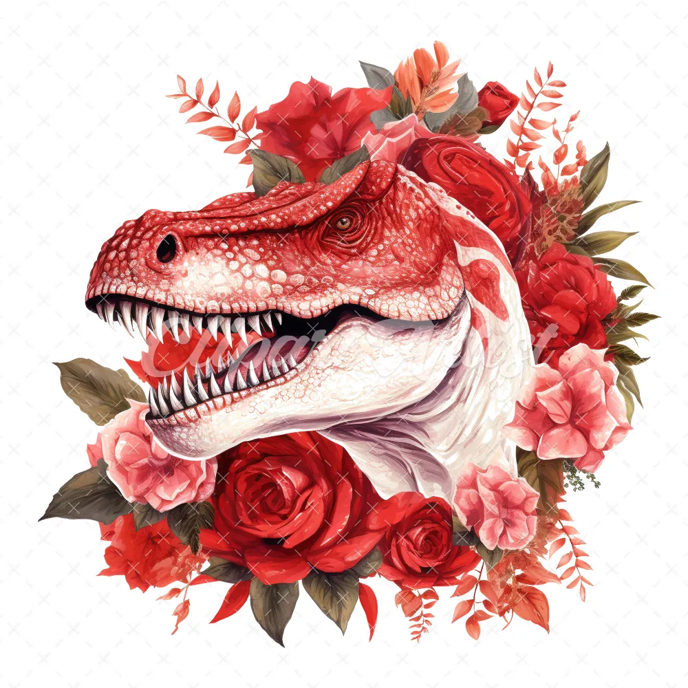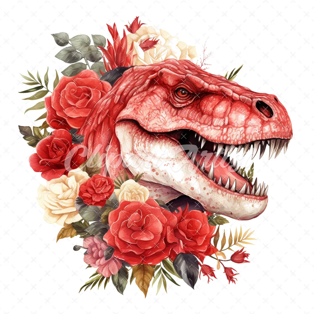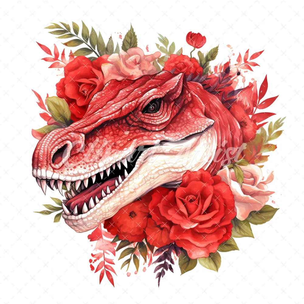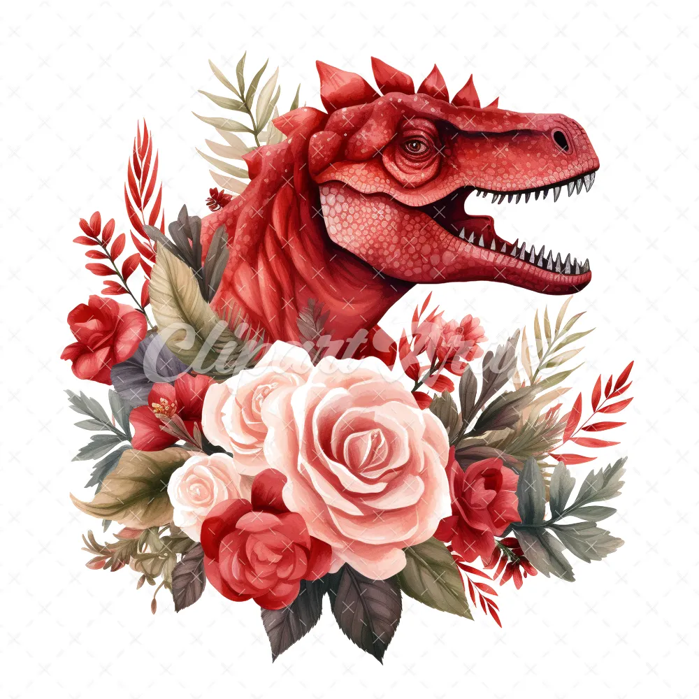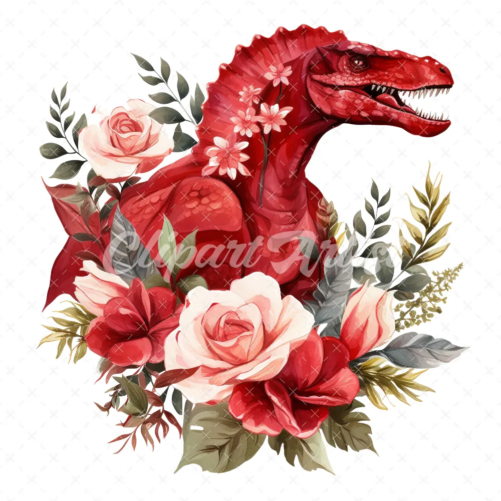 20 High-Quality Red Floral Dinosaur Clipart – Red dinosaur digital watercolor JPG instant download for commercial use – Digital download