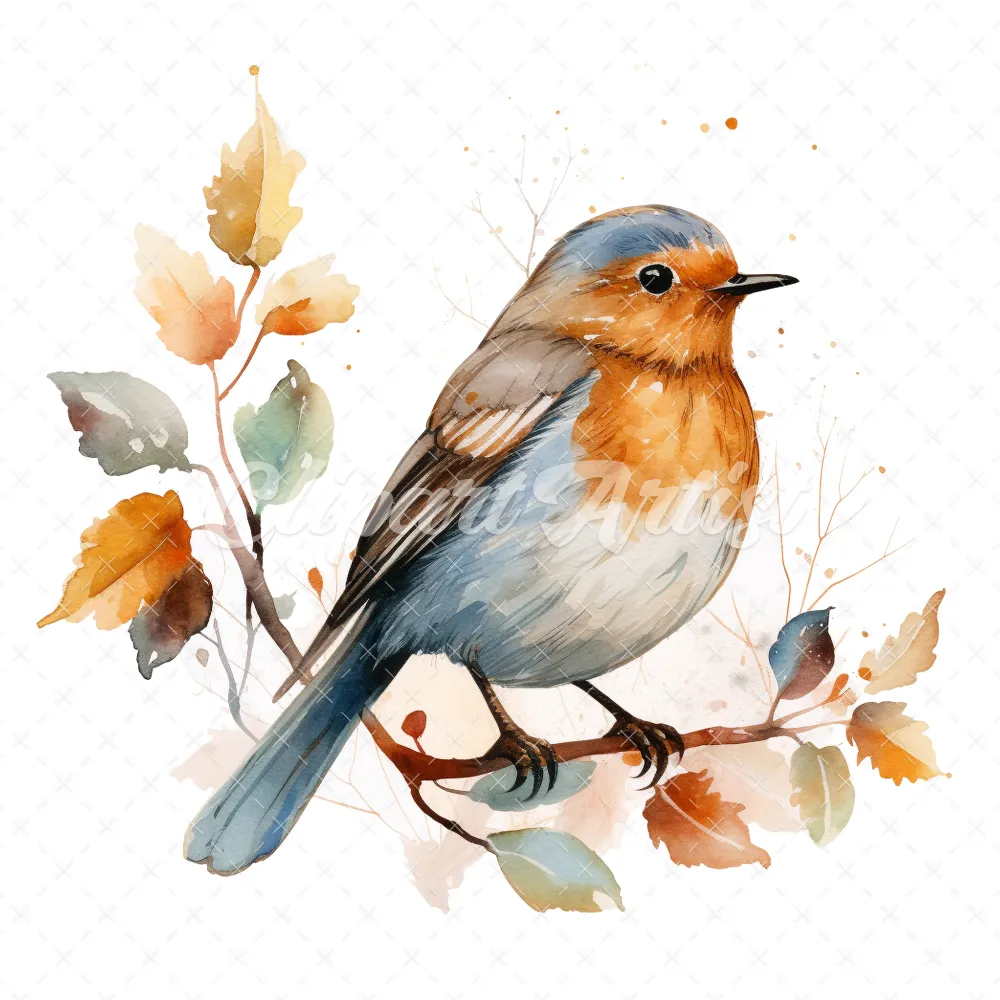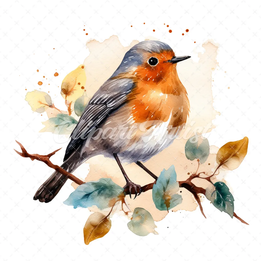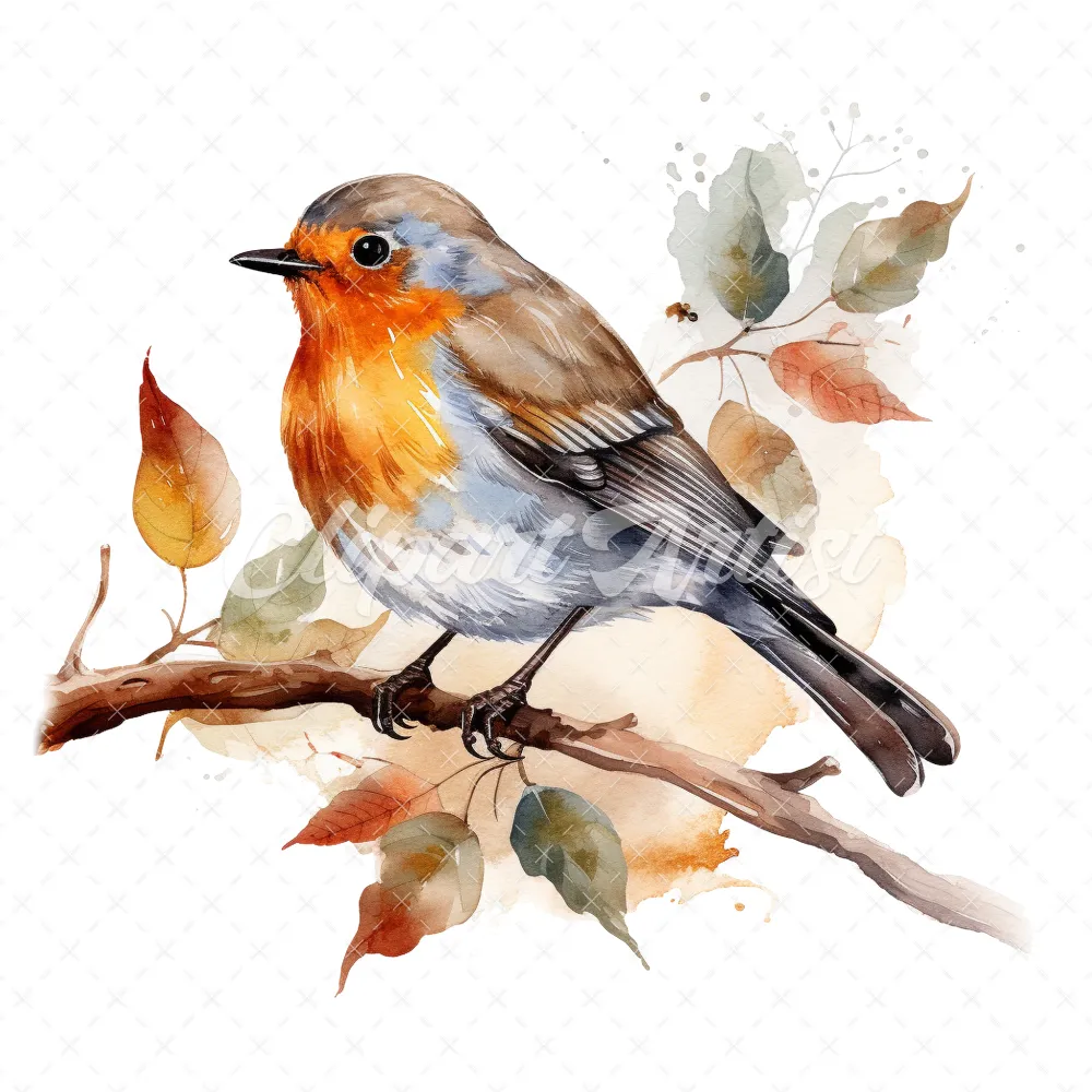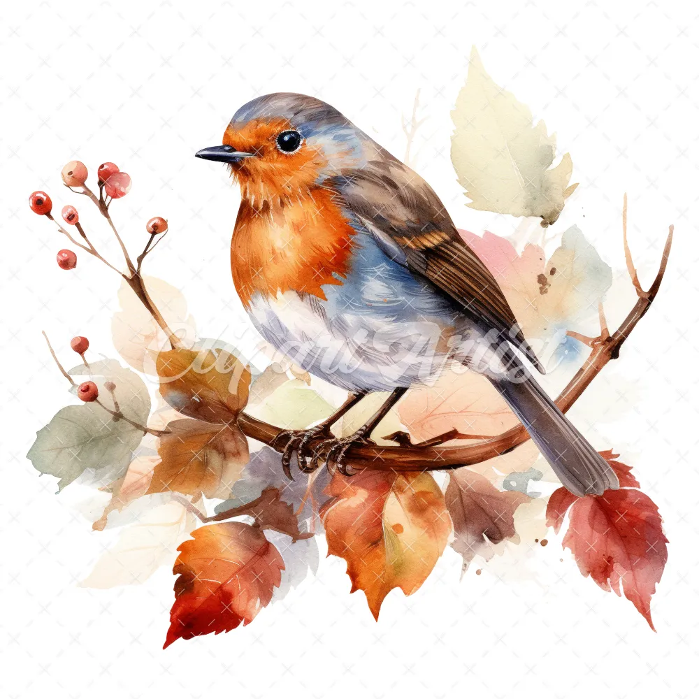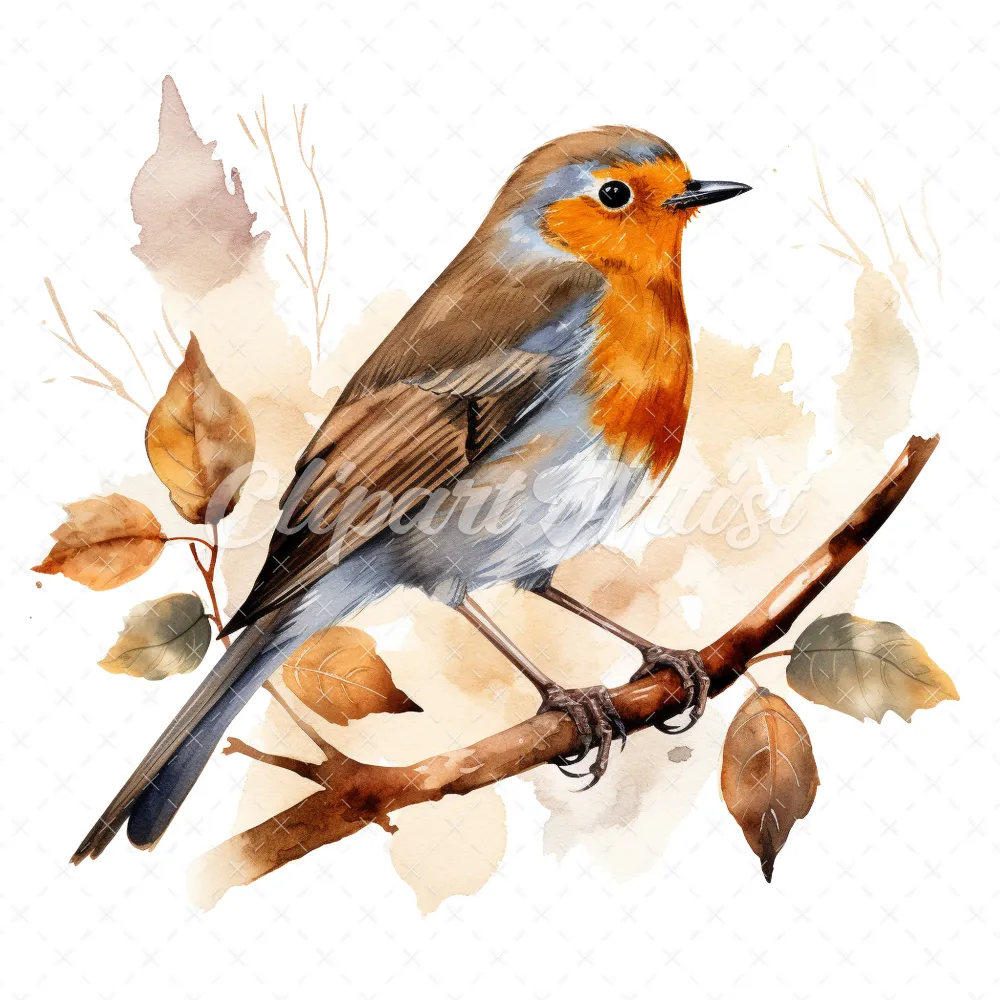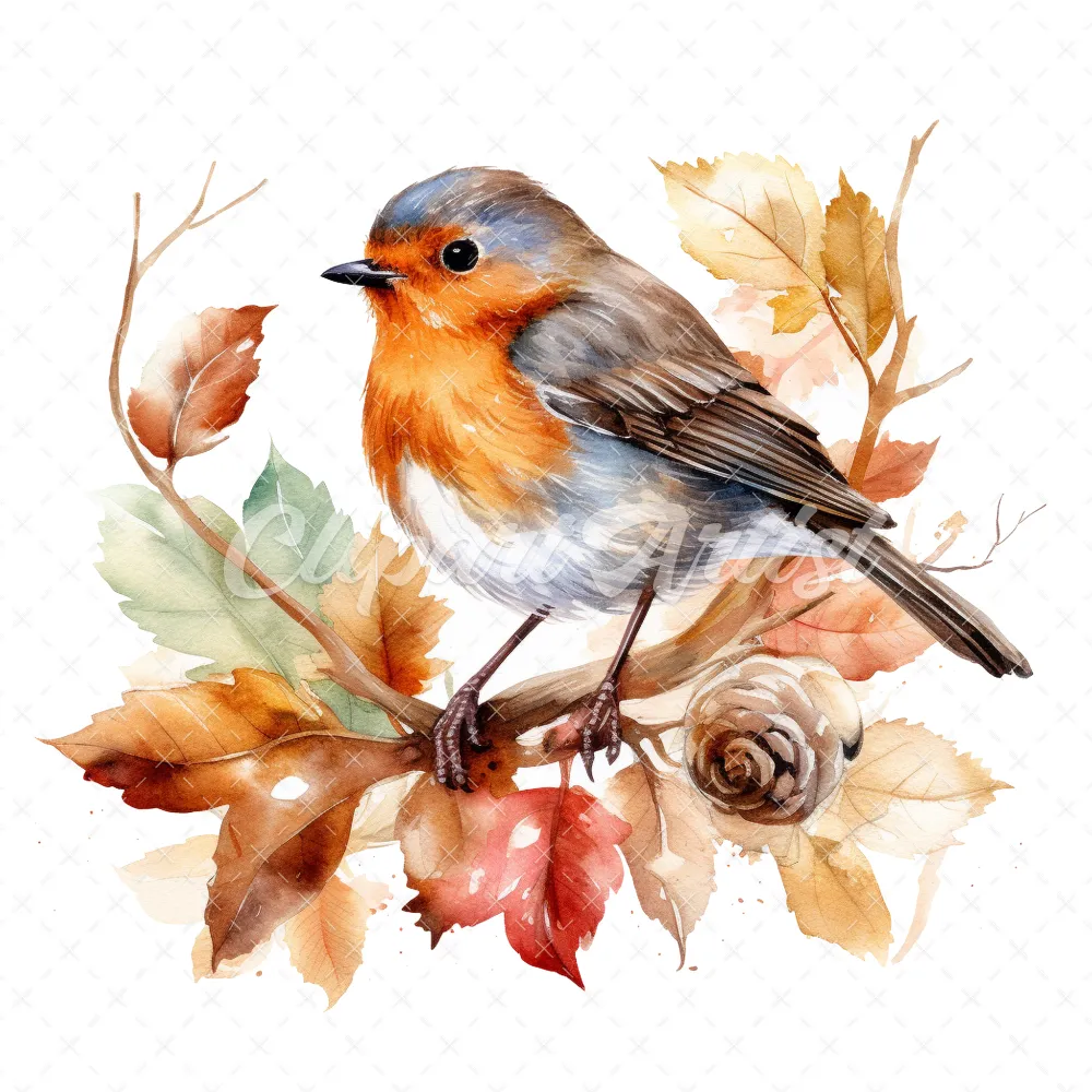 20 High-Quality Robin on Dry Leaf Clipart – Birds digital watercolor JPG instant download for commercial use – Digital download