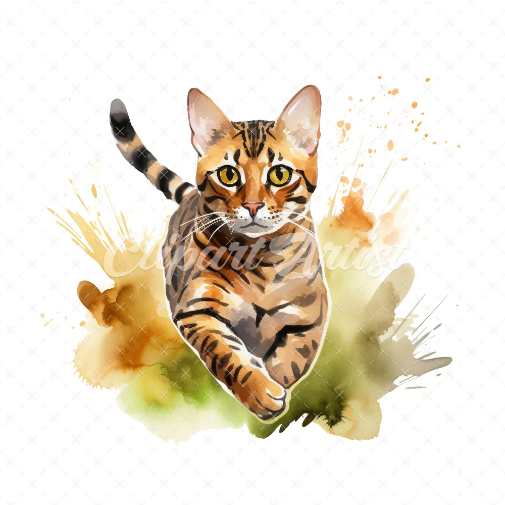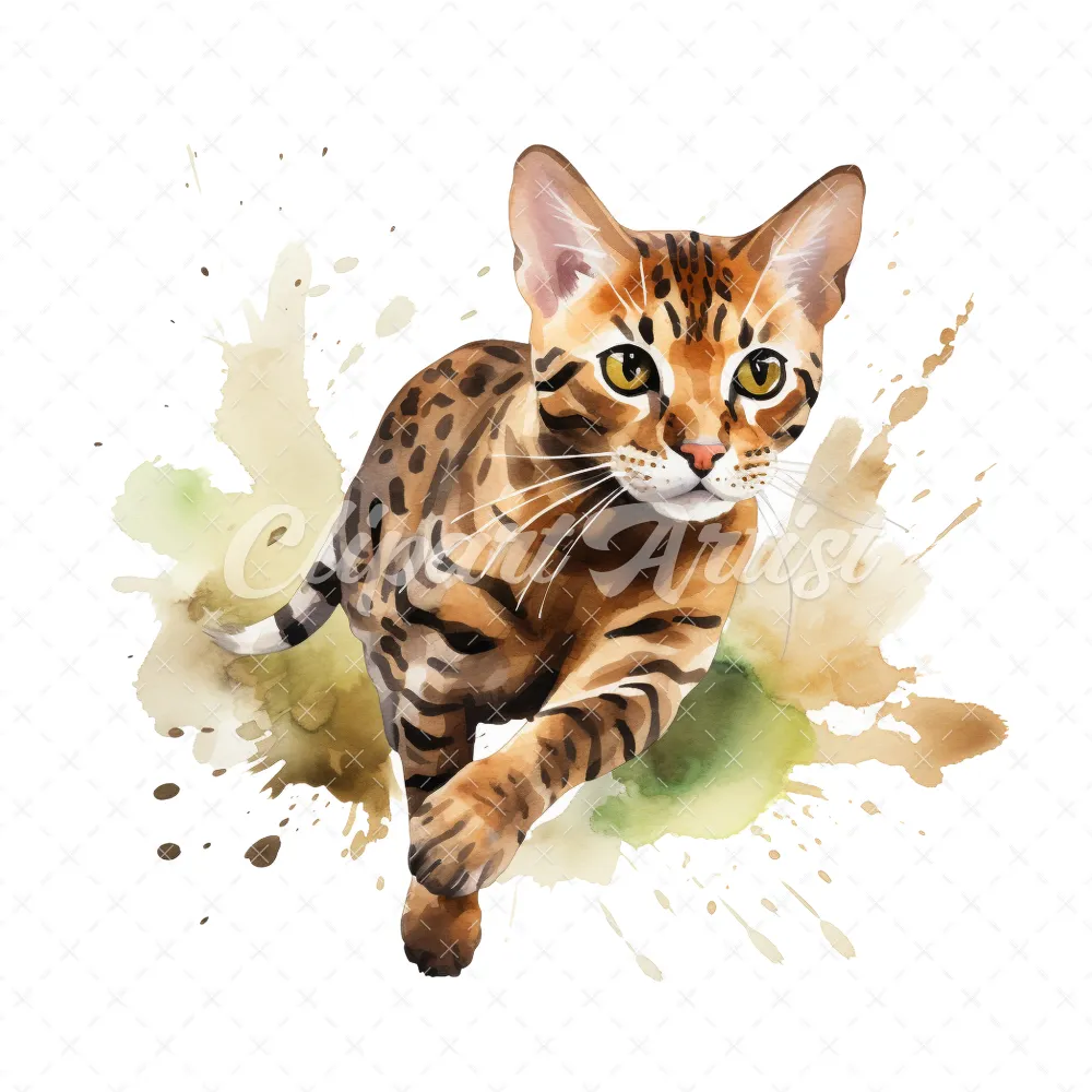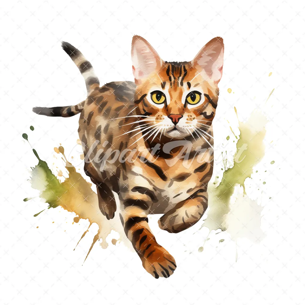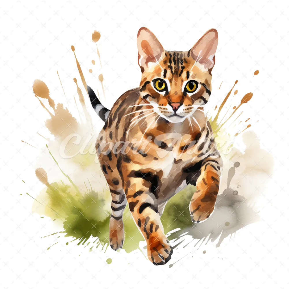 20 High-Quality Running Bengal Cat Clipart – Bengal cat digital watercolor JPG instant download for commercial use – Digital download