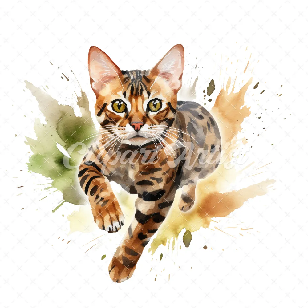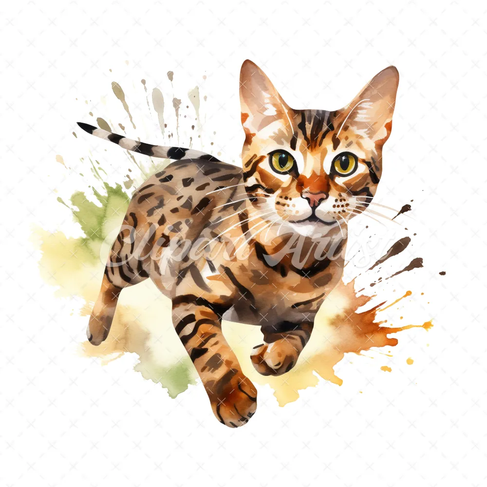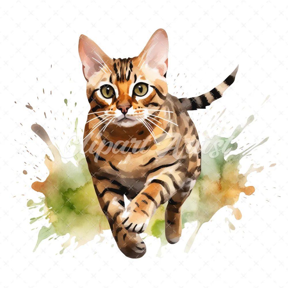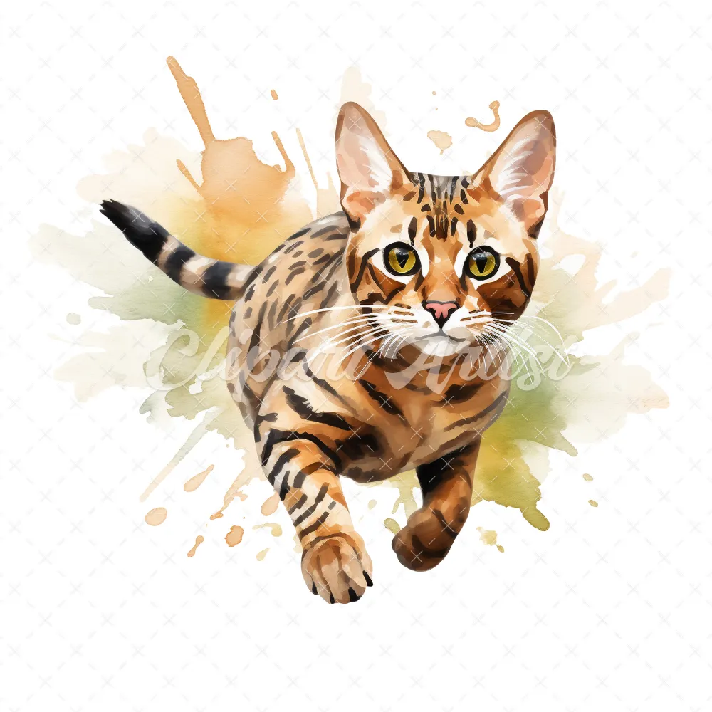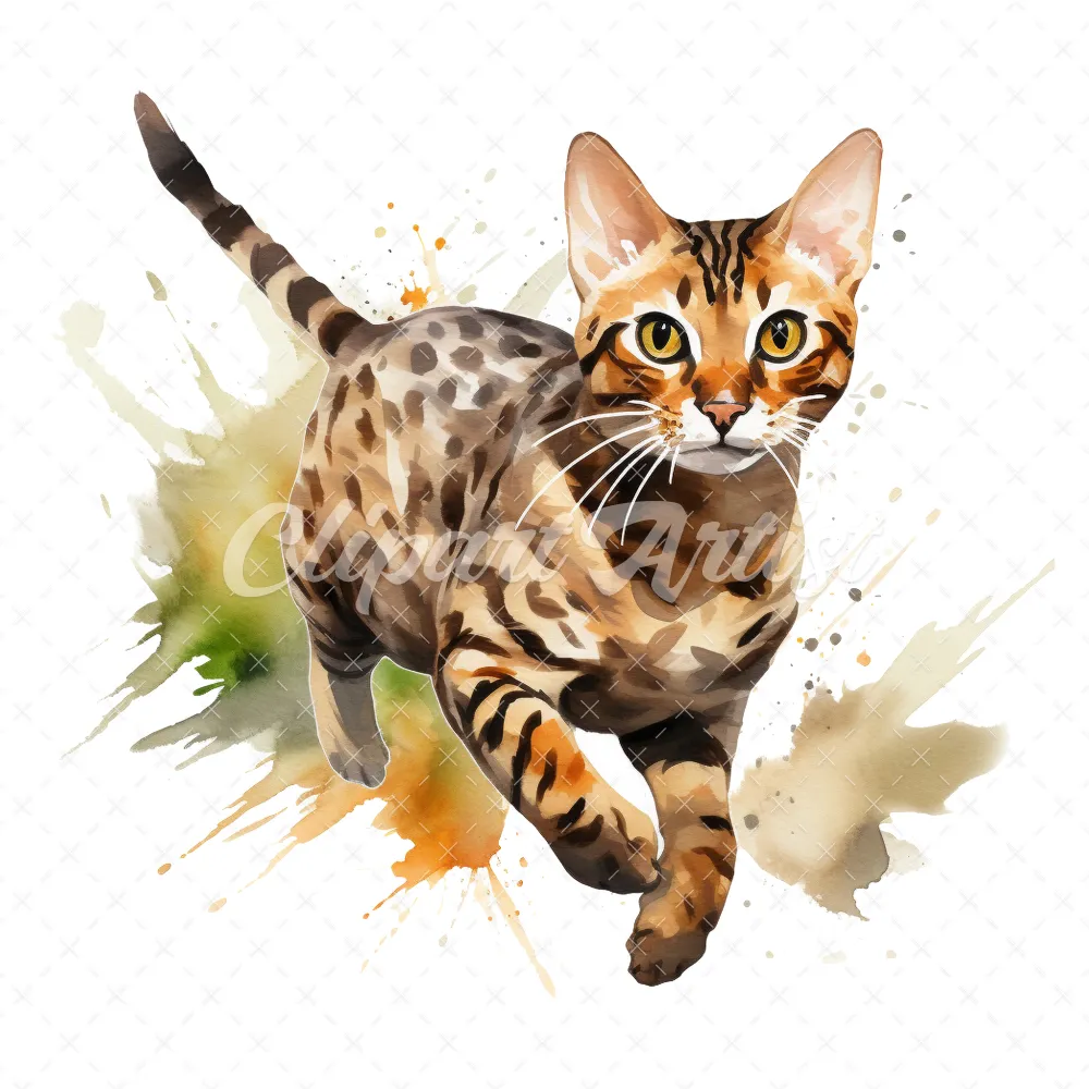 20 High-Quality Running Bengal Cat Clipart – Bengal cat digital watercolor JPG instant download for commercial use – Digital download