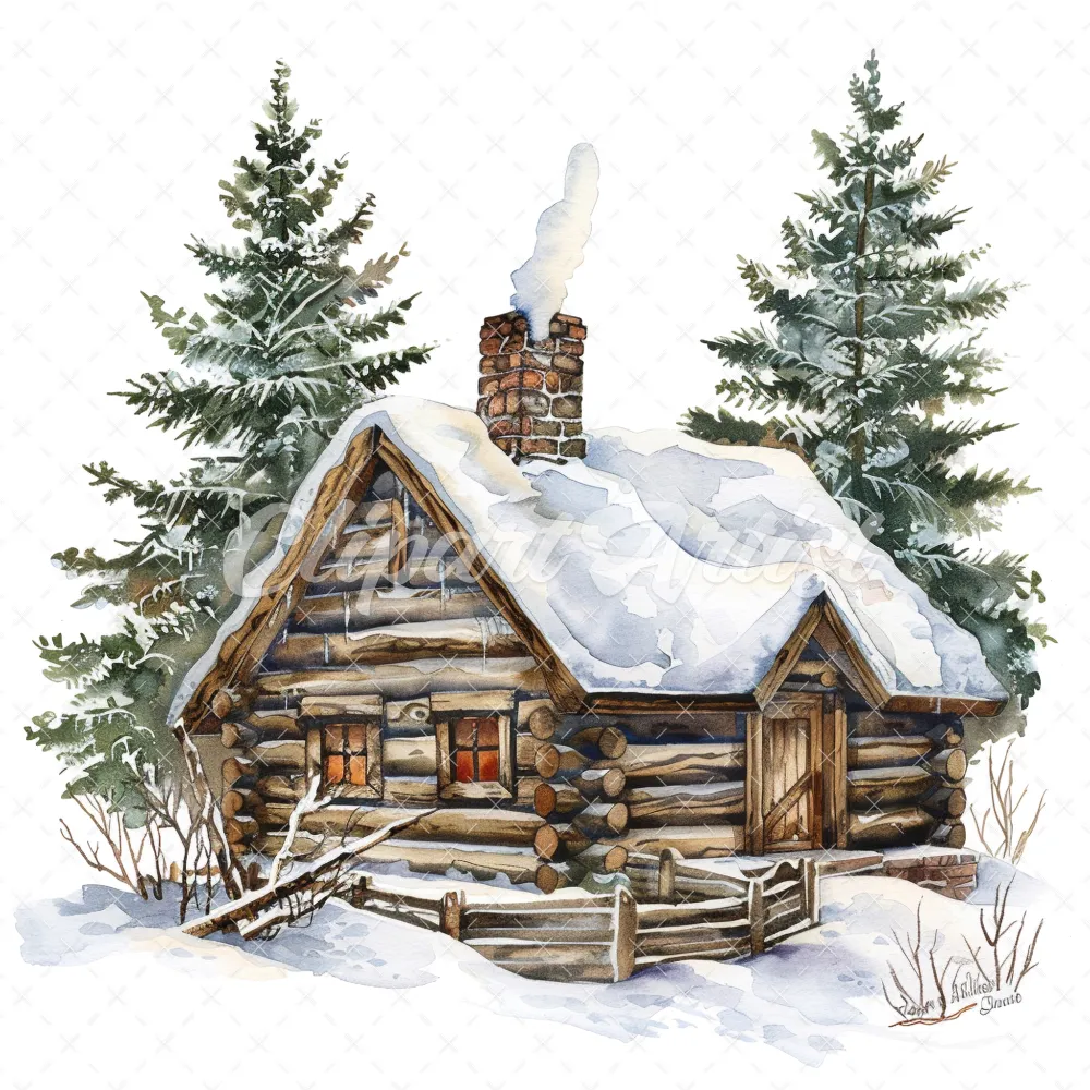 20 High-Quality Snowy Log Cabin Clipart – Snowy log cabin digital watercolor JPG instant download for commercial use – Digital download