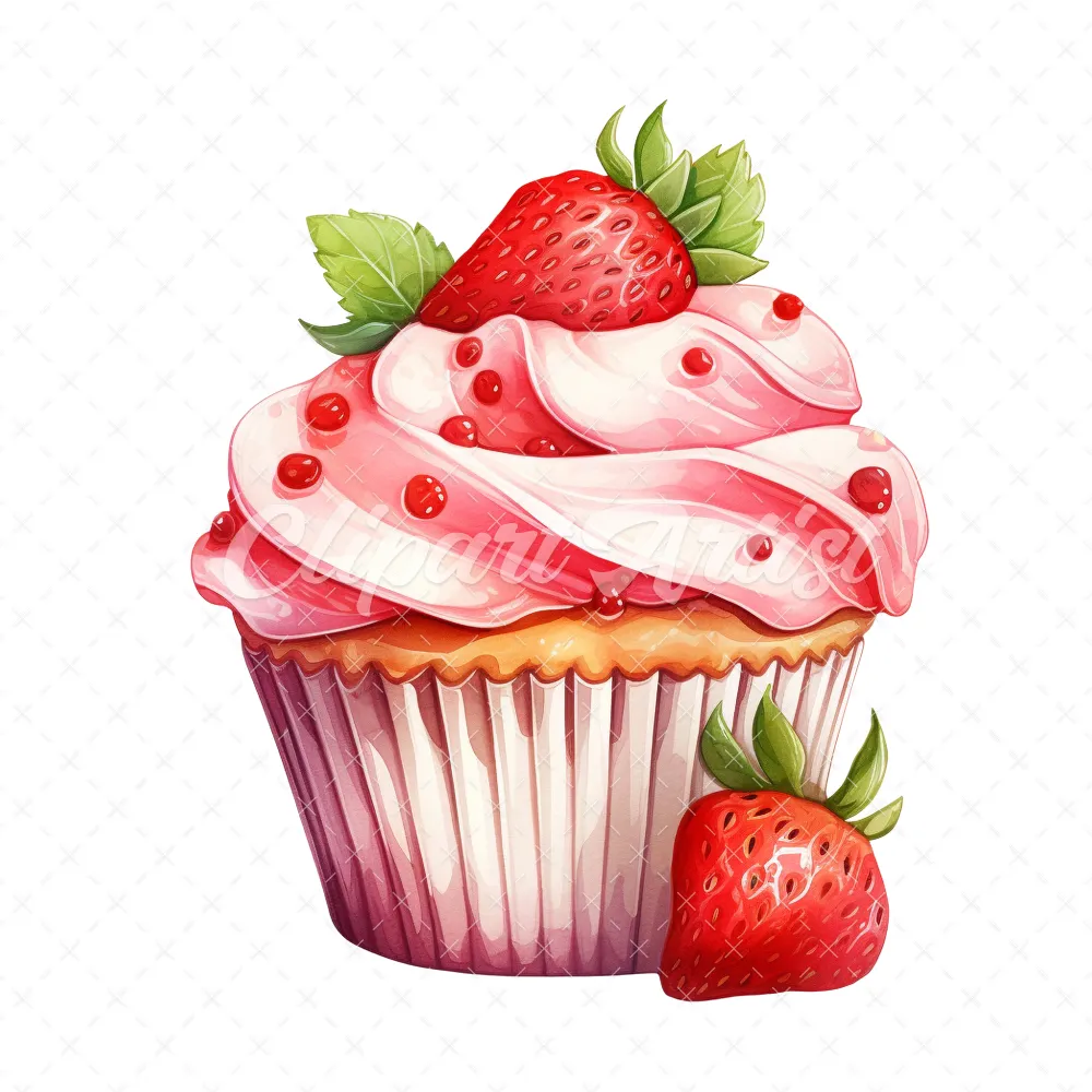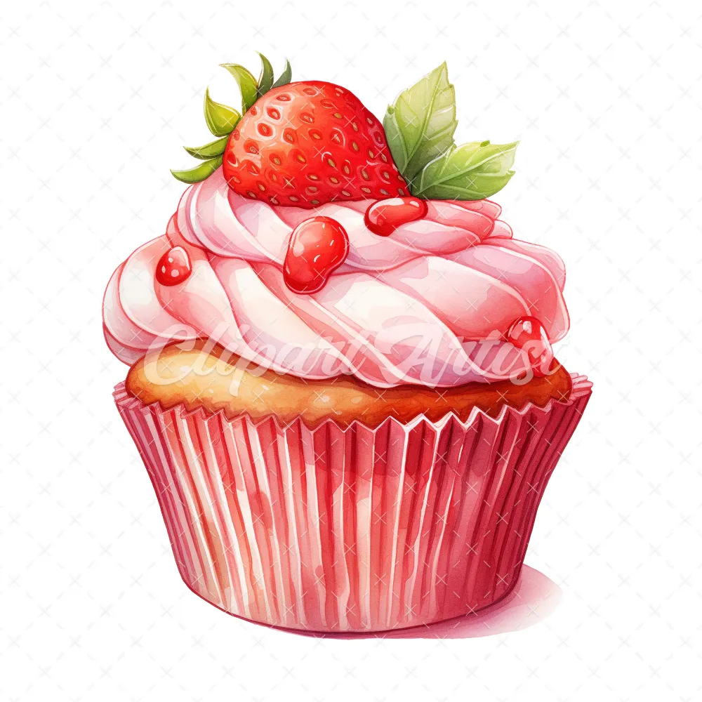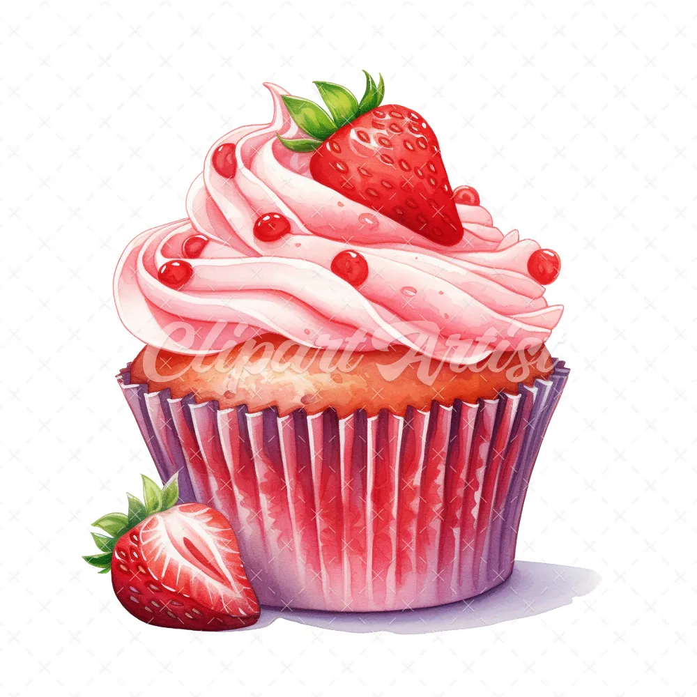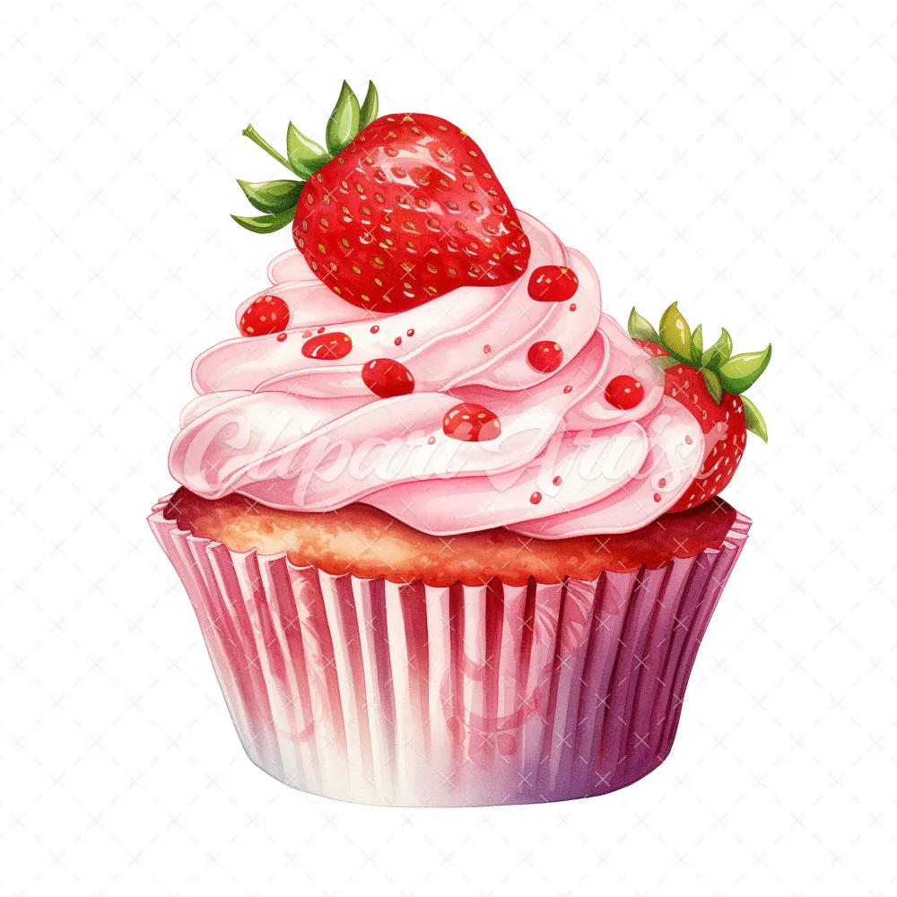 20 High-Quality Strawberry Cupcake Clipart – Cupcake digital watercolor JPG instant download for commercial use – Digital download