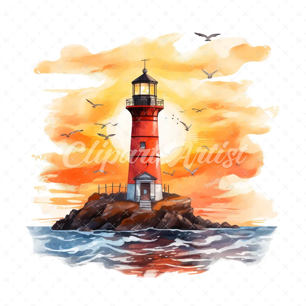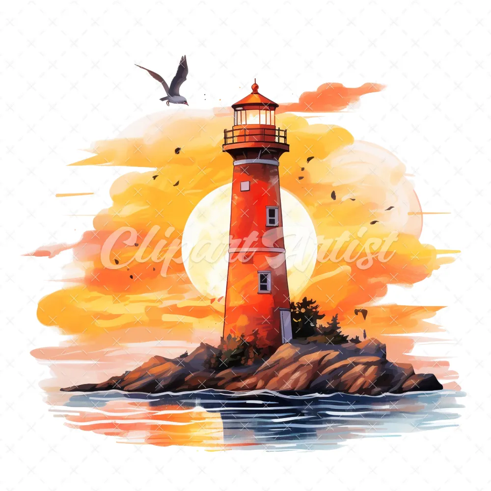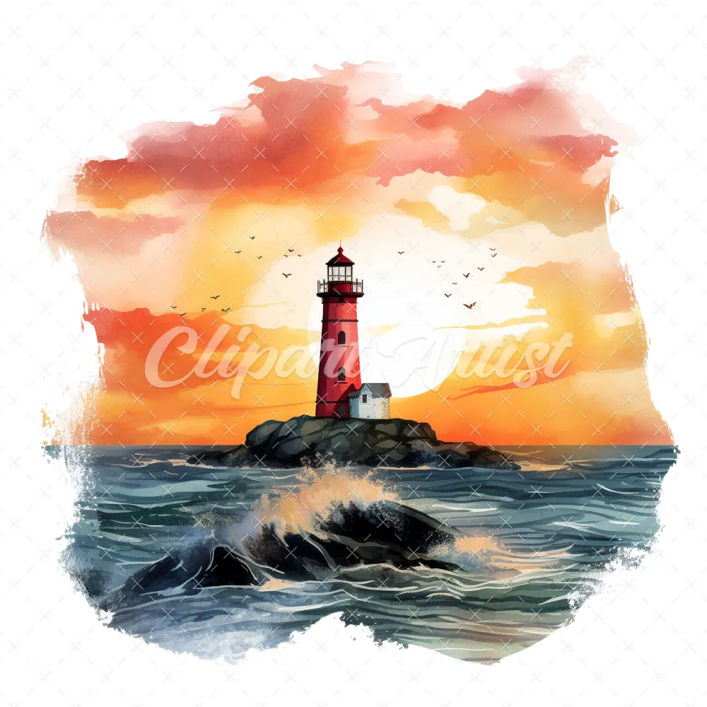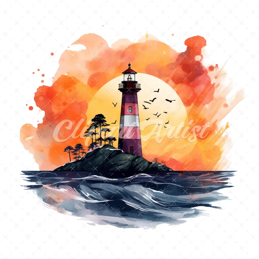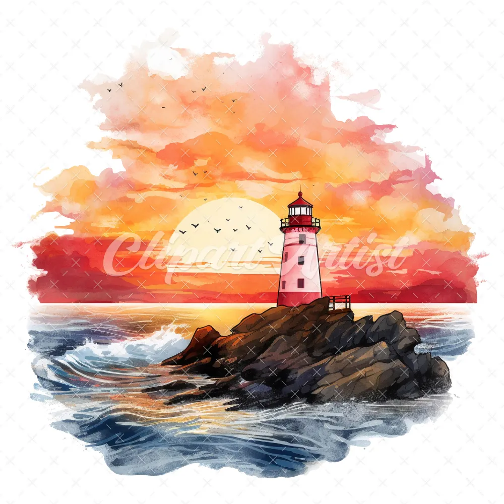 20 High-Quality Sunset Lighthouse Clipart – Sunset lighthouse digital watercolor JPG instant download for commercial use – Digital download