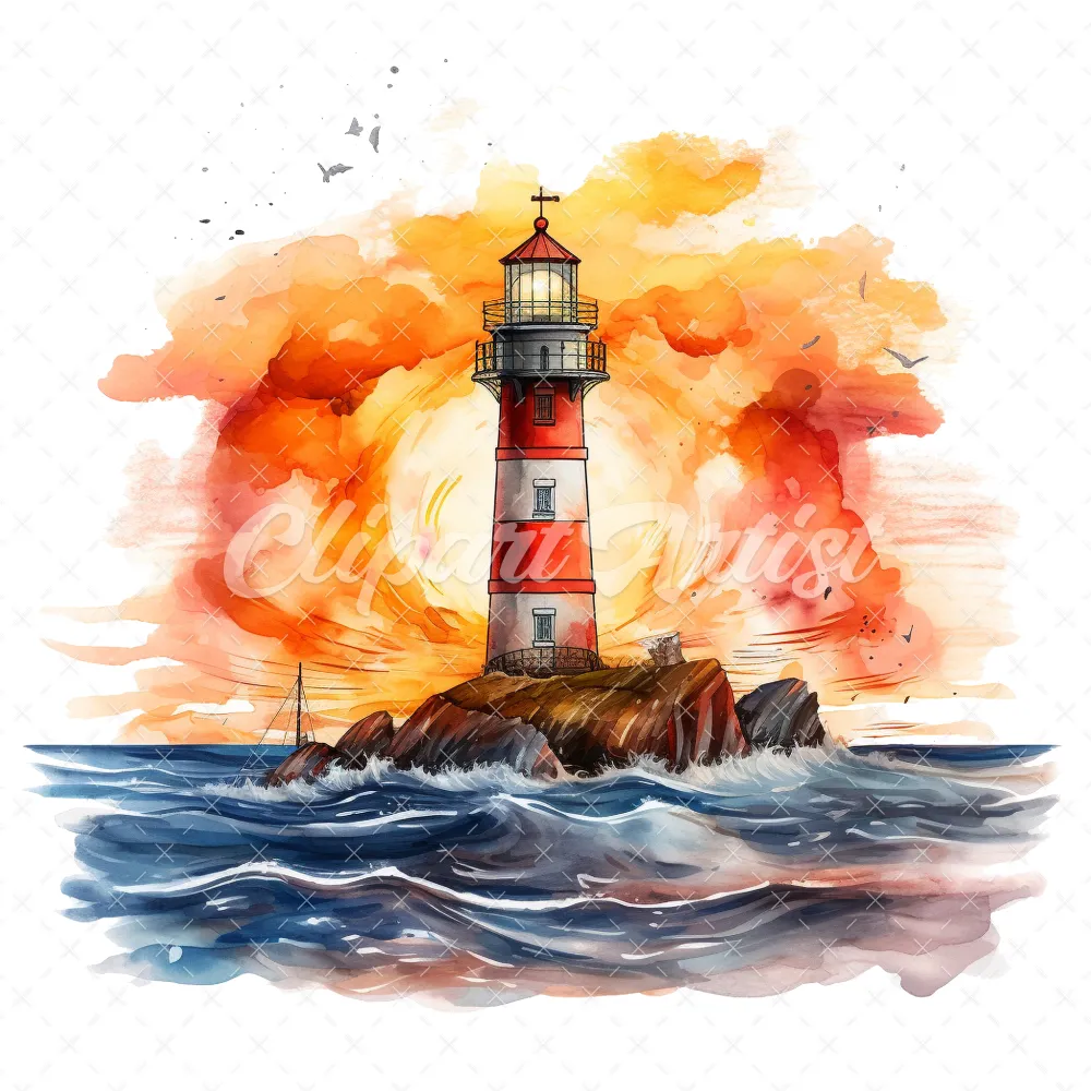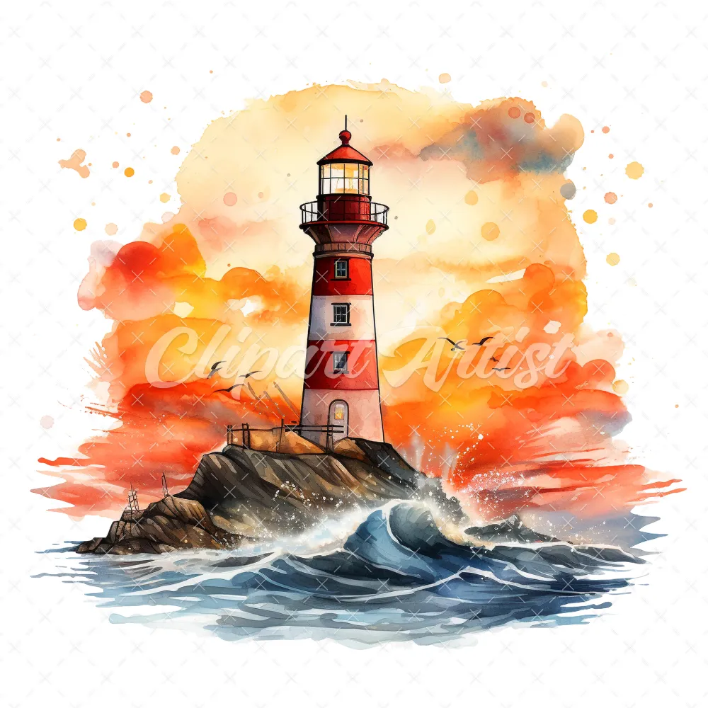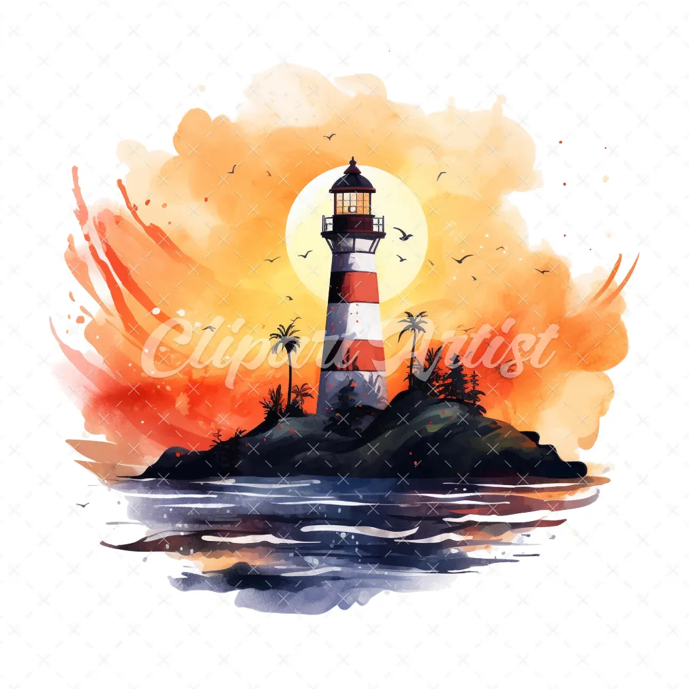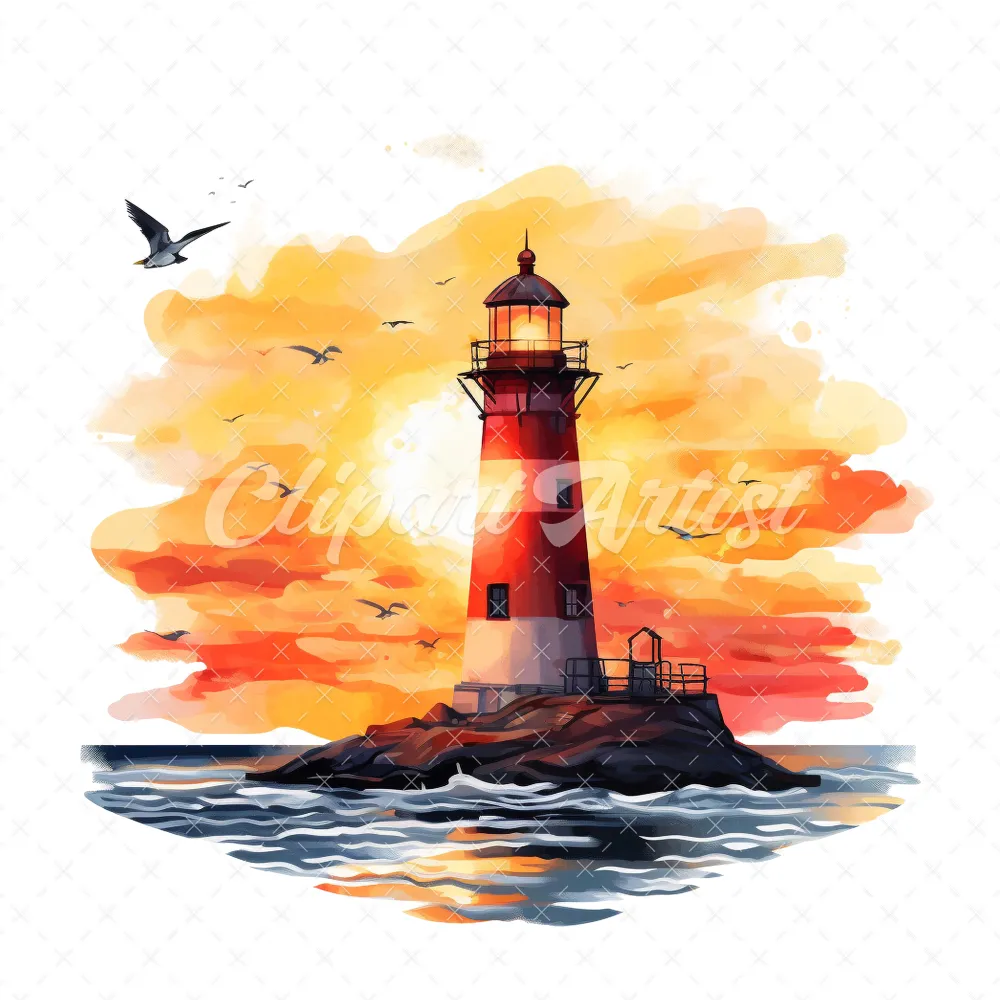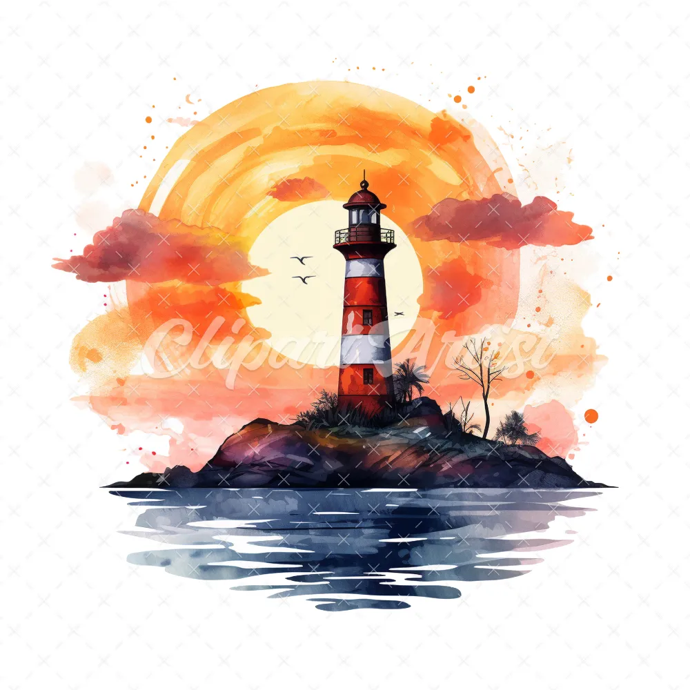 20 High-Quality Sunset Lighthouse Clipart – Sunset lighthouse digital watercolor JPG instant download for commercial use – Digital download