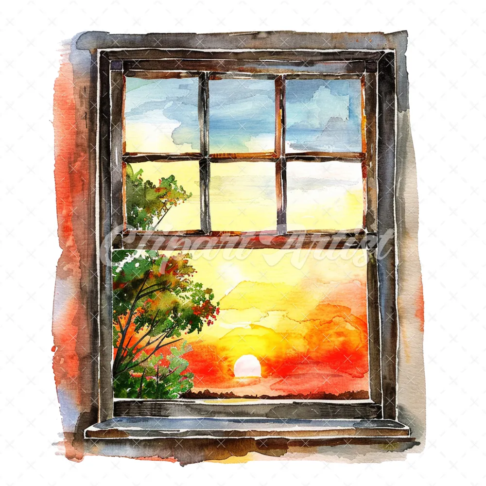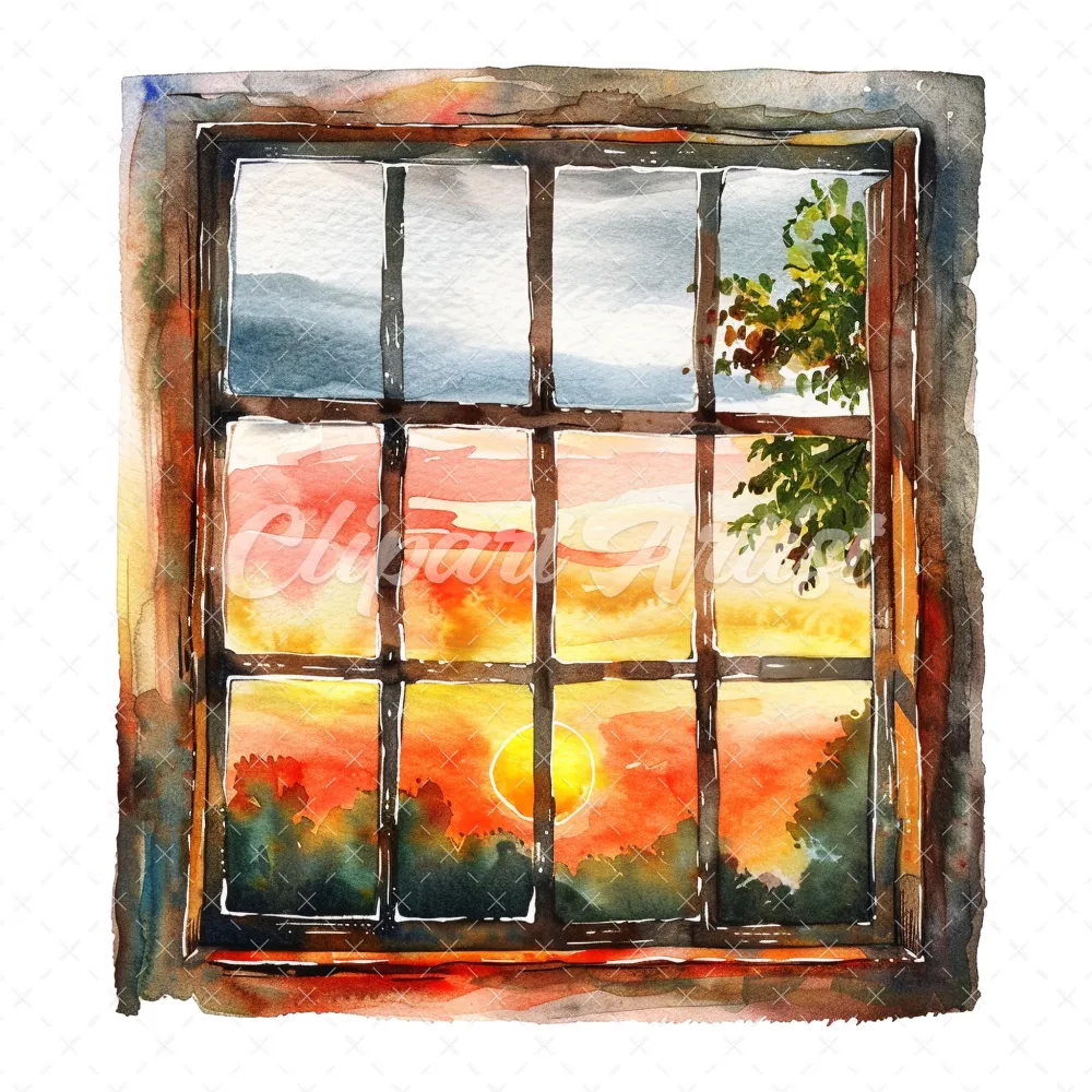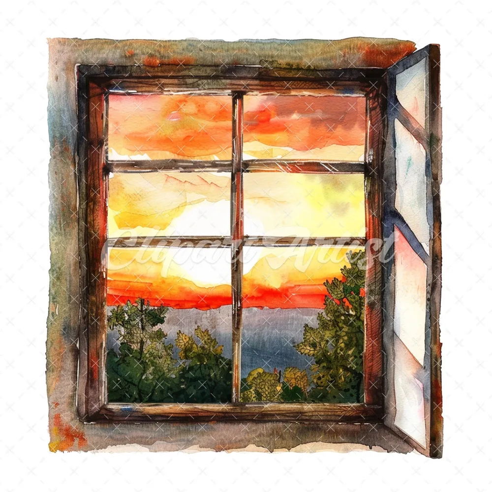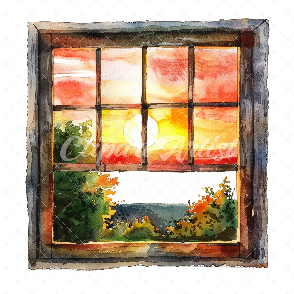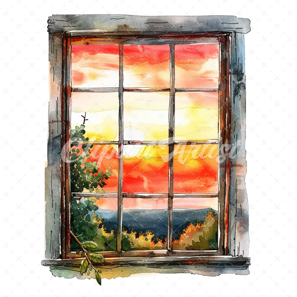 20 High-Quality Sunset Window Clipart – Sunset window digital watercolor JPG instant download for commercial use – Digital download